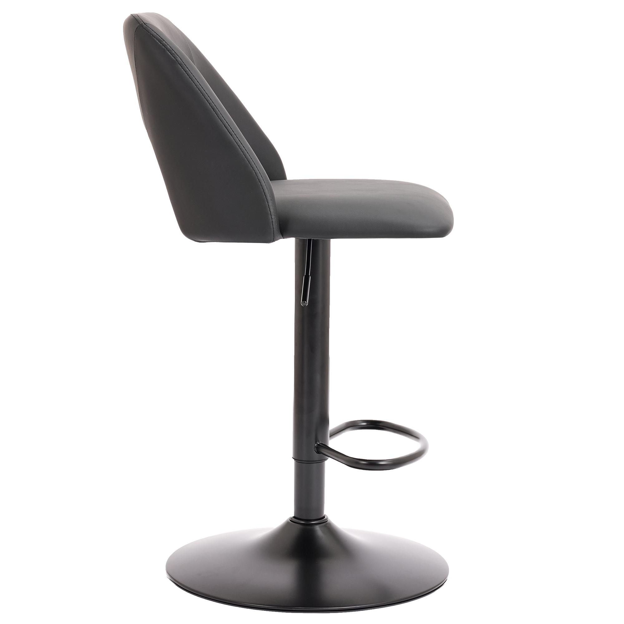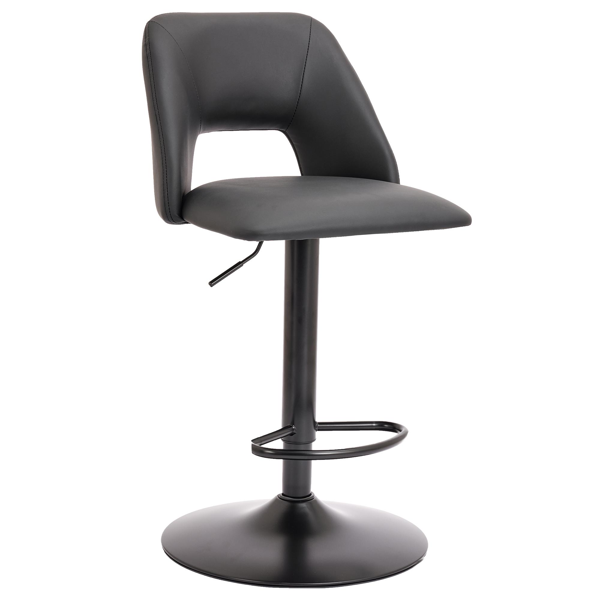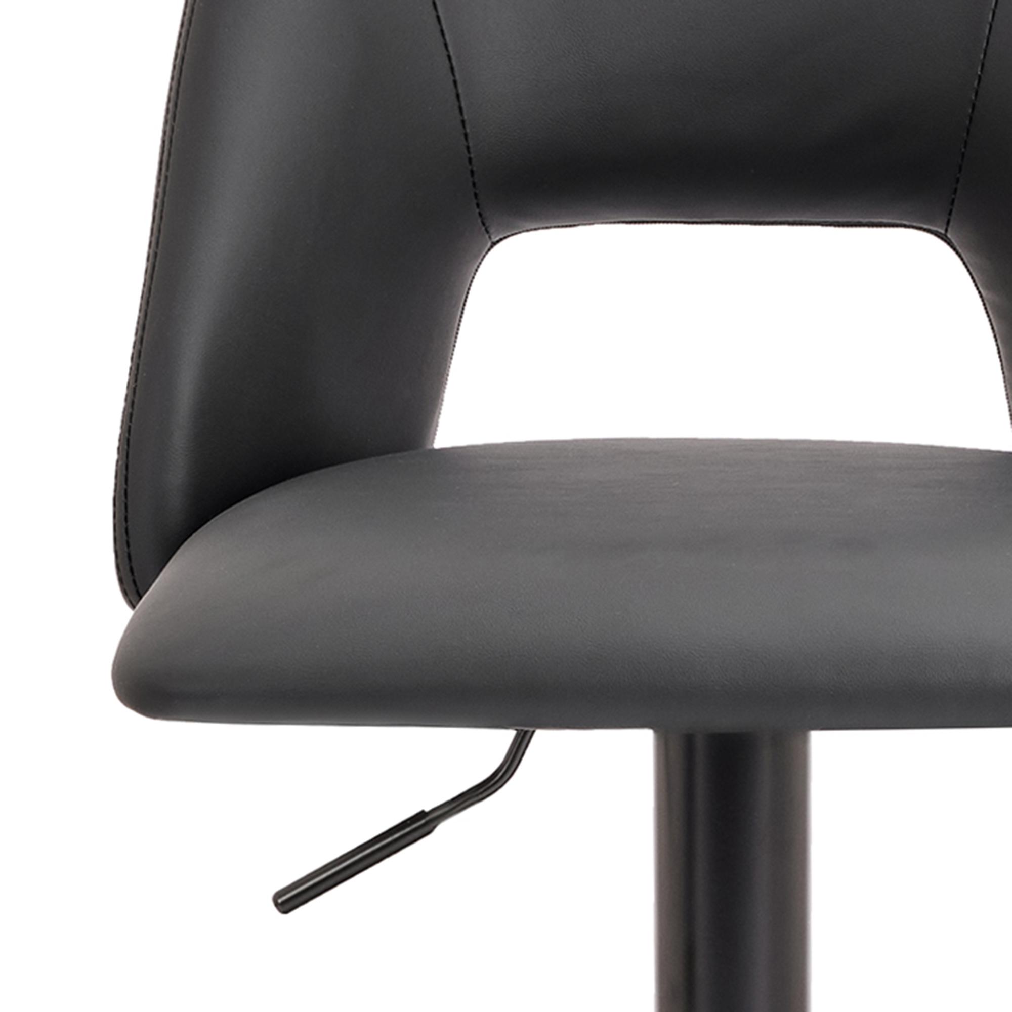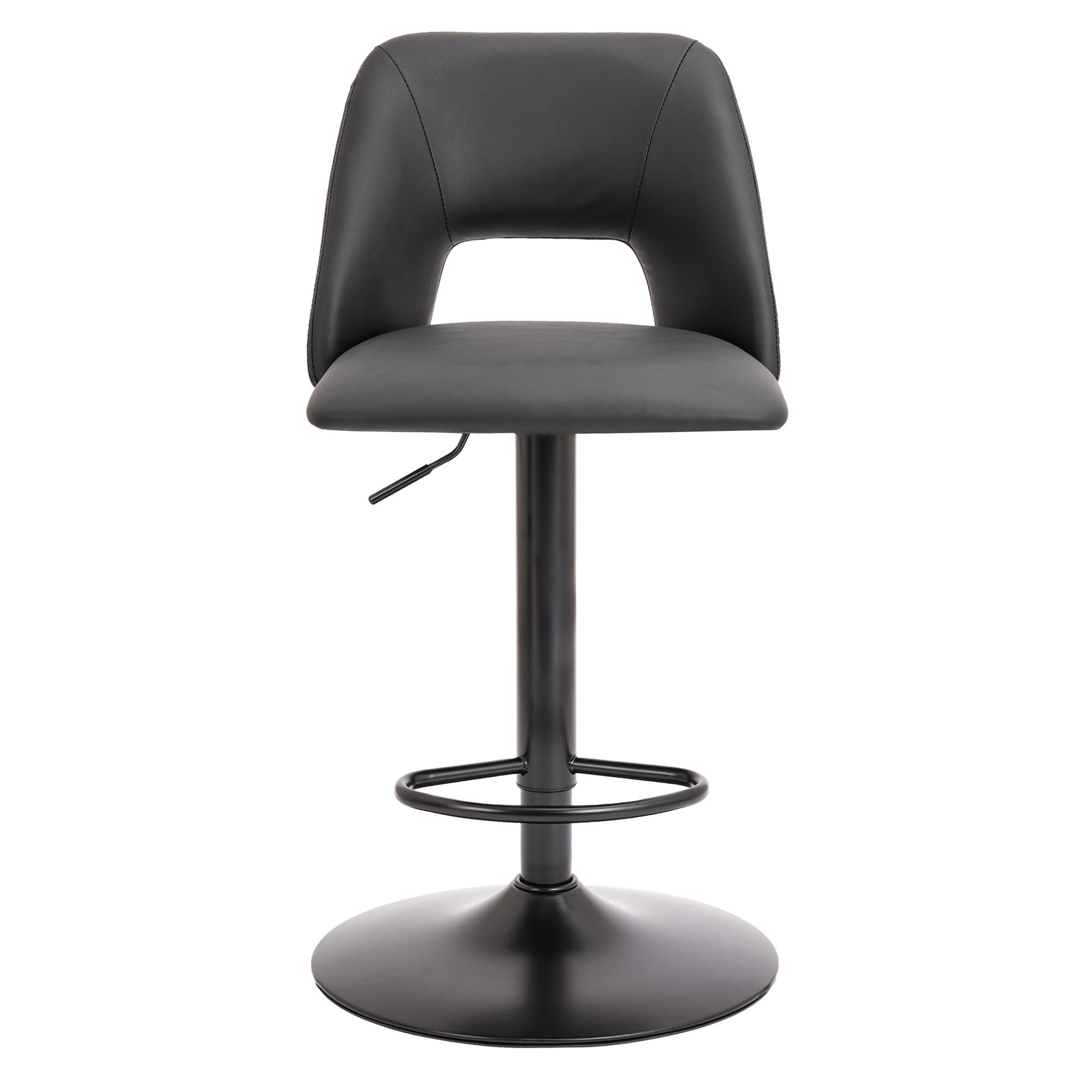 Wide, spacious seat and high-back with a cutout design – these stools are all about comfort and style! The adjustable height makes it easy to use for bar or counter heights. Easy-to-wipe faux leather upholstery and matte black post and base come together for a clean, simple look that will work in any décor space. Perfect for formal entertaining or casual, everyday kitchen seating.