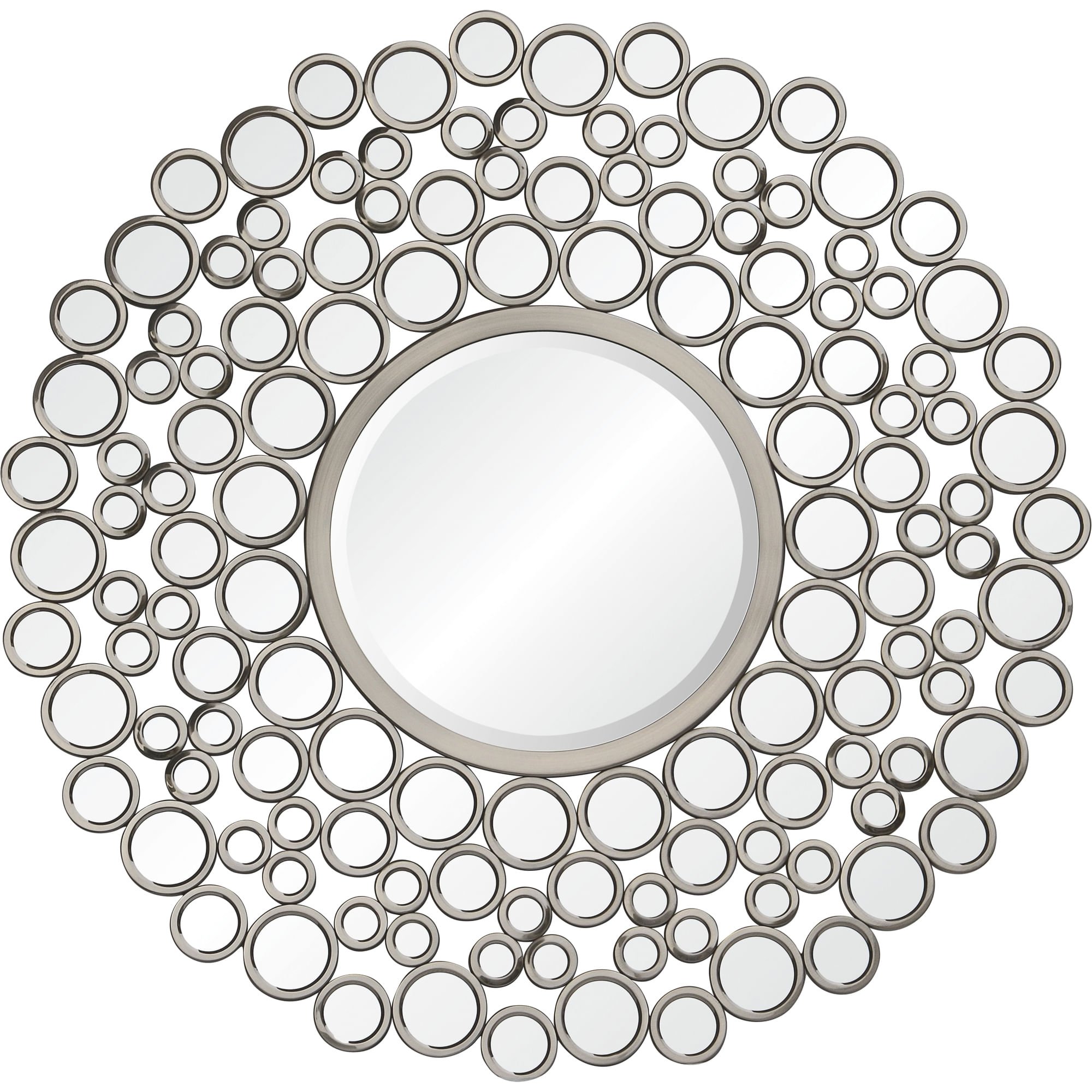 This awesome design features dozens of small mirrors and a large beveled round mirror in a satin-nickel plated metal frame. Fashionable and chic, this mirror is a great addition to your home décor!