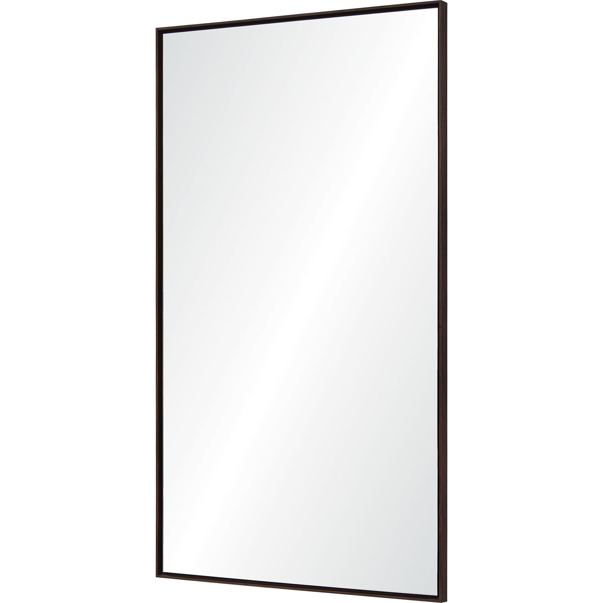 This full-length mirror brings a raw, refined approach to traditional décor. The rectangular looking glass appears to be floating at the center of the brown wood frame, inset to create a shadowbox effect. Suitable as a wall-mounted or leaner style mirror, a dark chestnut finish highlights the natural wood grain of the large-format mirror frame.