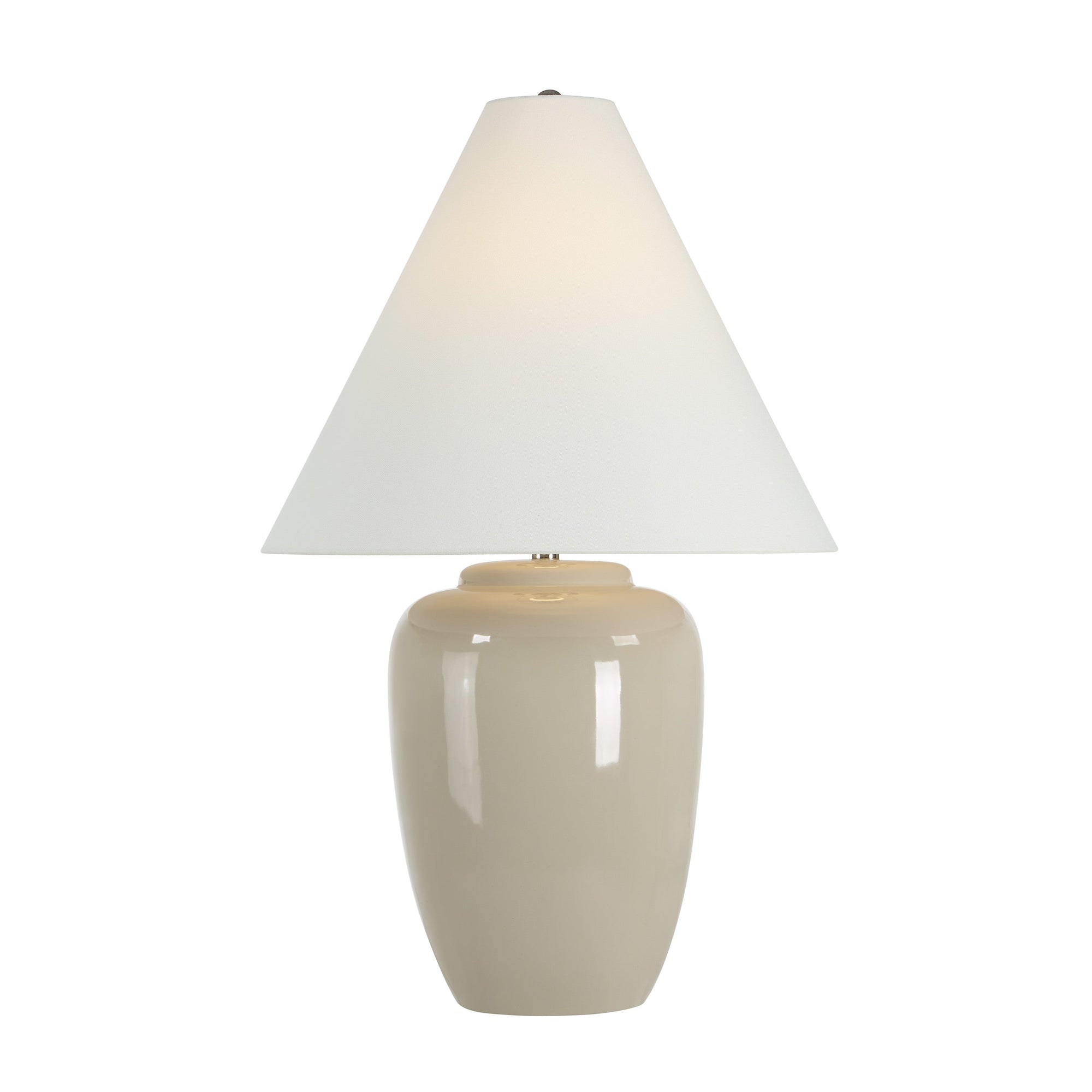 The Anne table lamp combines modern refinement with timeless style. Its smooth taupe ceramic base and polished nickel accents pair with an off-white linen shade that casts a soft, inviting glow. With a dimmable switch for personalized ambiance, it brings warmth, balance, and understated elegance to any room or neutral decorating scheme.