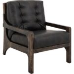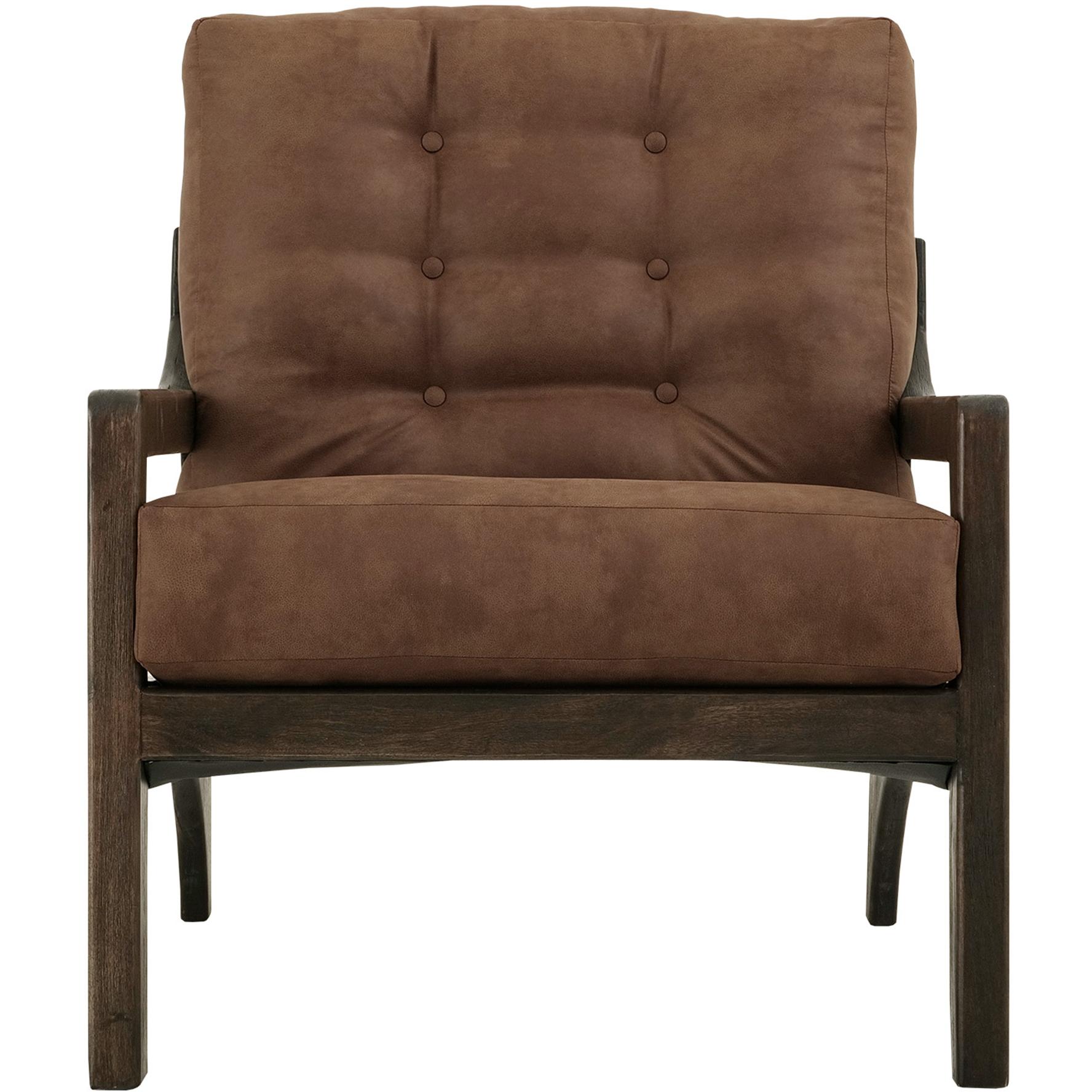 The Balam armchair features a wooden frame with a dark finish, offering a blend of modern style and timeless charm. The seat and backrest are upholstered in brown faux leather, accented with elegant button tufting for added sophistication. With its thick cushioning and sturdy structure, this armchair combines comfort and durability. Its refined design is perfect for lounging in style.