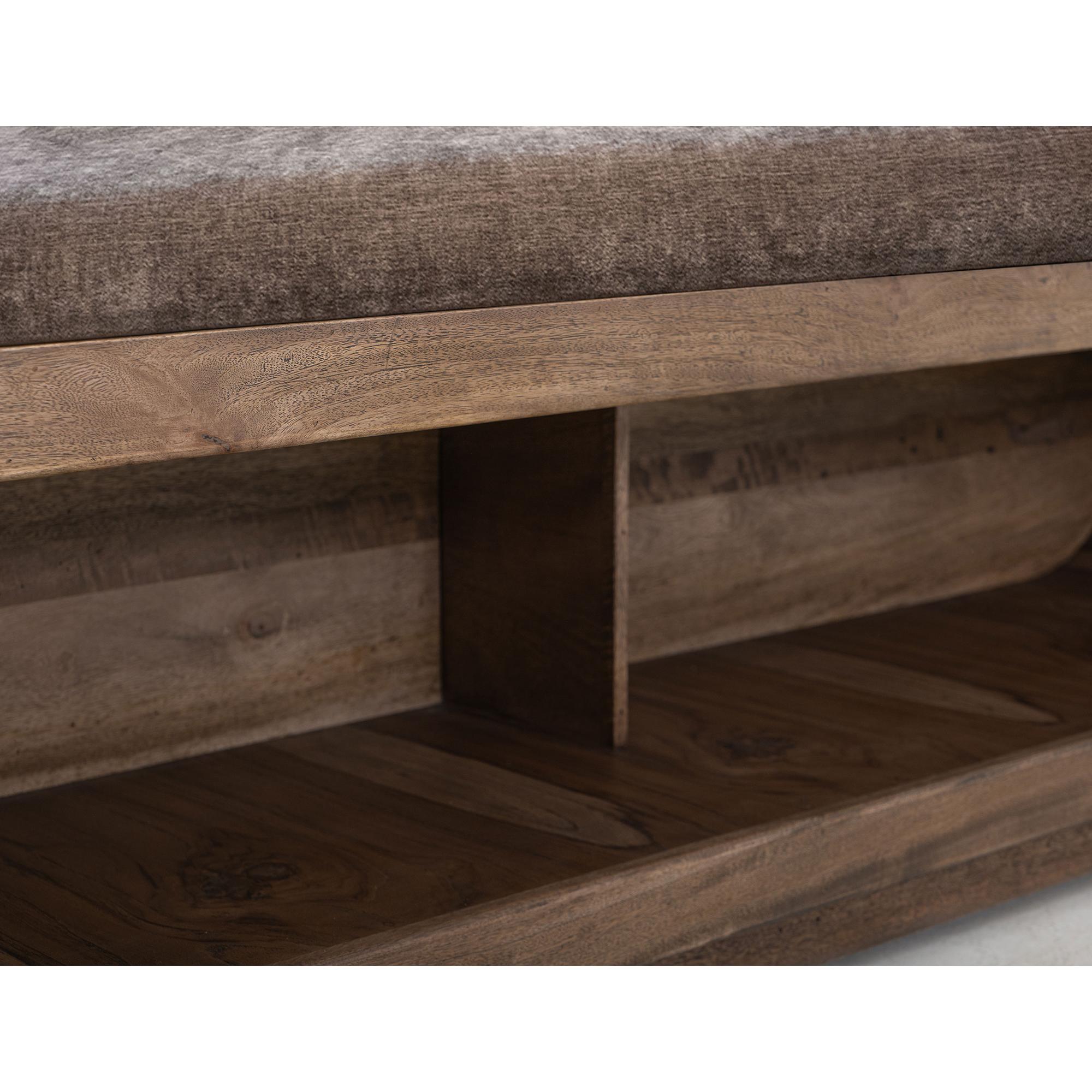 The Balam bench is a beautifully crafted piece made from sustainable mango and engineered teak wood. Its elegant design blends organic warmth with modern sophistication, making it a perfect addition to any space. The bench features a comfortable brown cushioned seat with gently rounded corners and an open storage compartment for books, blankets, or decorative items. Ideal for an entryway, bedroom, or reading nook, the Balam bench adds effortless charm to any setting.