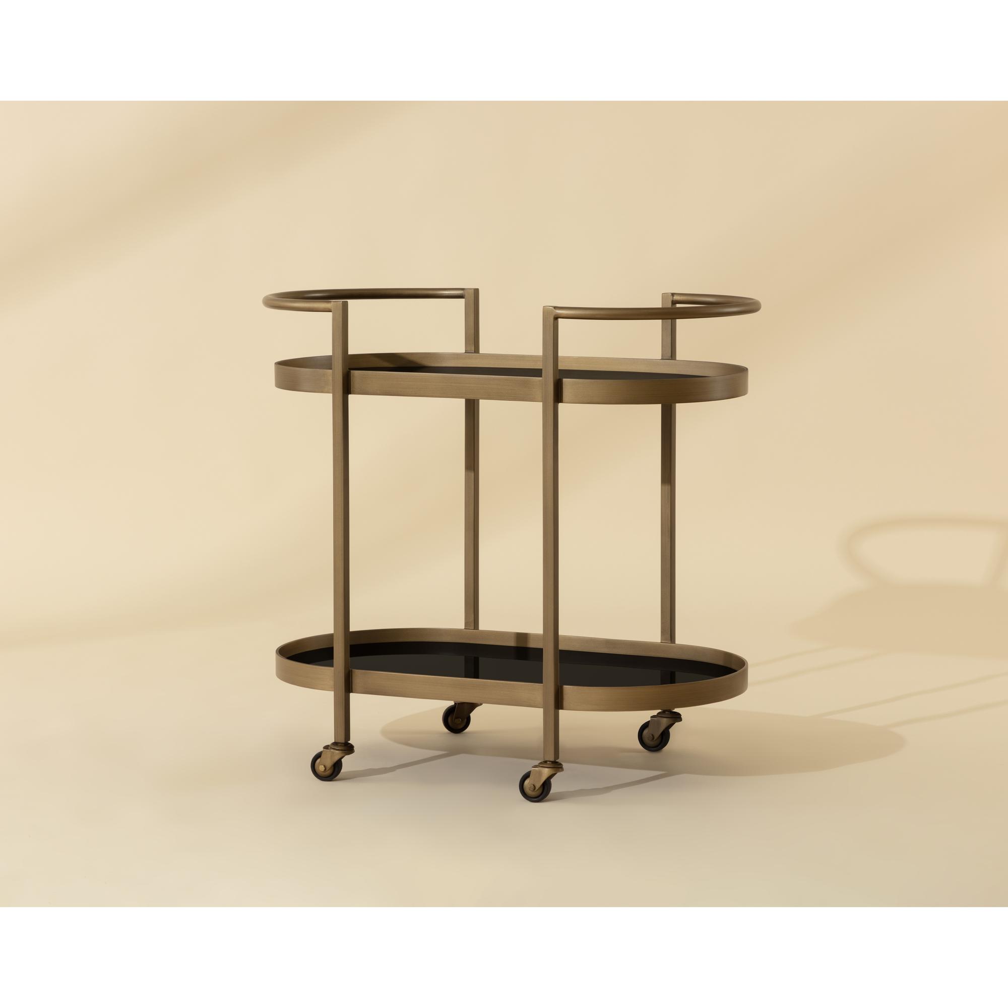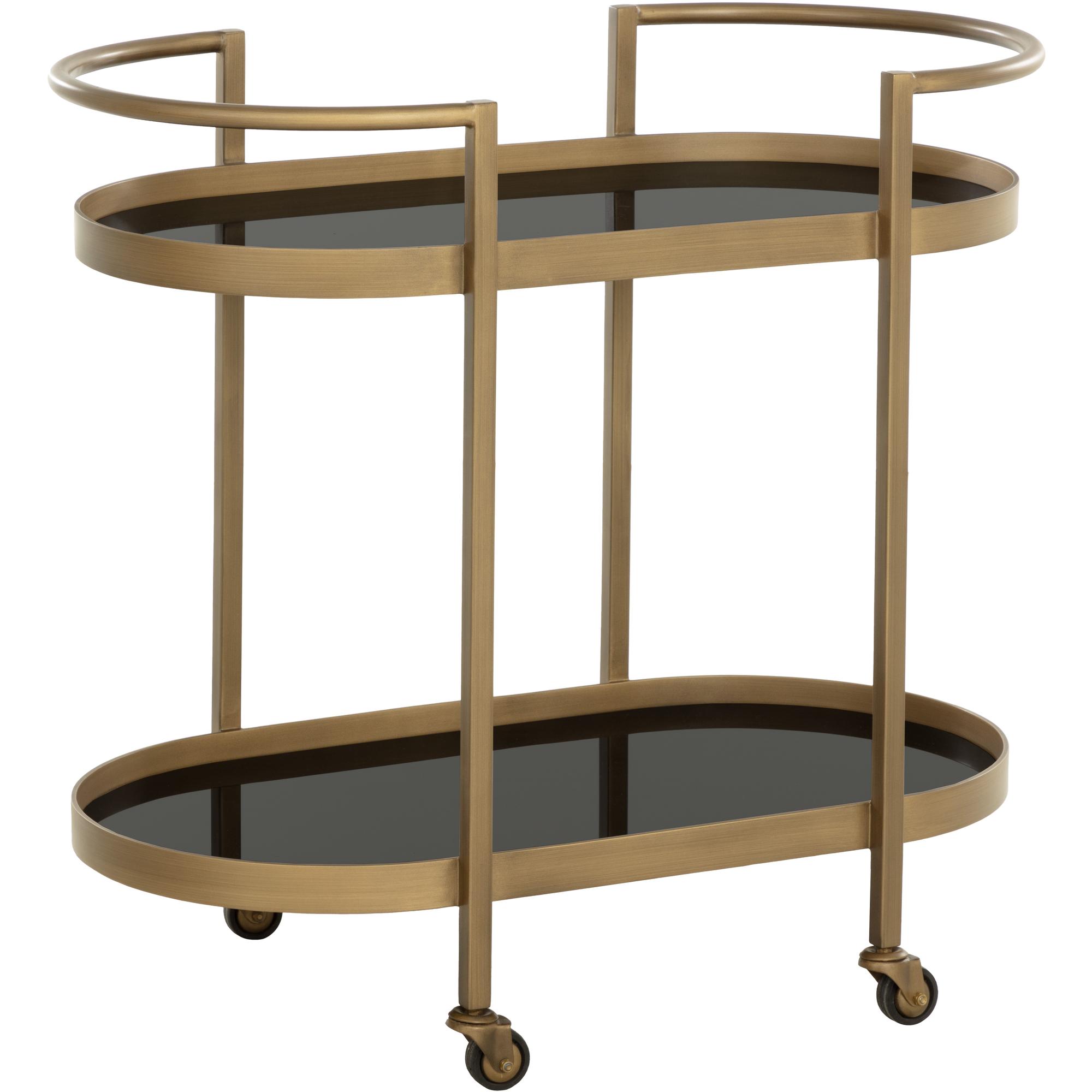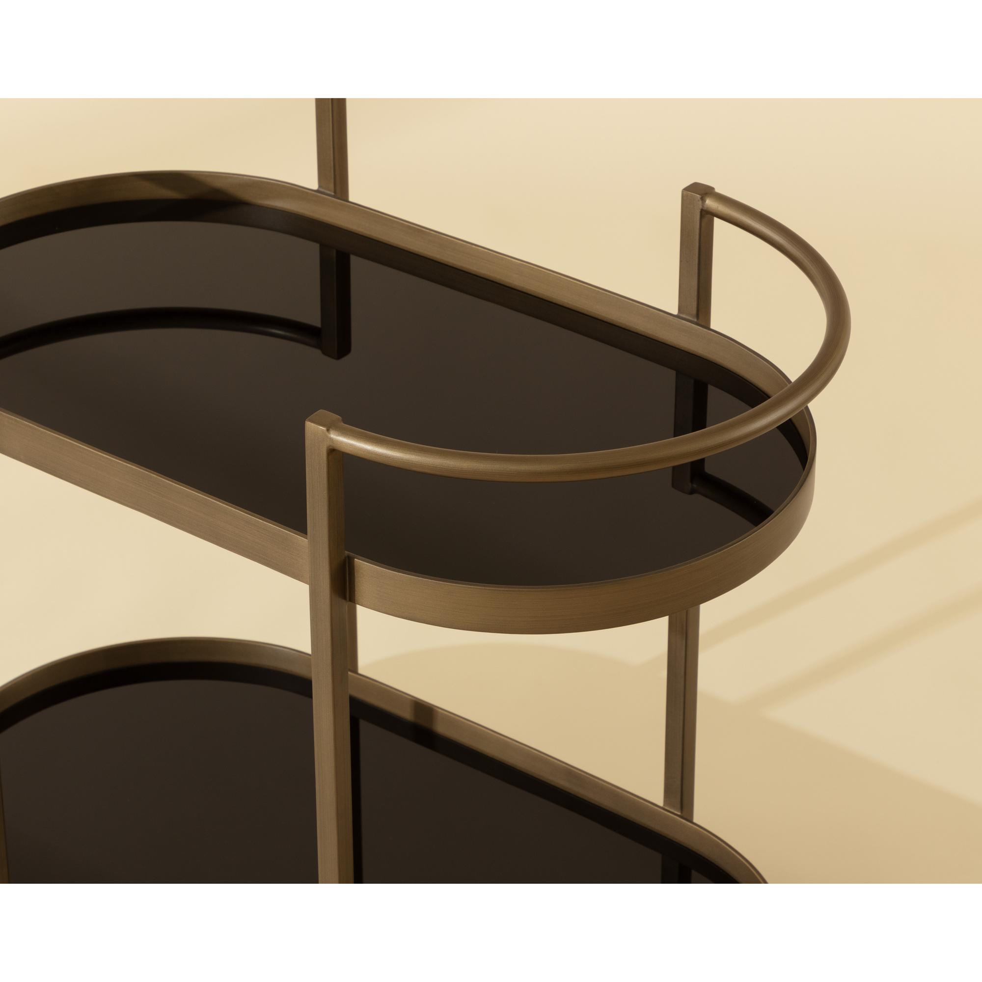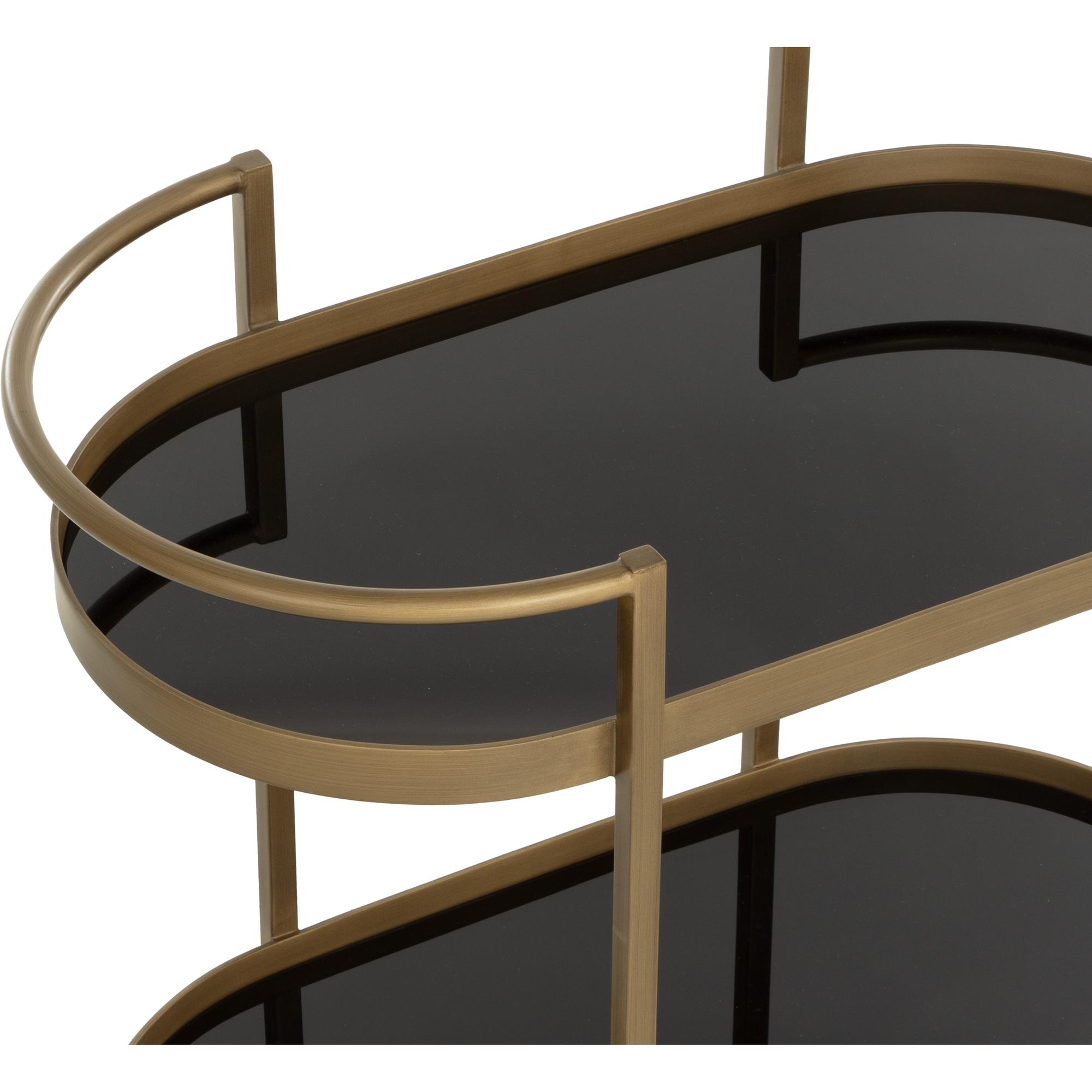 The Bartlett Bar Cart brings a glamorous addition to any dining space. Black mirrored shelves beautifully complement the antique brass frame for a classic look.