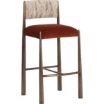 The Bayard Barstool pairs textural contrast with clean geometry. The tactile weave of terri nutmeg fabric on the backrest complements the smooth meg rust fabric on the wood seat frame. The two-tone upholstery, along with its elegant dark bronze metal legs, create visual interest that elevates any space.