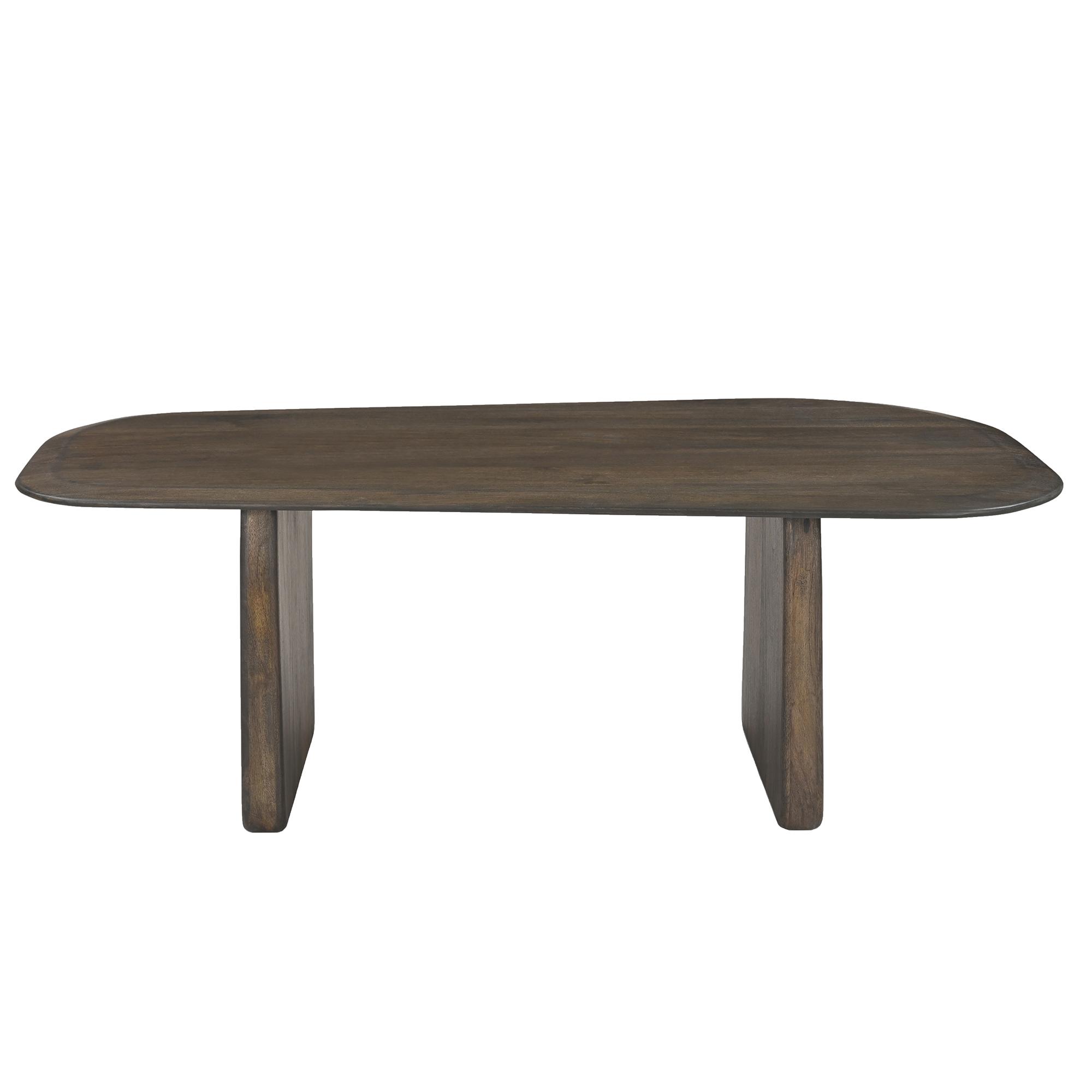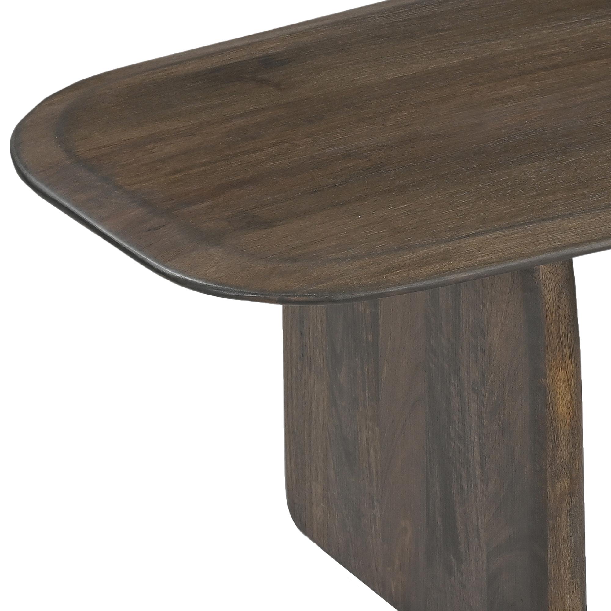This gorgeous and sophisticated table is meticulously crafted from sustainably-sourced, solid mango wood. The organic shape of the table top and rounded-edge panel legs allows for some geometric variation, further bringing this table to life, and making sure that no two pieces will be the same.