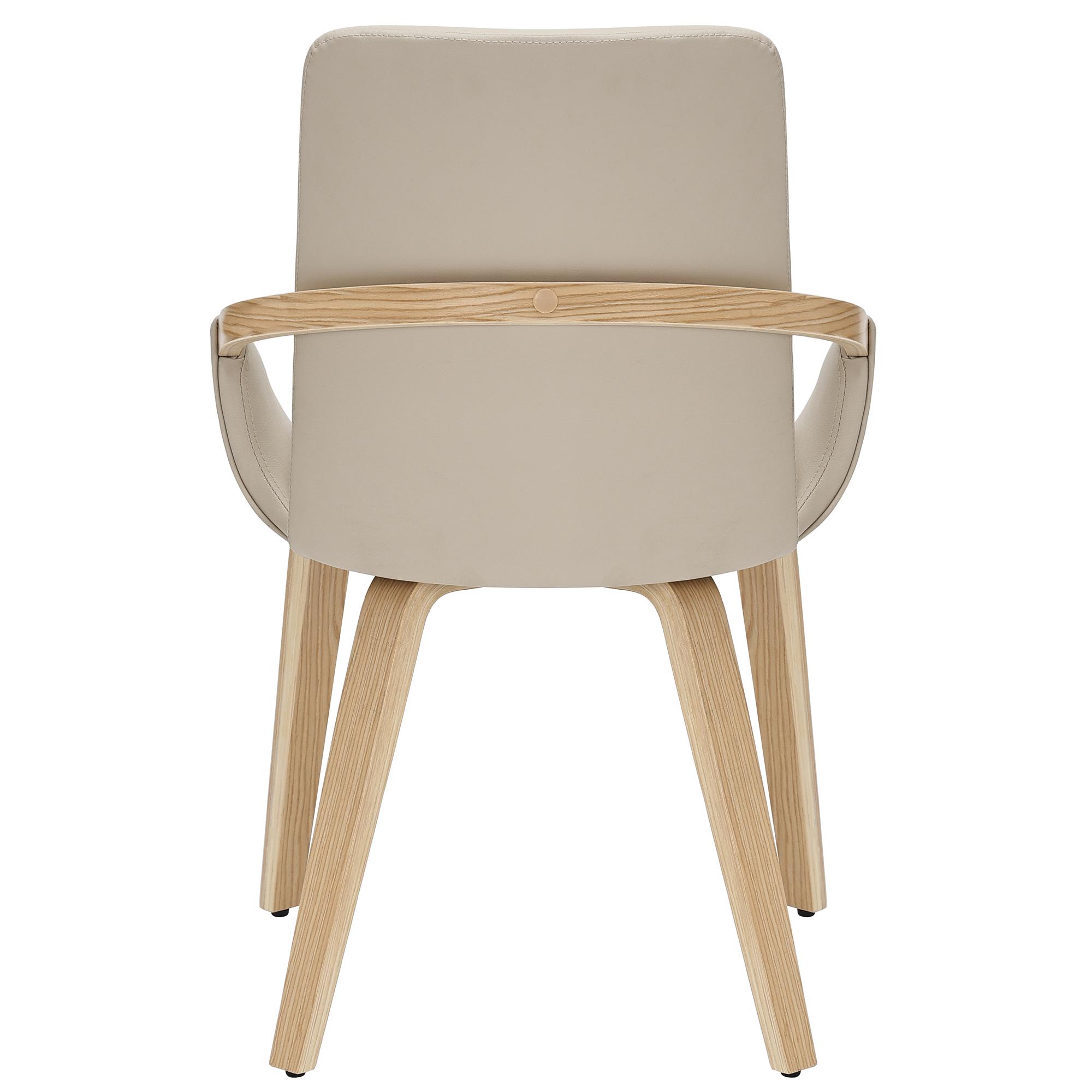 - Sand-toned faux leather upholstery with stitching details on seat cushion