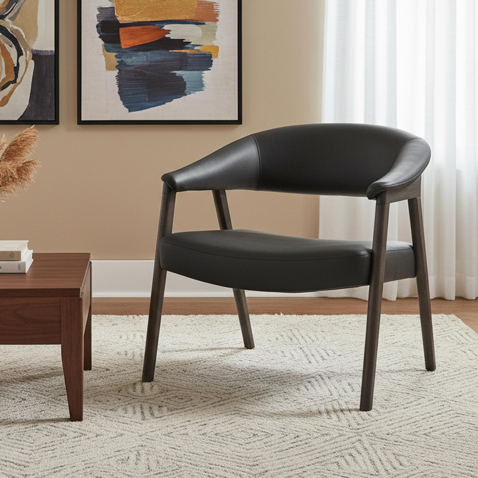 The rich combination of black faux leather and brushed dark walnut frame is irresistible on this armchair. Sturdy, curved back and seat with foam, web and springs means this chair is built for those long, comfortable conversations with friends, or afternoons reading. Use in a formal living space or a comfortable corner chair in the bedroom.