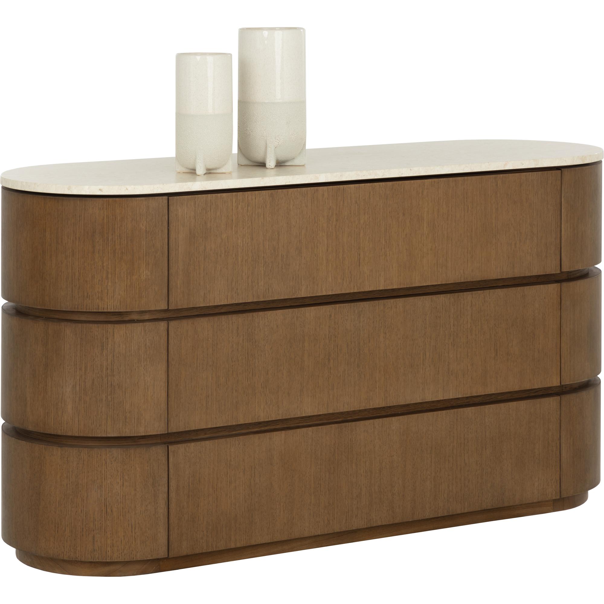 The Caldora Dresser draws the eye with its sculptural form and refined craftsmanship. Its curved oak-veneer frame is fitted with six soft-closing drawers that blend seamlessly into the form, creating a sense of continuity from every angle. A polished marble top anchors the piece, bringing a striking mix of tone and texture.