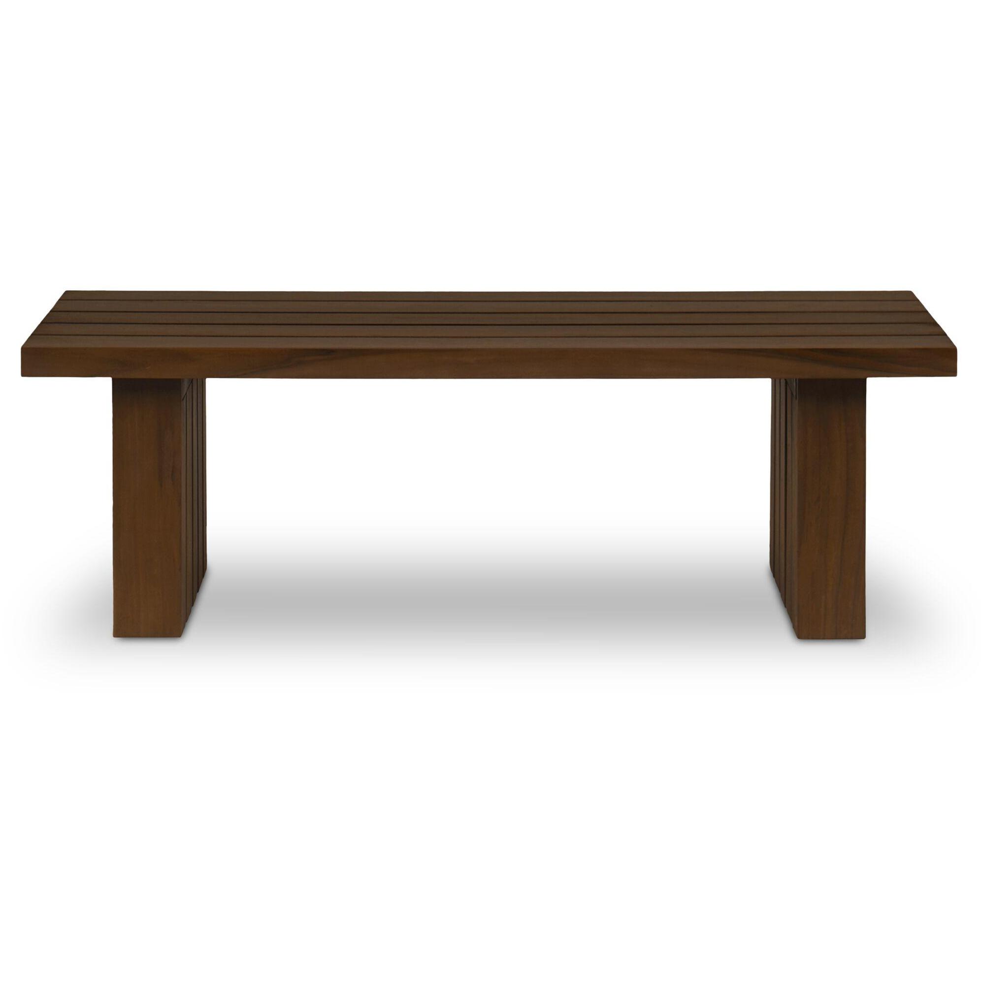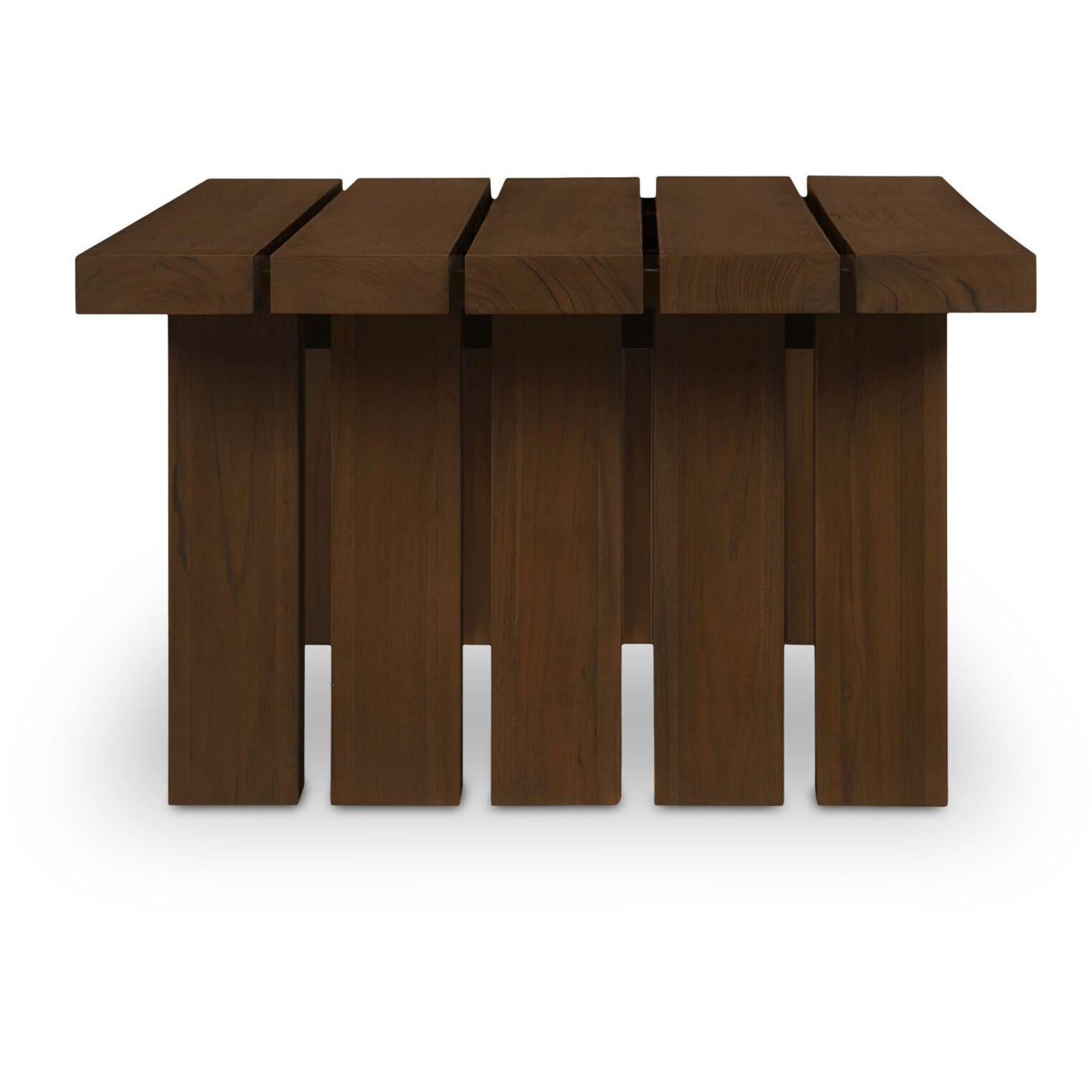 Lightweight look, laid-back feel. Denby keeps things lifted with an open frame and laid-back feel. A slatted teak top lets light and air move through, while square post legs ground the silhouette. Finished in a warm, toasted tone, it adds natural texture to any setup. Simple, solid, and built to live easy—indoors or out.