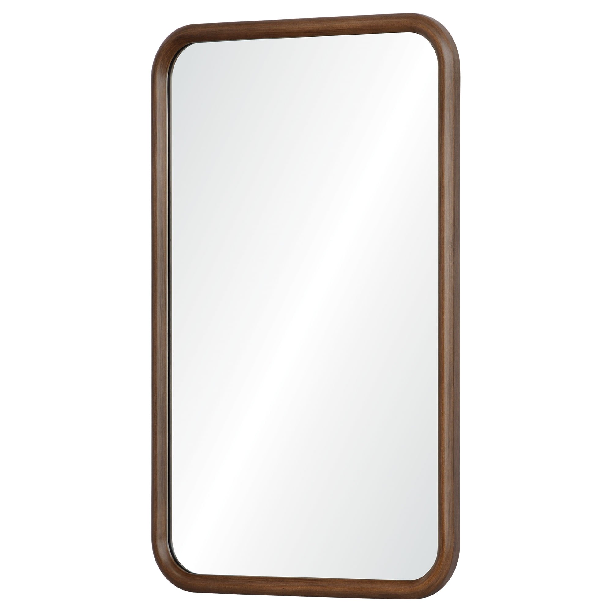 The simple styling of this decorative wall mirror adds an element of industrial décor to classic and contemporary rooms. The natural wood frame incorporates eclectic design details with a rounded pipeline shape and curved corners that soften the rectangular looking glass. A warm walnut brown finish complements the mirror’s humble profile with a neutral color palette that’s lived-in and luxe.