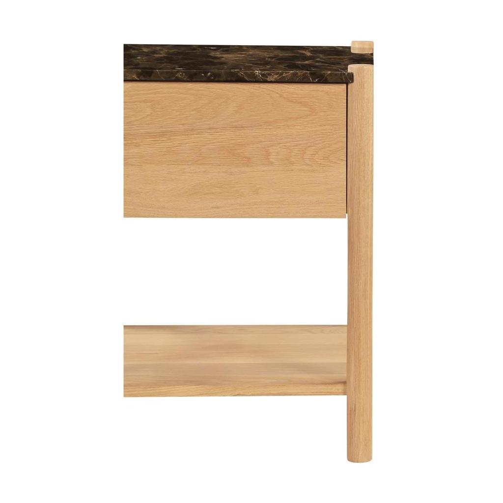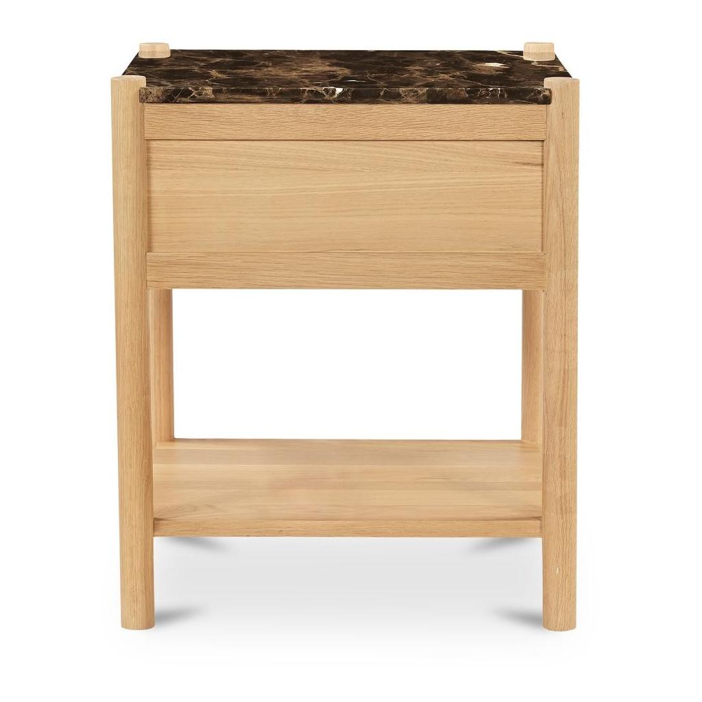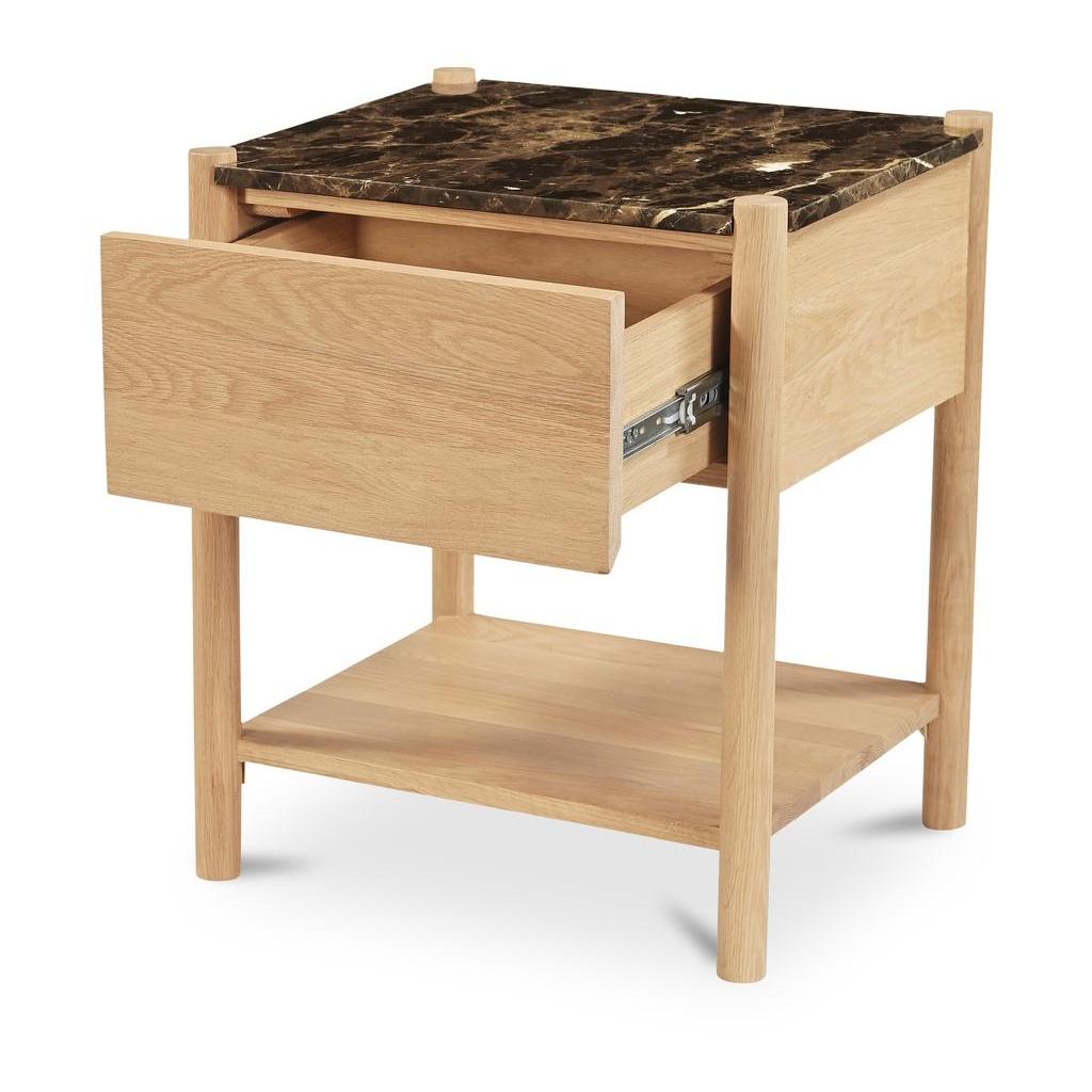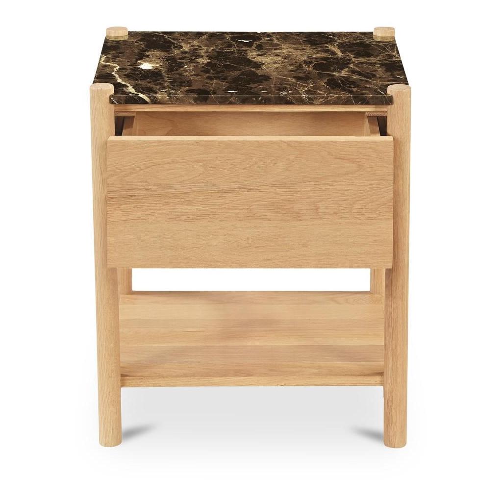 The Elio nightstand embraces the allure of mixed materials with its transitional design. The rich tones of dark Emperador marble harmoniously blend with the natural warmth of oak, creating a piece of understated luxury. A marble top, oak shelf, and soft-close drawer offer both style and functionality. Distinctive post cutouts on the top add visual interest, while unique marble veining ensures each piece is one-of-a-kind.