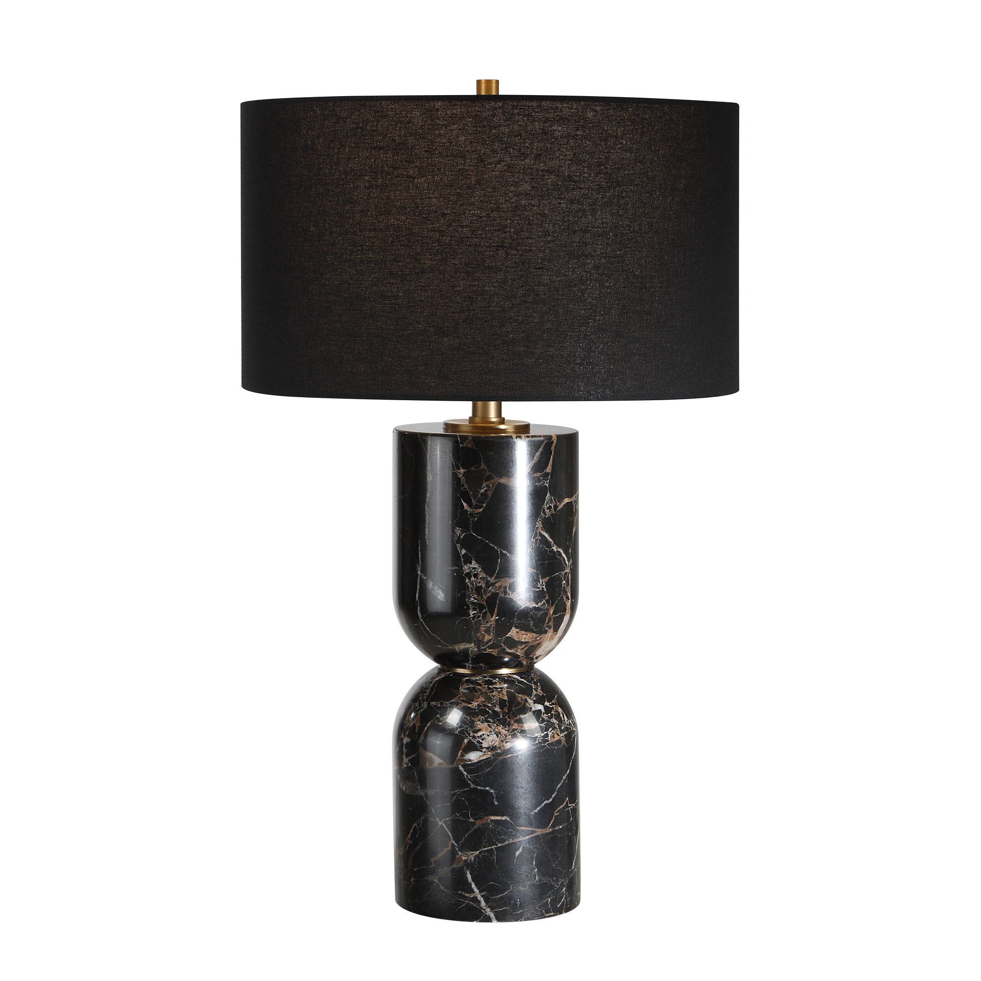 The Enri table lamp blends modern glam with sculptural elegance. Its sleek black marble base and antique brass accents team up with a black linen drum shade for a dramatic yet refined look. With a rotary dimmer for customizable light, it’s the perfect statement piece for contemporary or transitional interiors.