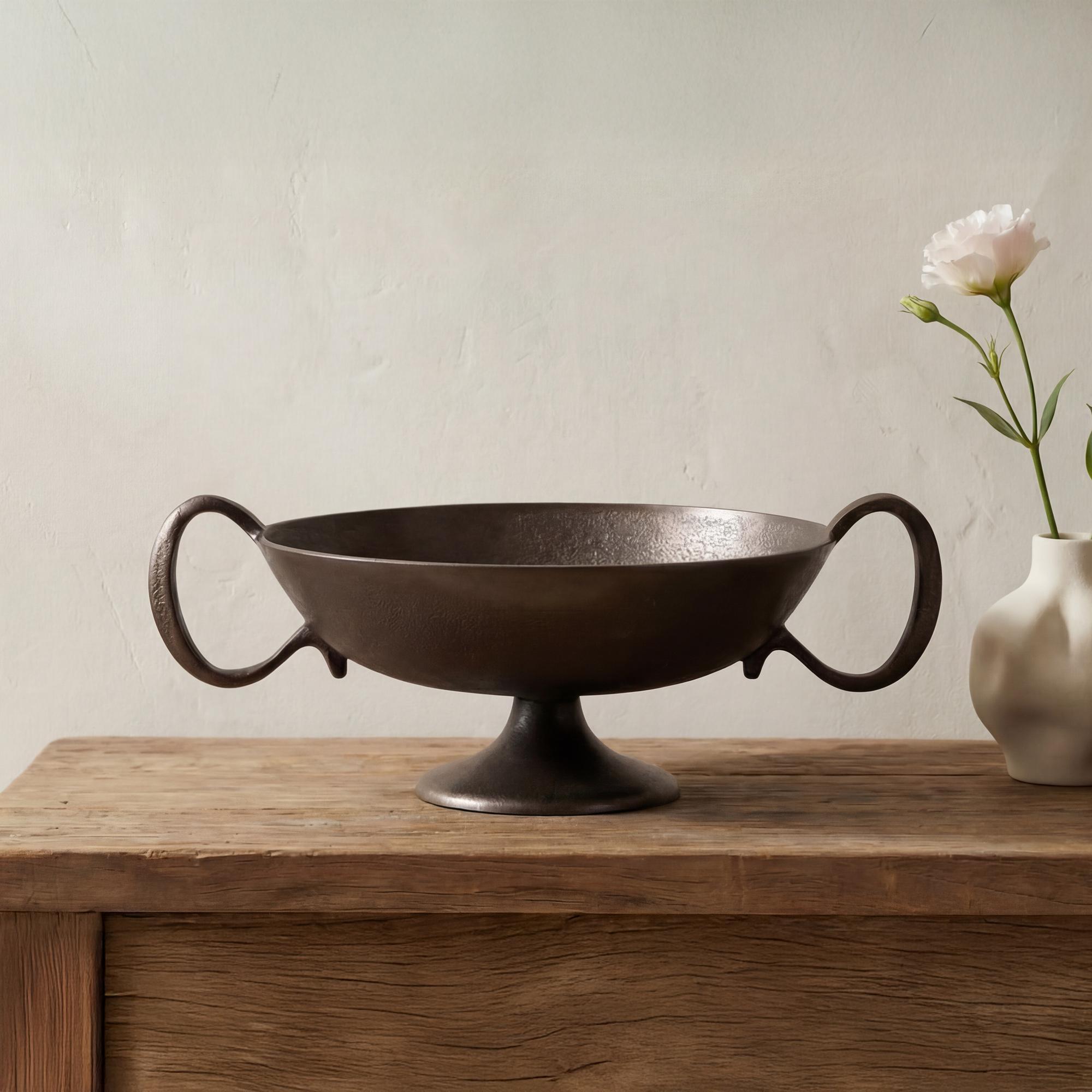 Heritage gets a refresh. Made from hand-poured cast aluminum, Floris’ textured finish nods to timeworn relics, while graceful curvilinear handles add a sculptural, Art Deco-inspired twist. The result is part bowl, part centerpiece—ornamental enough to display proudly, functional enough to put to work. Whether styled solo or layered into a vignette, it holds space with quiet confidence.