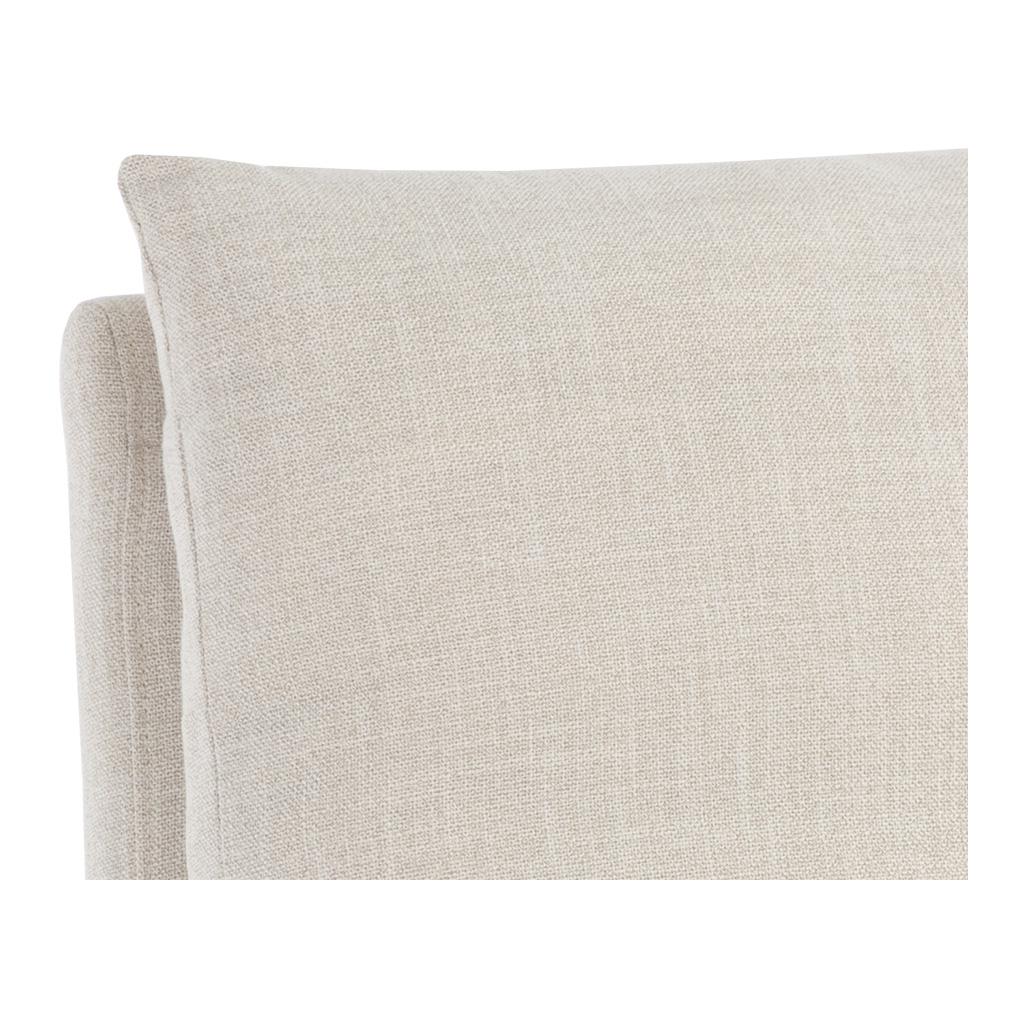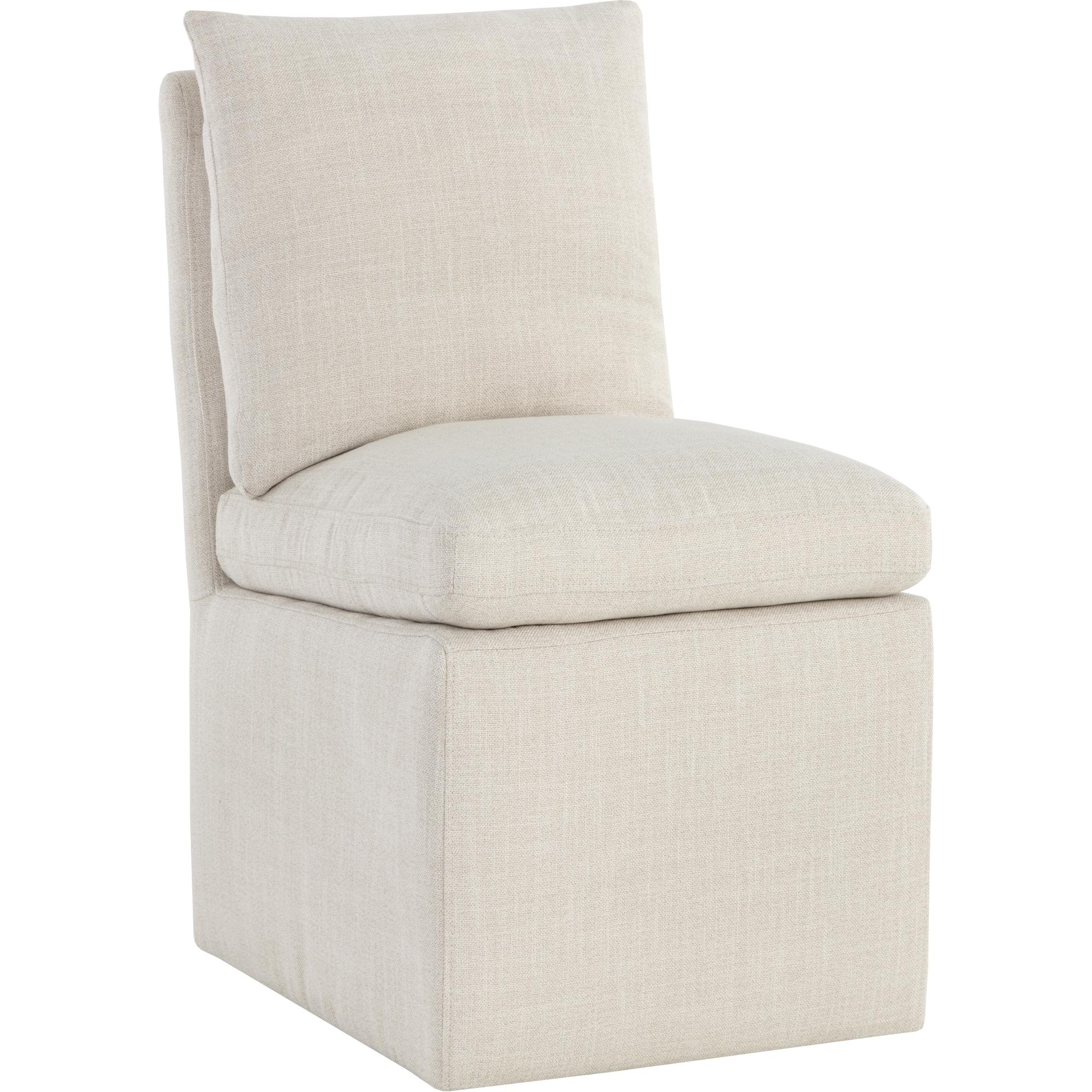 A formal and comfortable wheeled dining chair that is full of classic appeal. Stocked in effie linen fabric. As this piece features feather-filled cushions, occasional rotation and fluffing is required to maintain its lasting comfort and beauty. Visit our Product Care page for more information.