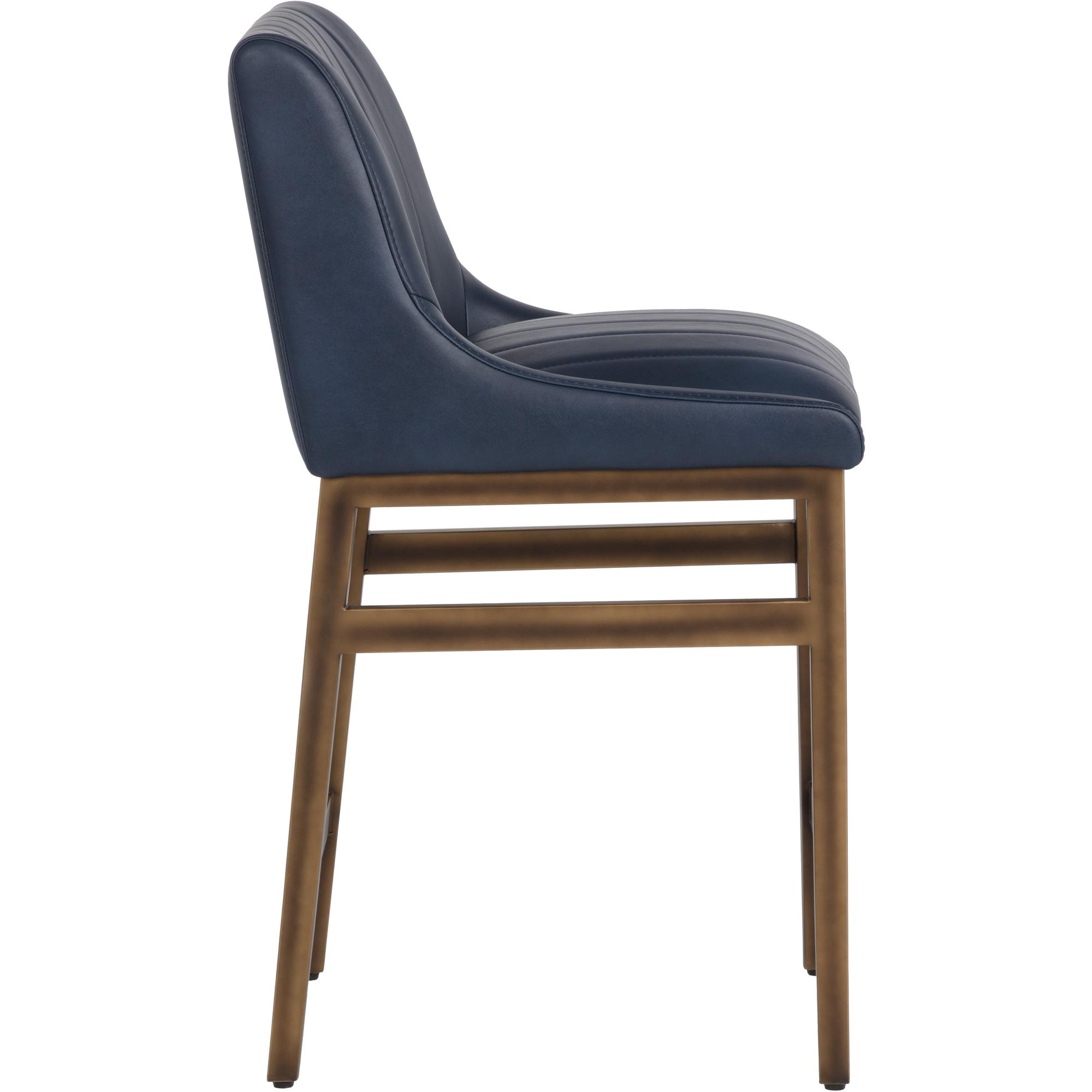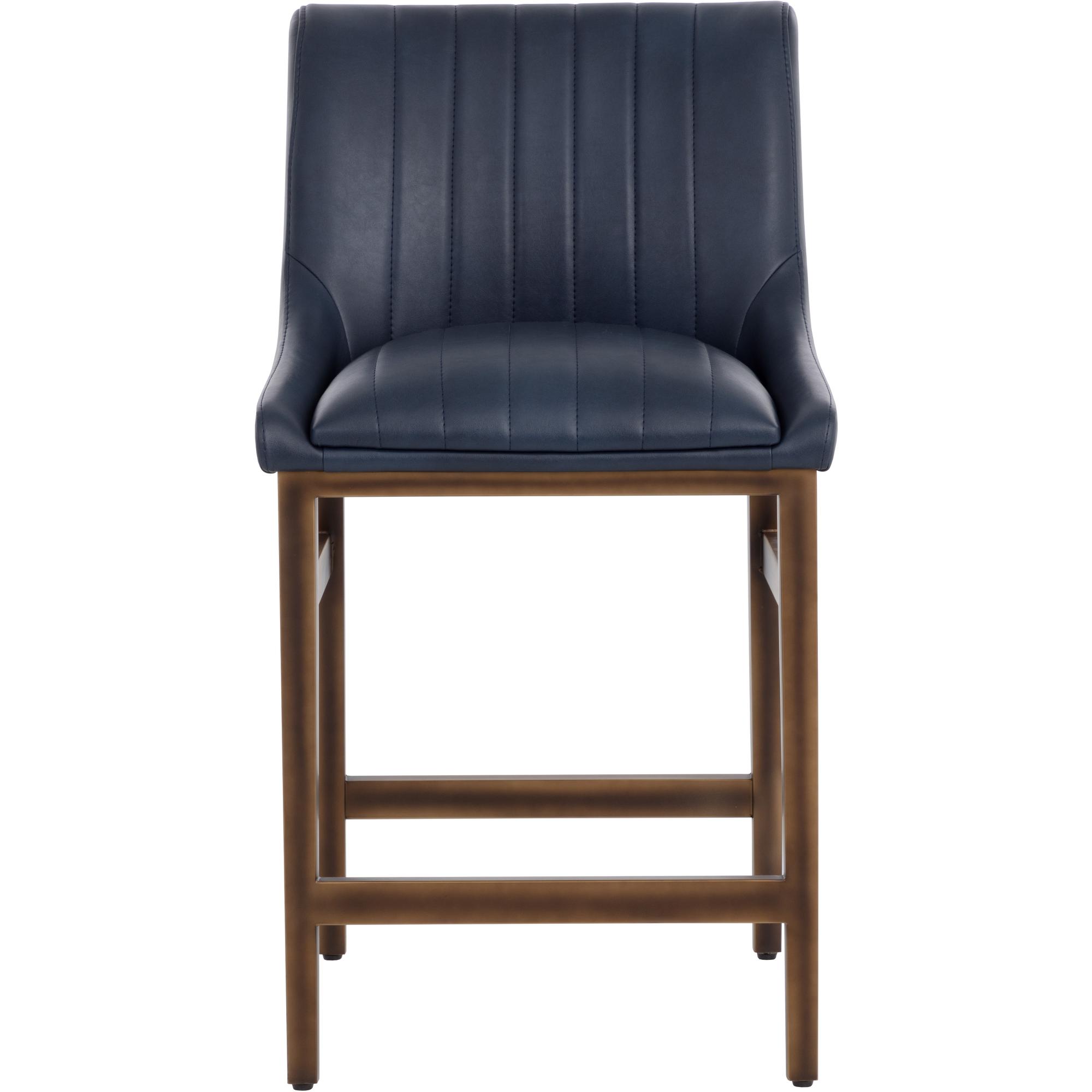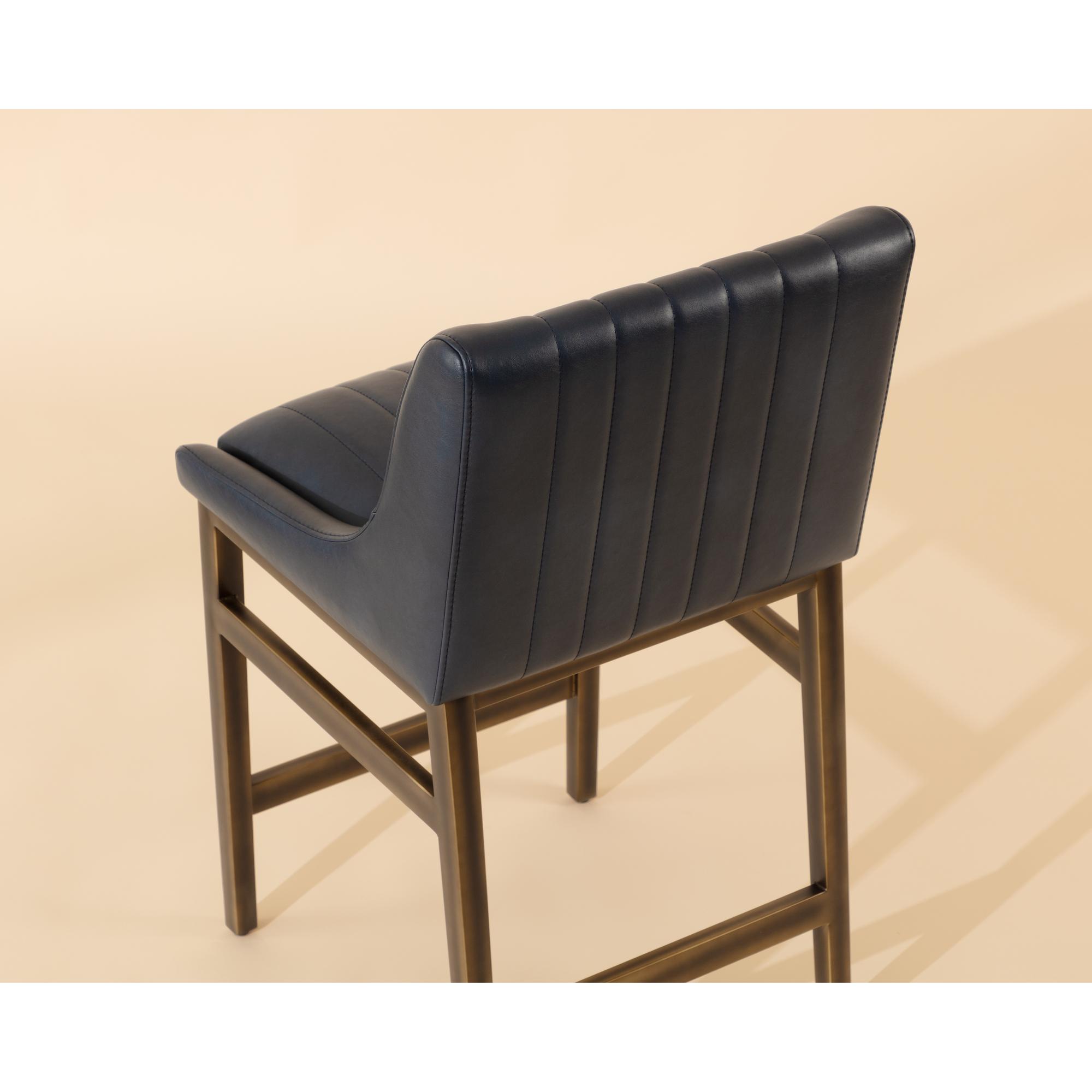 An urban designed stool featuring bold vertical channel tufting on the seat and back in bravo admiral faux leather. Finished with a rustic bronze steel frame and stretchers. Great for residential and commercial placements. Suitable for various dining, kitchen and bar spaces of all sizes. Handle With Care: This design has been crafted with faux leather. Faux leather is manufactured to reflect the natural characteristics of leather; as such, colour variations, markings, wrinkles, grooves, and light scratches are appreciated characteristics. No two pieces will be alike. Visit our Product Care page for more information on how to ensure the lasting beauty of this piece.