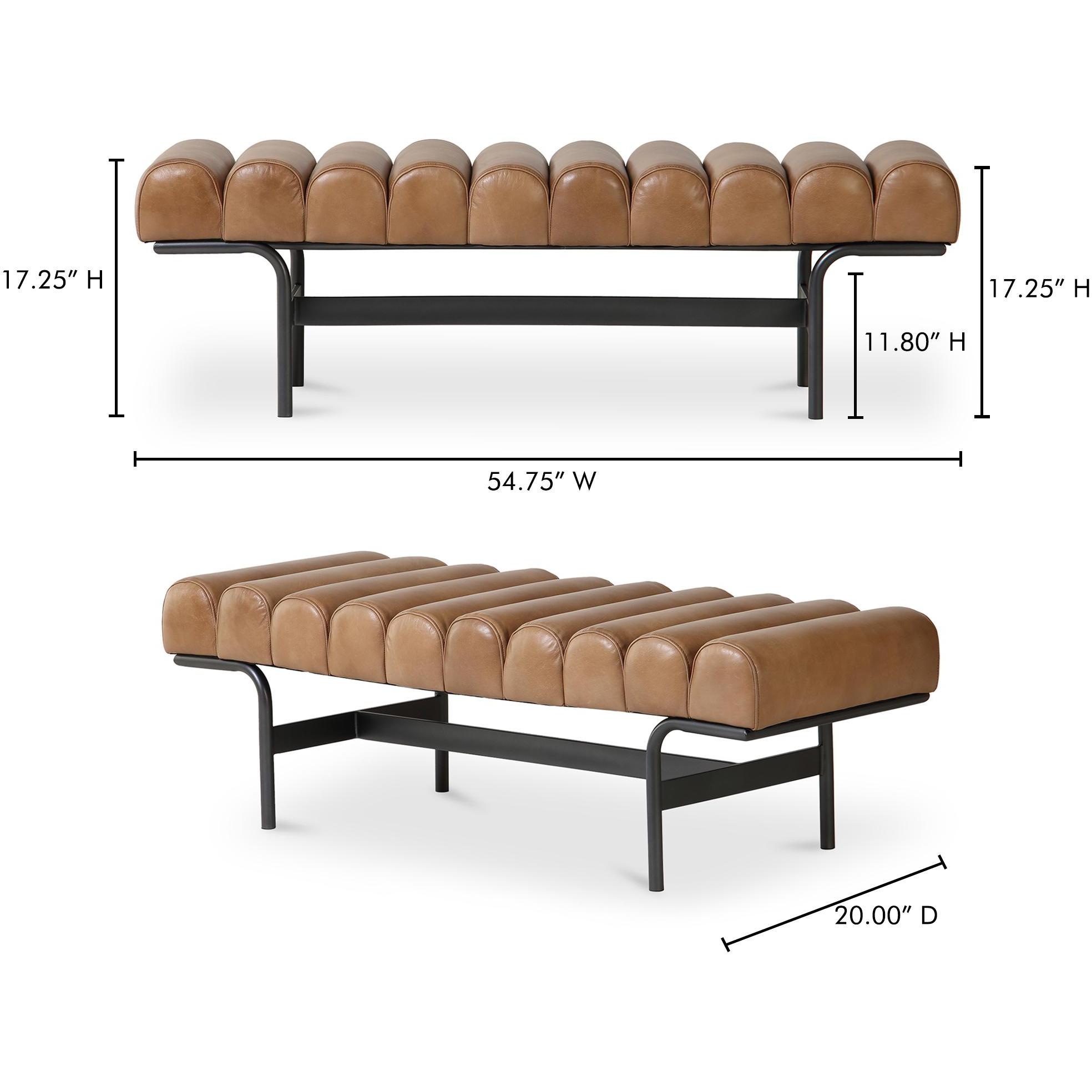 With its channel detailing that adds a touch of softness to the robust metal frame, the distinguished Harrison bench embodies clean lines and a modern sensibility. Crafted with exceptional attention to detail, it effortlessly blends into any space, making a statement wherever it resides, be it the entryway, living room or bedroom. A showcase of luxurious top-grain buffalo leather upholstery, it seamlessly adapts to any decor scheme and adds a touch of sophistication to the surrounding environment.