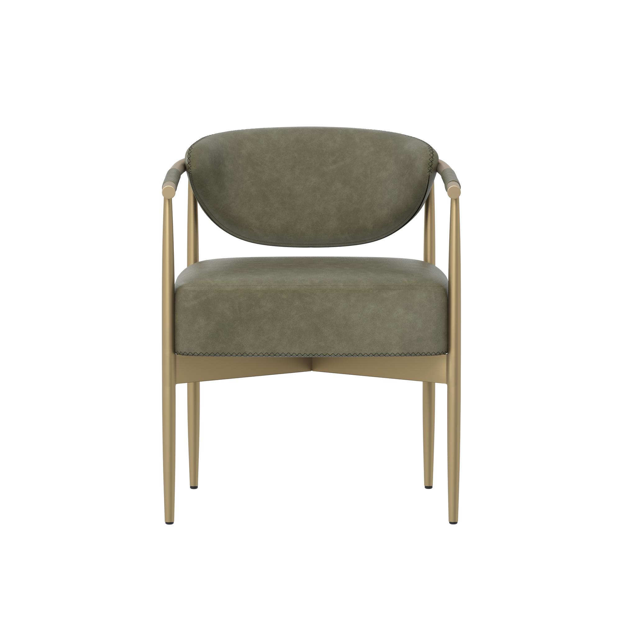 Every detail that makes up the handsome Heloise Dining Armchair is designed with purpose. Ivanhoe pine faux leather upholstery and rope detailing is paired with powder-coated gold stainless steel for optimal style and comfort. Visible stitching on the seat and backrest accentuates the chair’s smooth contours. This elegant dining chair will perfectly complement any dining space. Handle With Care: This design has been crafted with faux leather. Faux leather is manufactured to reflect the natural characteristics of leather; as such, colour variations, markings, wrinkles, grooves, and light scratches are appreciated characteristics. No two pieces will be alike. Visit our Product Care page for more information on how to ensure the lasting beauty of this piece.