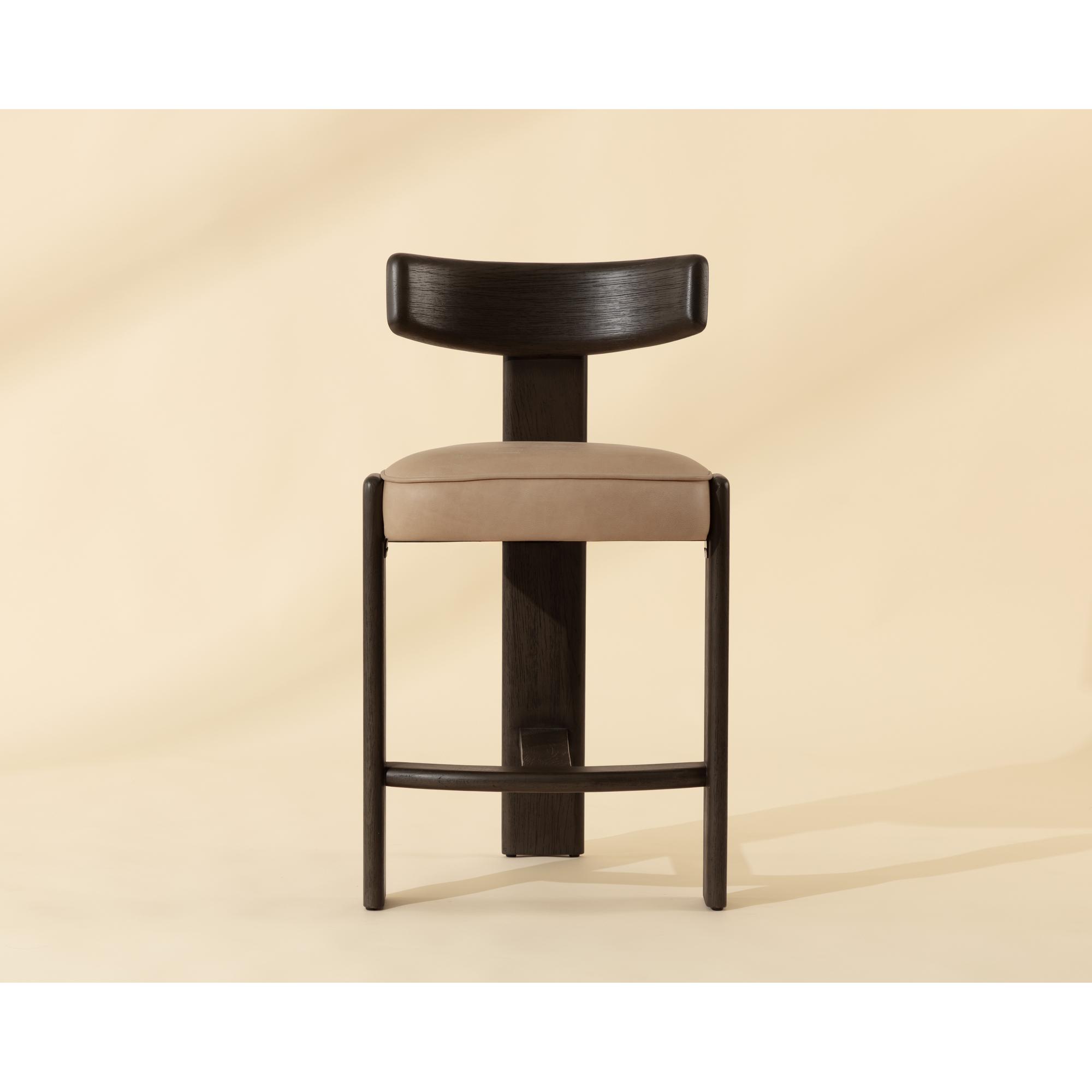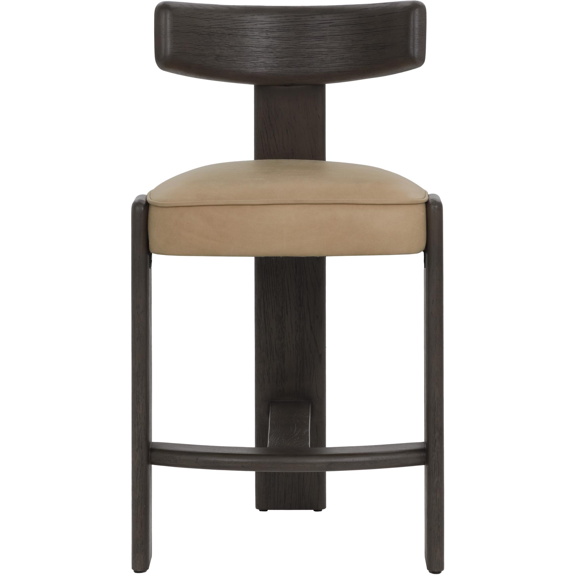 The Horton Counter Stool highlights the beauty of simplicity in contemporary design. A sculpted three-legged frame with a curved back constructed from dark brown oak wood embraces the comfort of a beautiful seat upholstered in our luxurious sahara sand top grain leather.