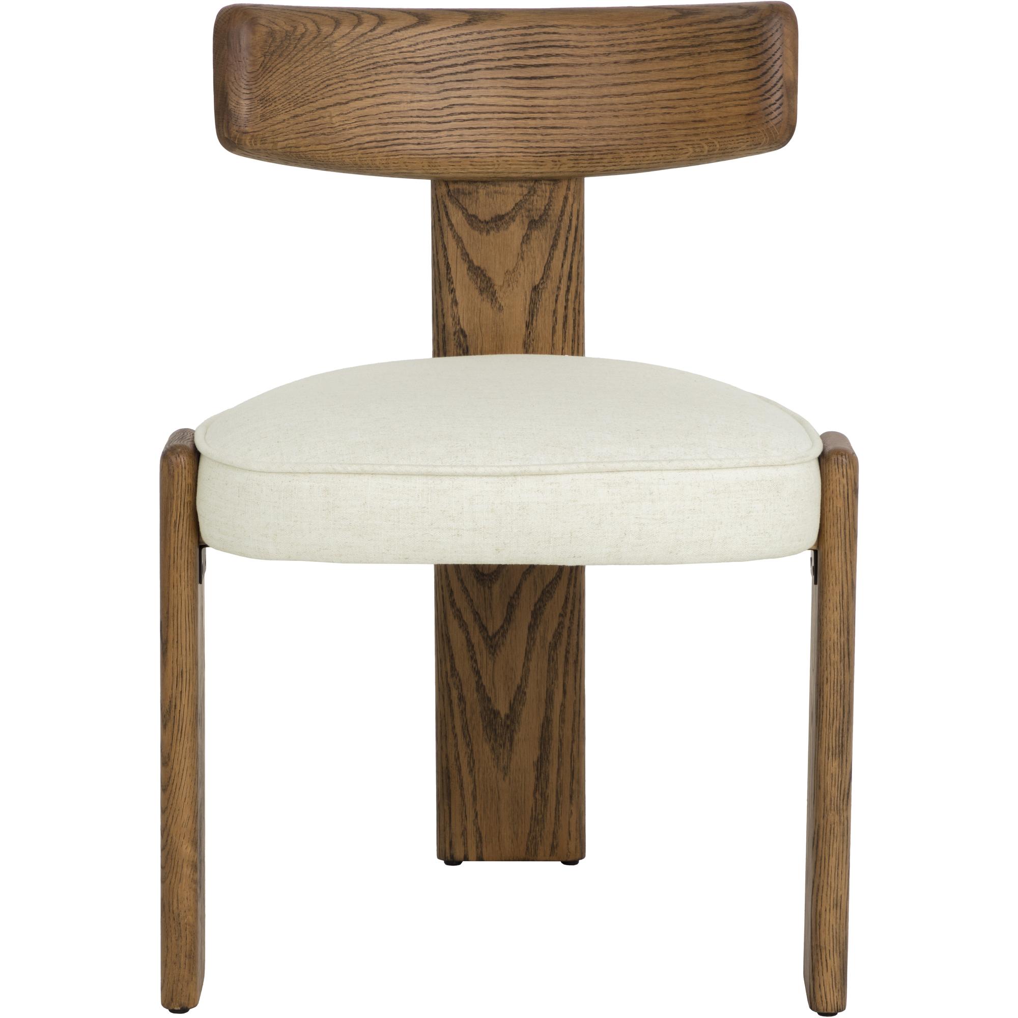 The Horton Dining Chair highlights the beauty of simplicity in contemporary design. A sculpted three-legged frame with a curved back constructed from warm brown oak wood embraces the comfort of a beautiful seat upholstered in our geralt linen performance fabric.