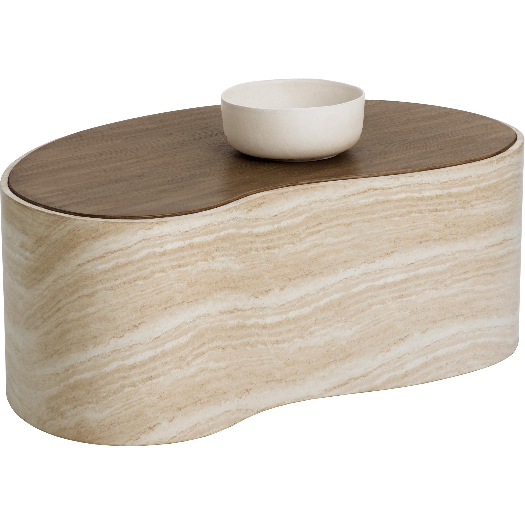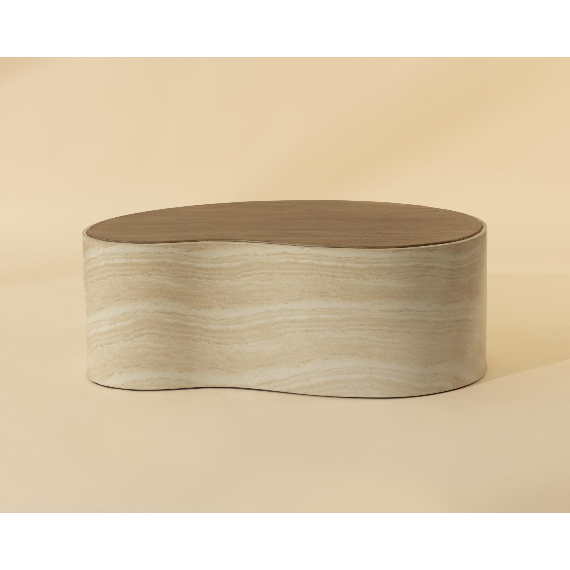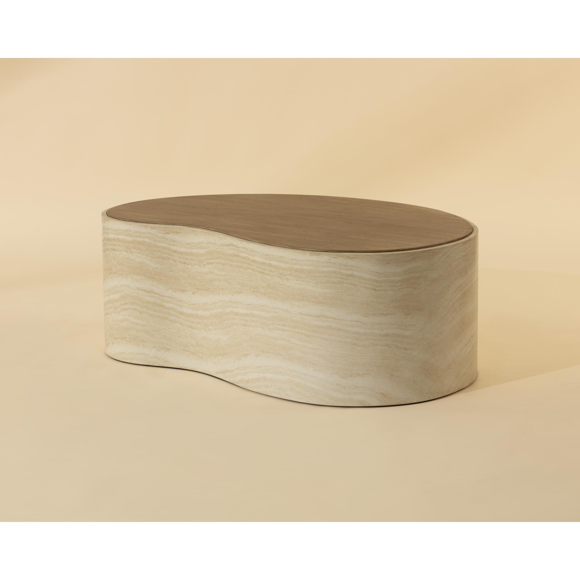 The Ishiko Coffee Table draws the eye with its sculptural, organic shape. Its gently curved, bean-like form is rendered in glass reinforced concrete, balancing the warmth of a light brown wood-effect top with the cool striations of a travertine-inspired base.