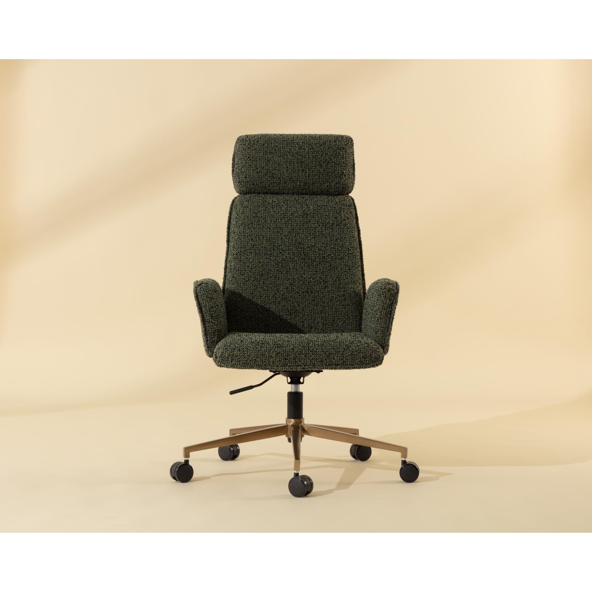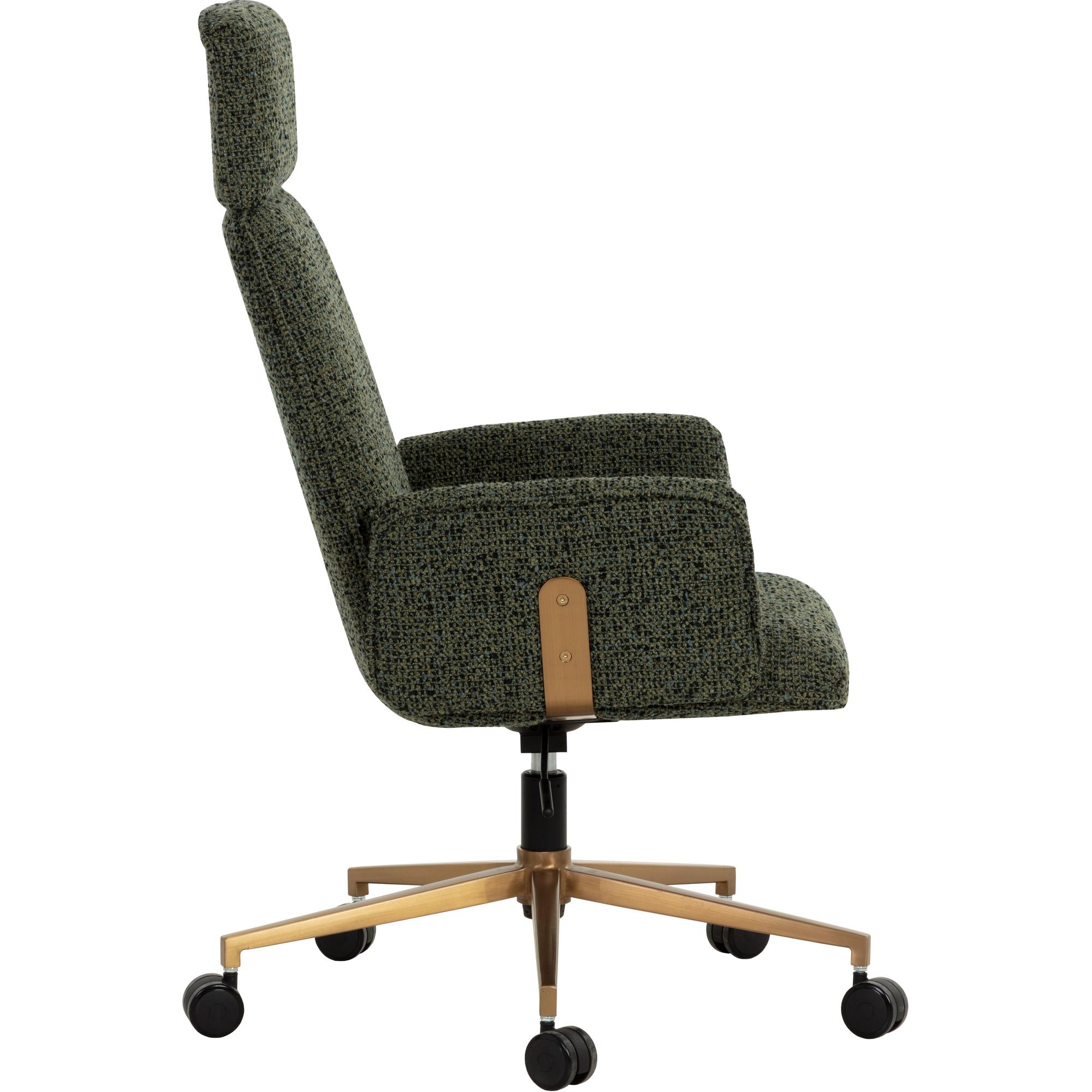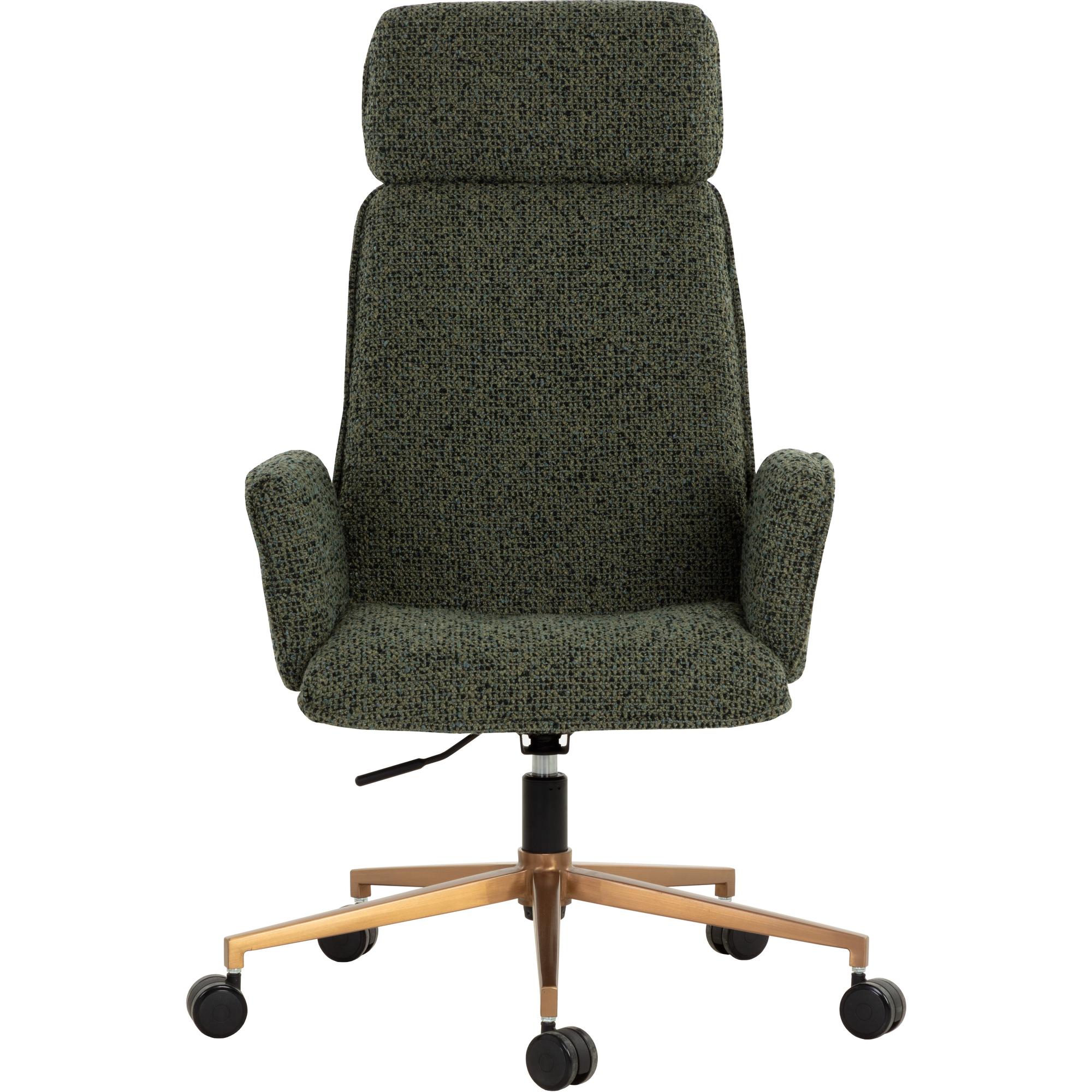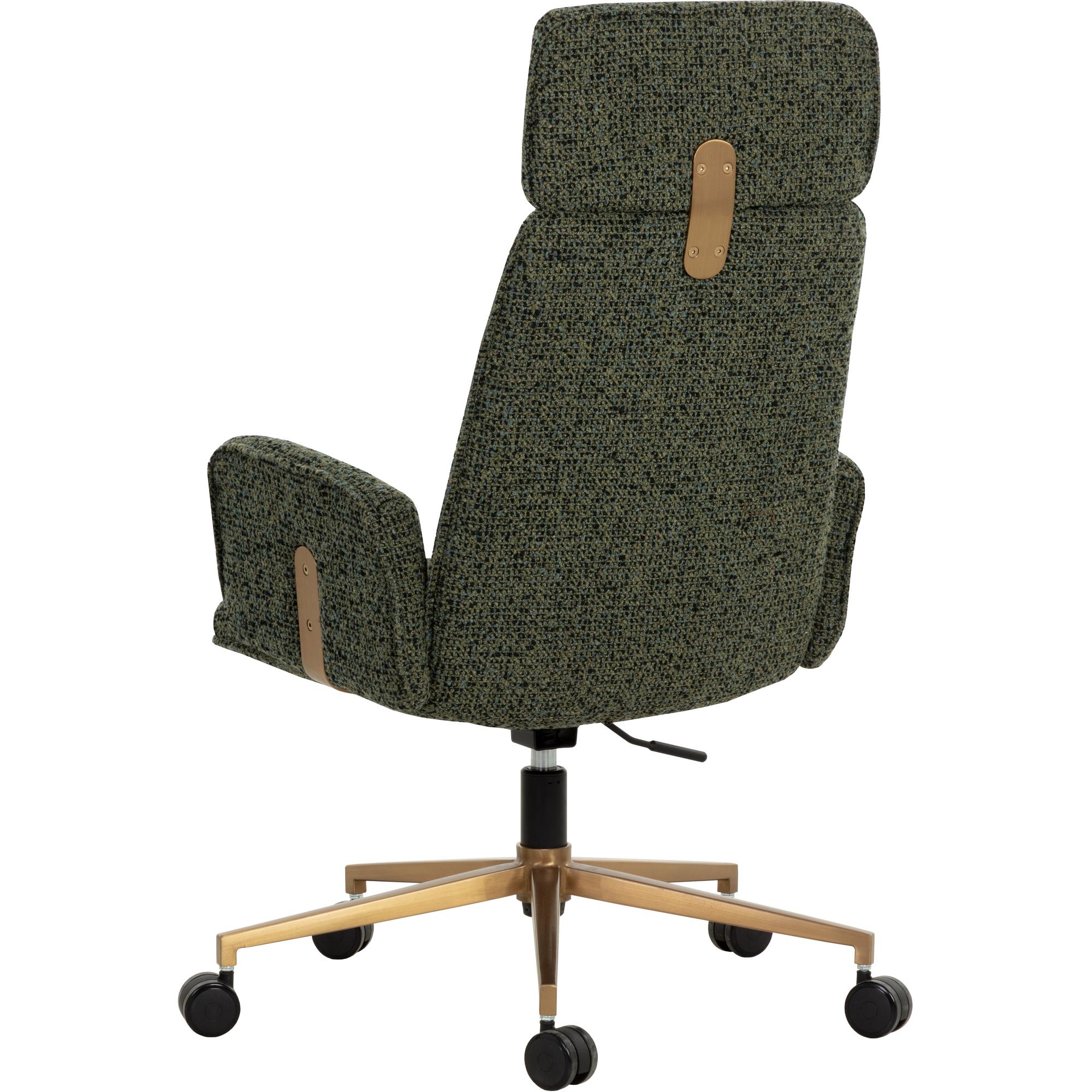 A classic silhouette and subtle curves make the Kalev Office Chair perfect for any workspace. Upholstered in textured noah meadow fabric with plush comfortable seating. Contrasting gold accents behind the arms and headrest match the sleek stainless steel base for added style.