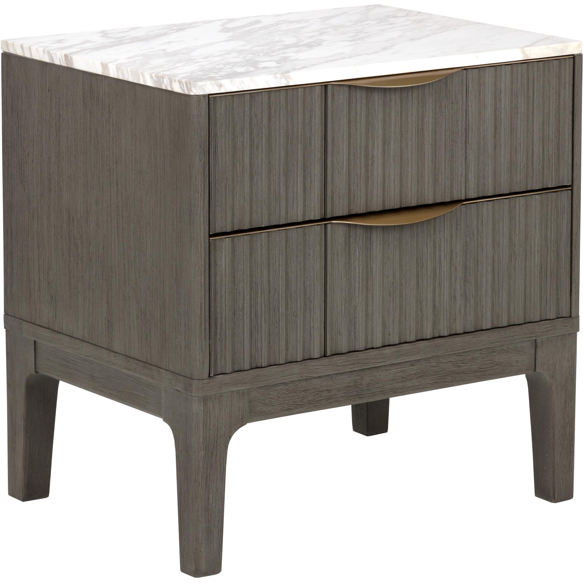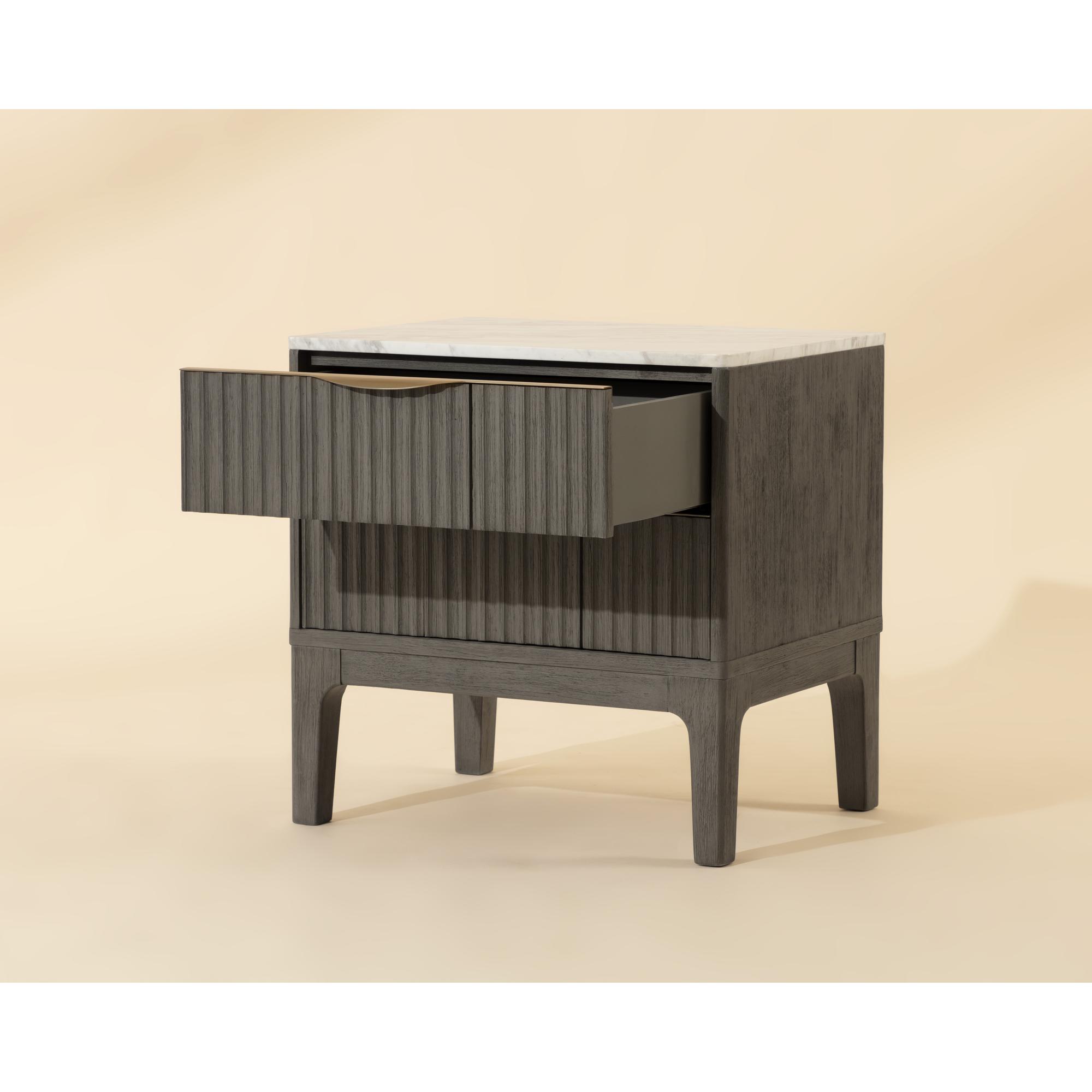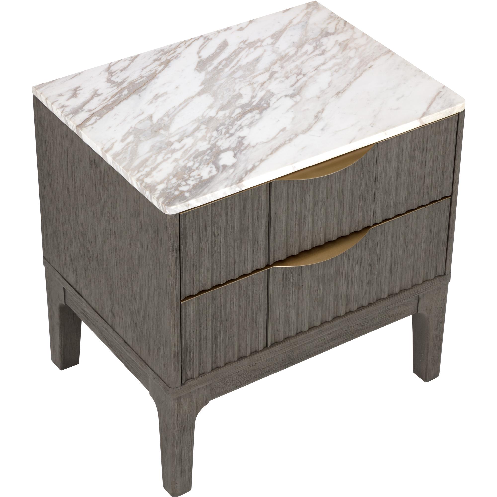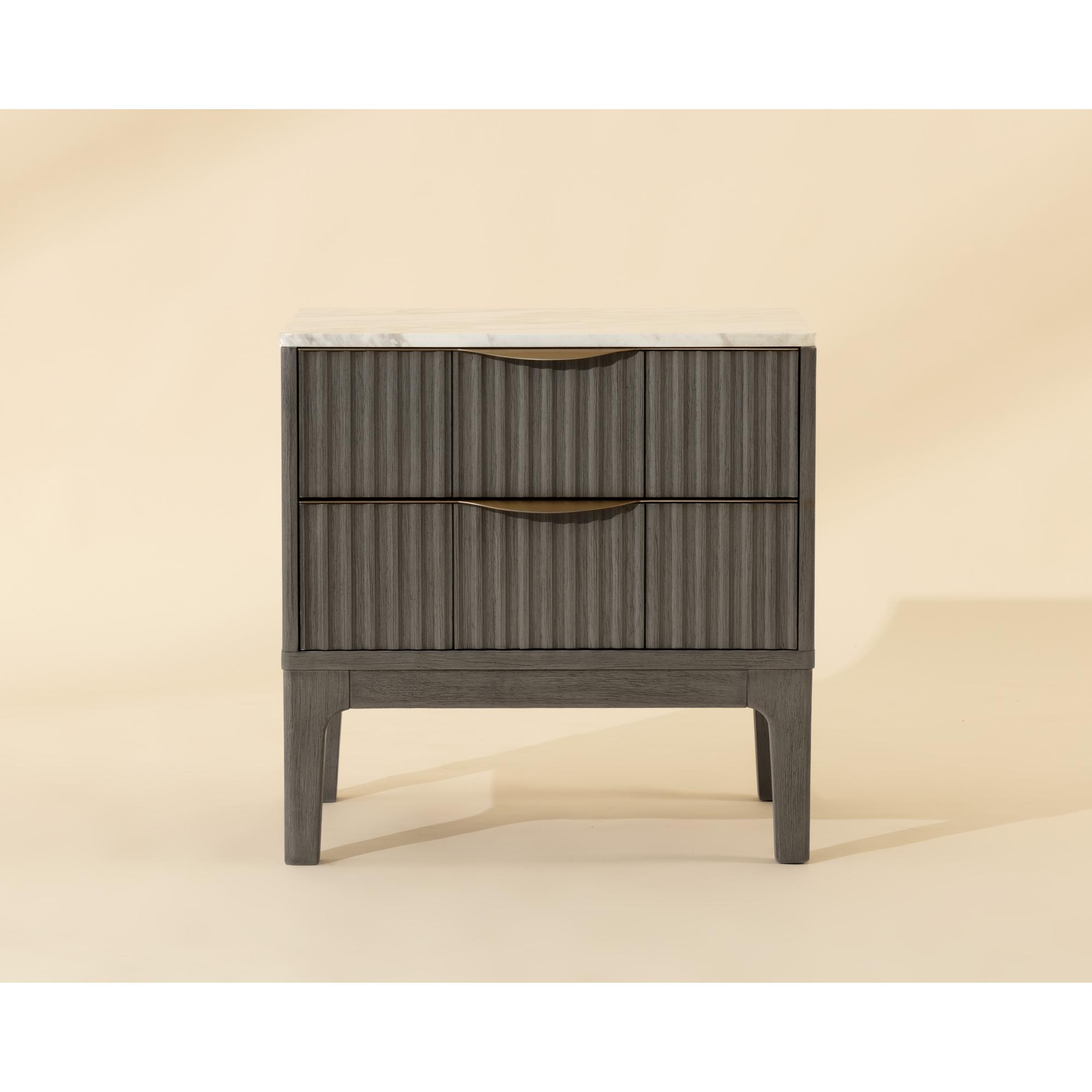 The Keldon Nightstand features an interplay of texture and tone. At the top rests soft white marble, with earthy brown veining that creates a distinctive, organic surface. Below, the rubberwood drawers are detailed with vertical reeding in a brushed gray finish. Slim gold handles offer a subtle gleam, adding an understated elegance to the bedside.