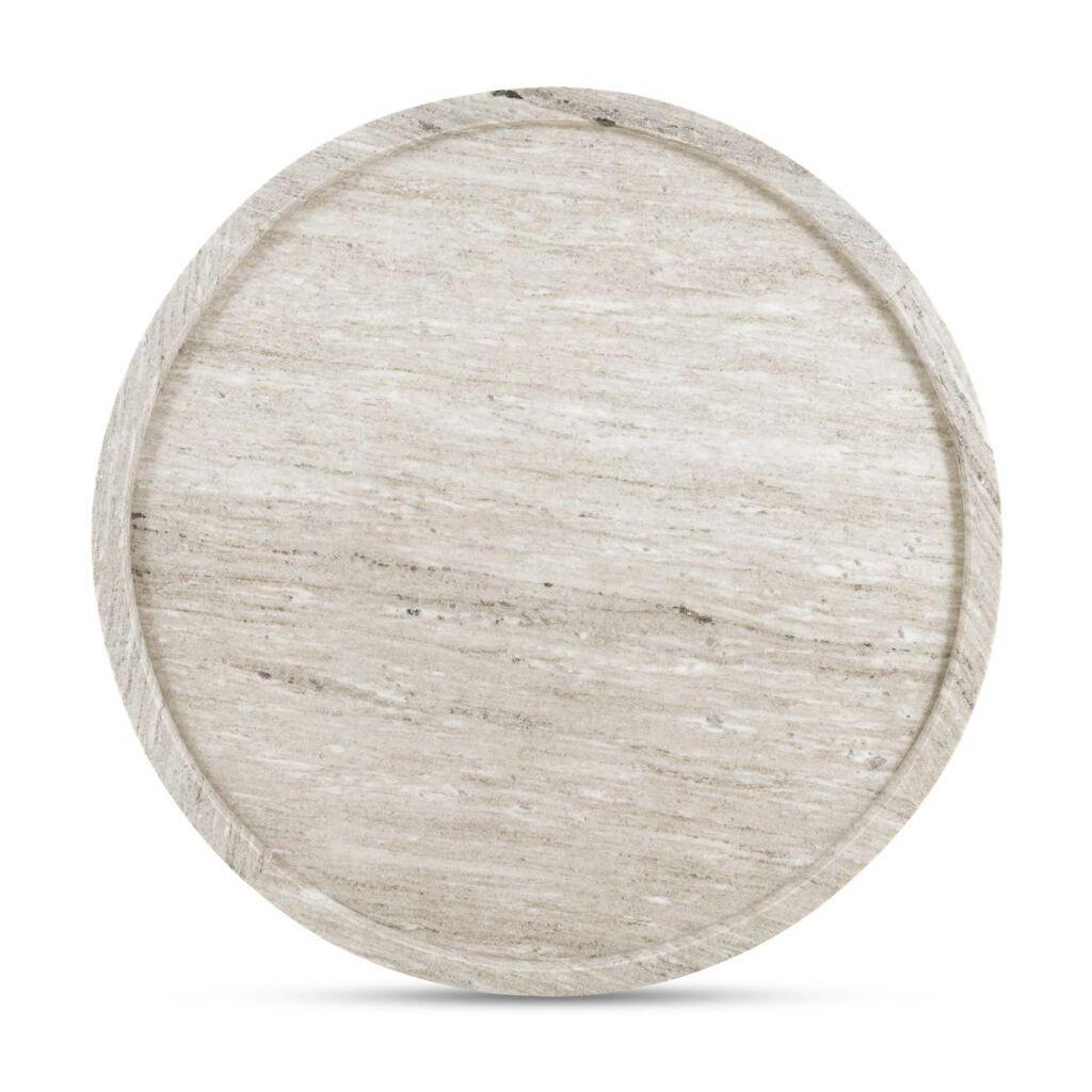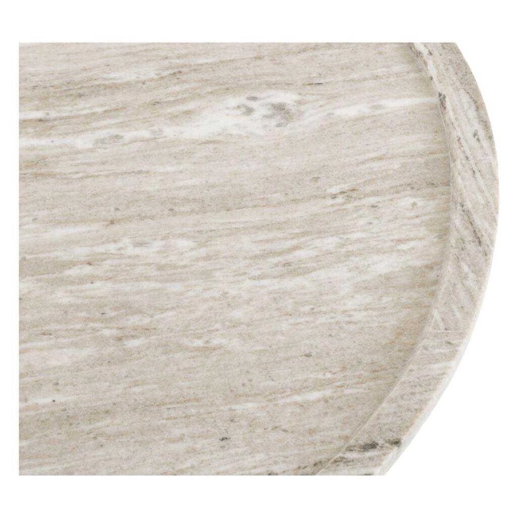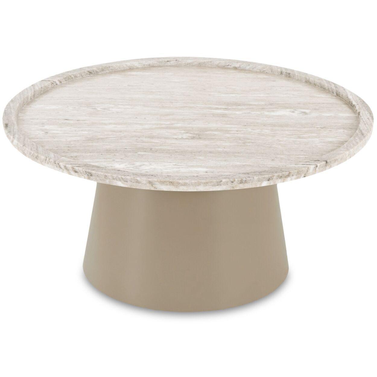 The Kimberley Coffee Table is a blend of cool materials and warm tones. A rounded tray-shaped top of antique white marble featuring subtle veining rests upon a camel-colored iron sheet base that angles outward with grace. This piece marries practicality with refined aesthetics—its tray top offer security; its design timeless appeal.