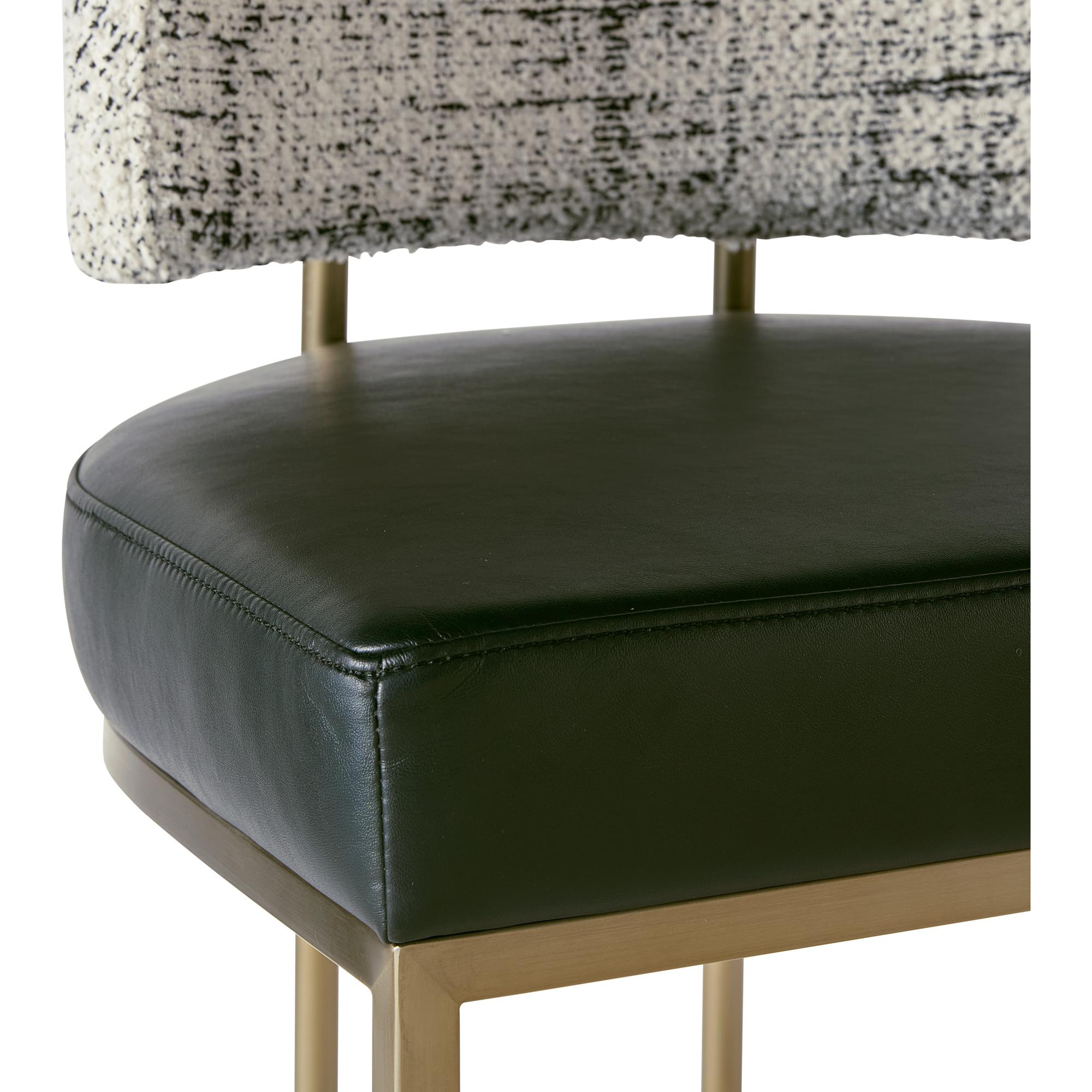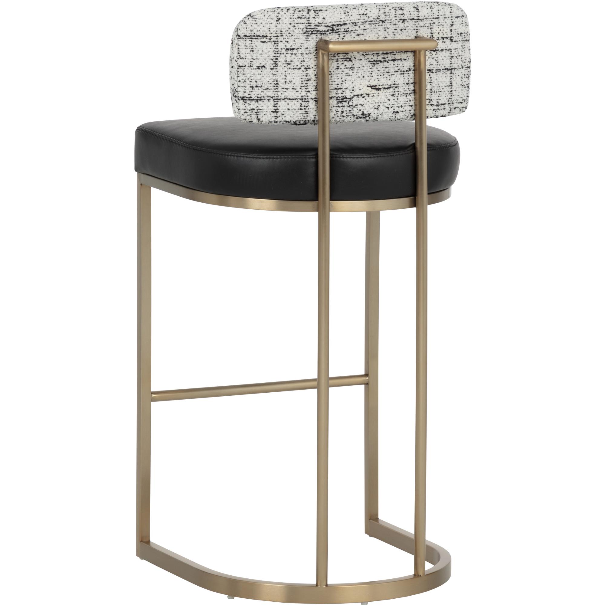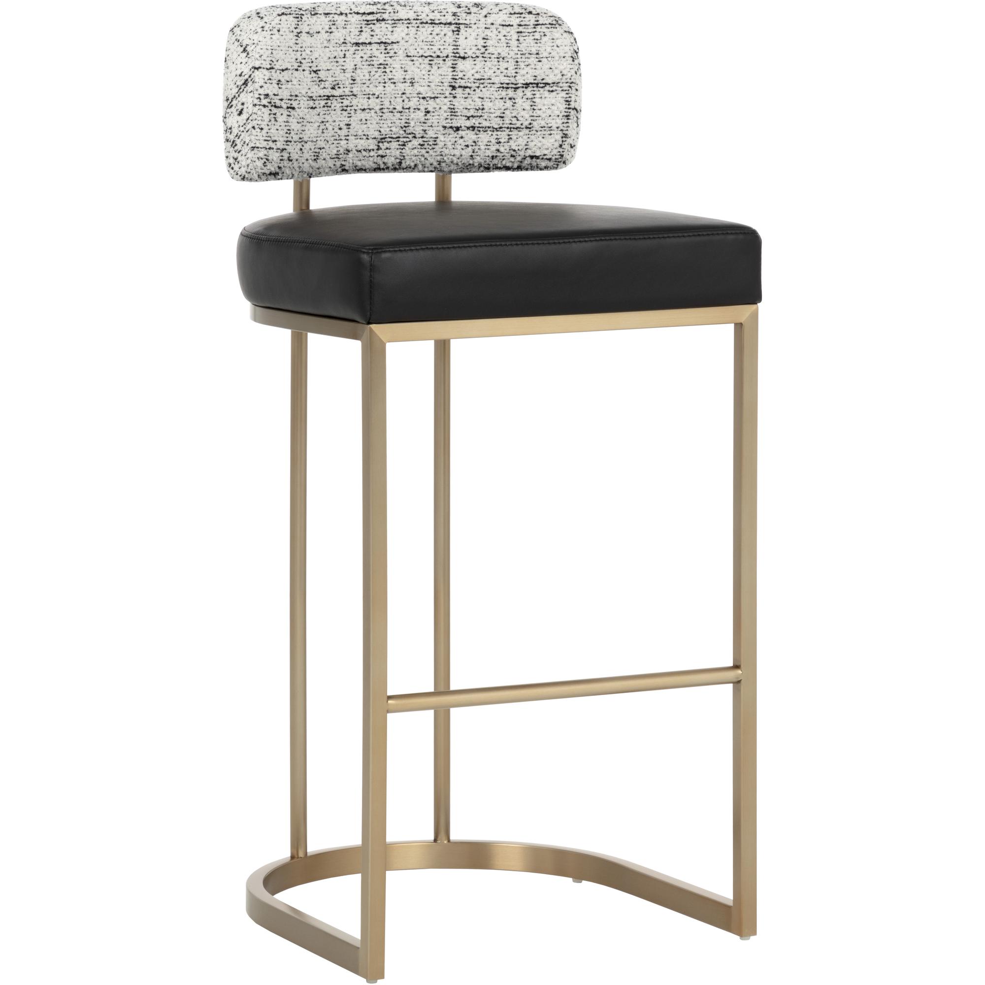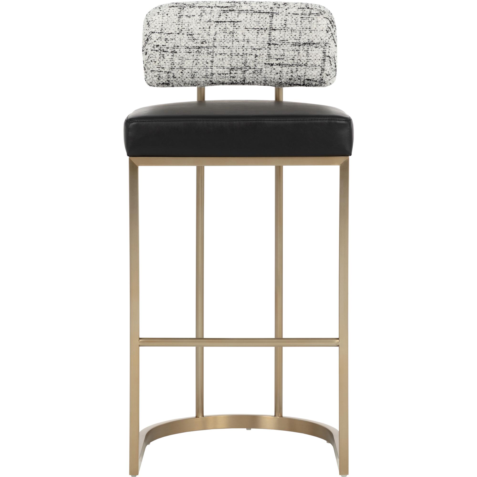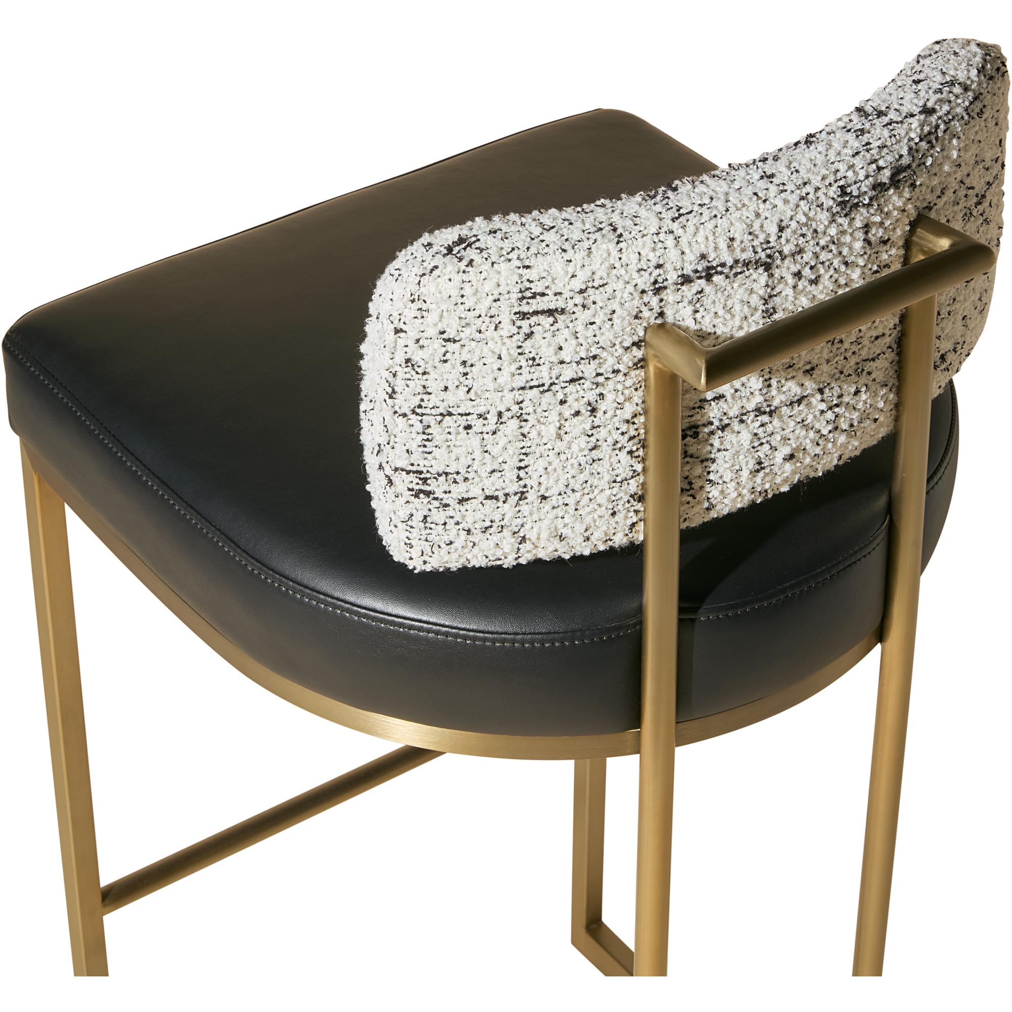 The Larissa Barstool brings together a beautiful display of mixed materials. A low seatback upholstered in halton birch fabric contrasts the dark tones of the seat upholstered in bravo black faux leather for an elevated aesthetic. The antique brass stainless steel frame features a handle on the back for a functional and stylish addition.