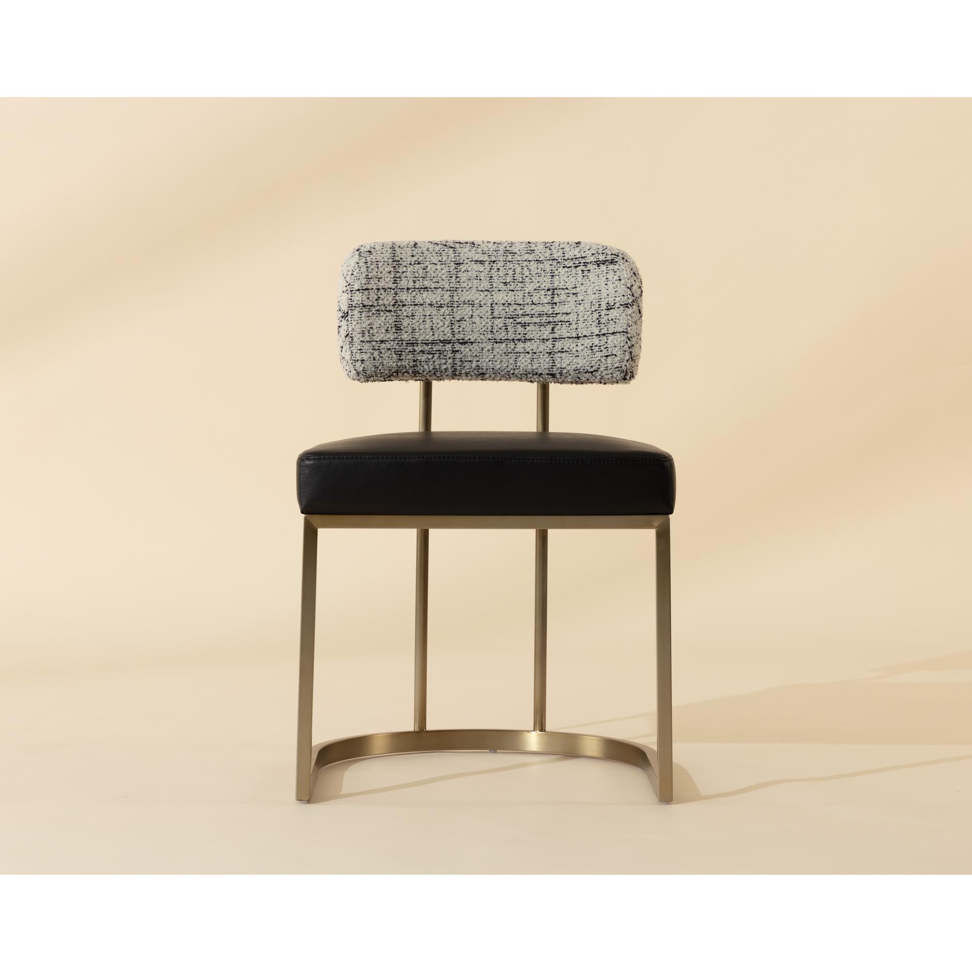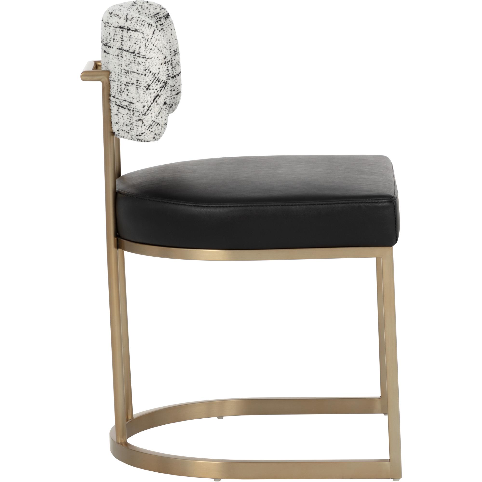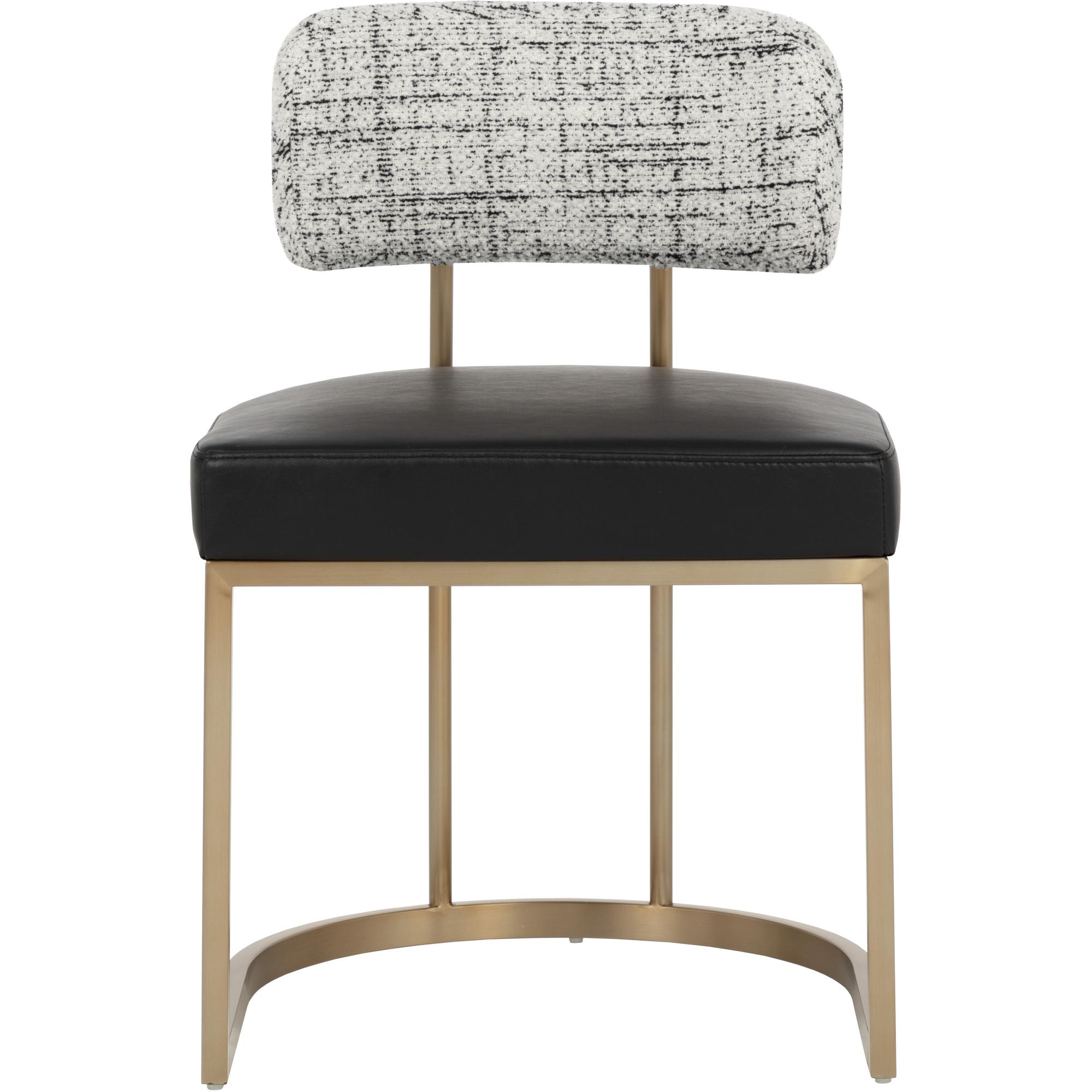 The Larissa Dining Chair brings together a beautiful display of mixed materials. A low seatback upholstered in halton birch fabric contrasts the dark tones of the seat upholstered in bravo black faux leather for an elevated aesthetic. The antique brass stainless steel frame features a handle on the back for a functional and stylish addition.