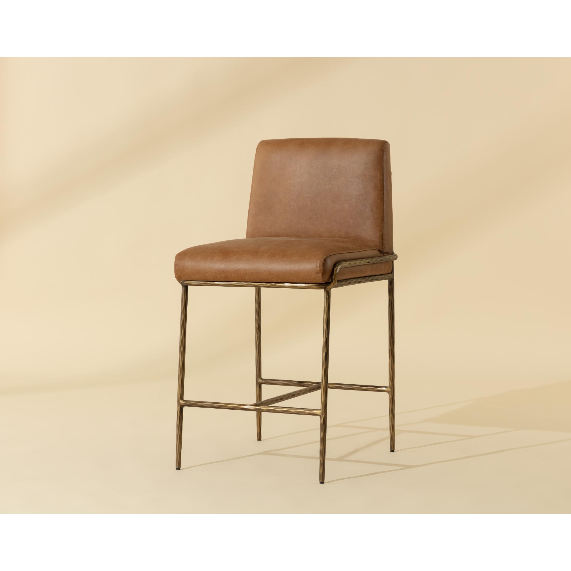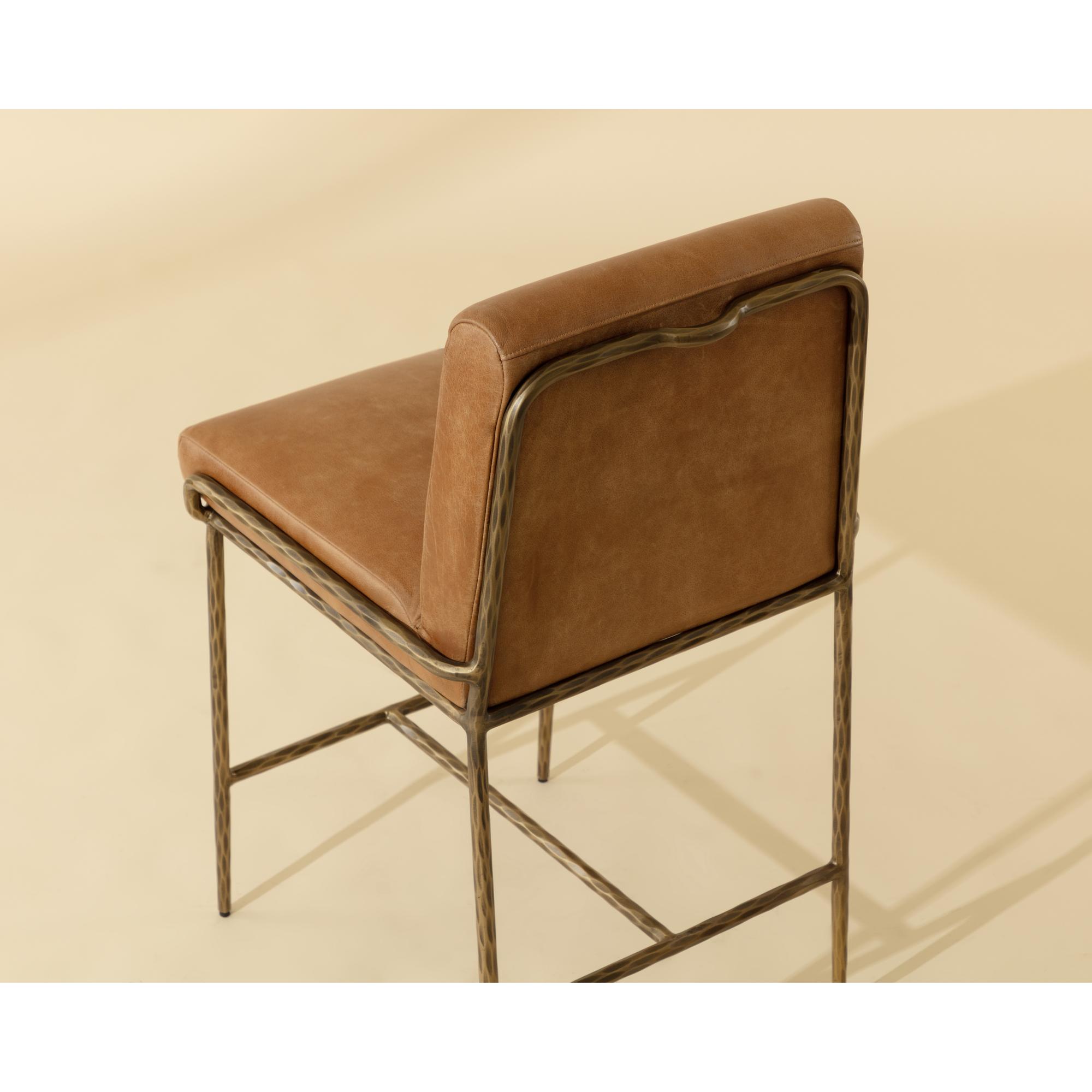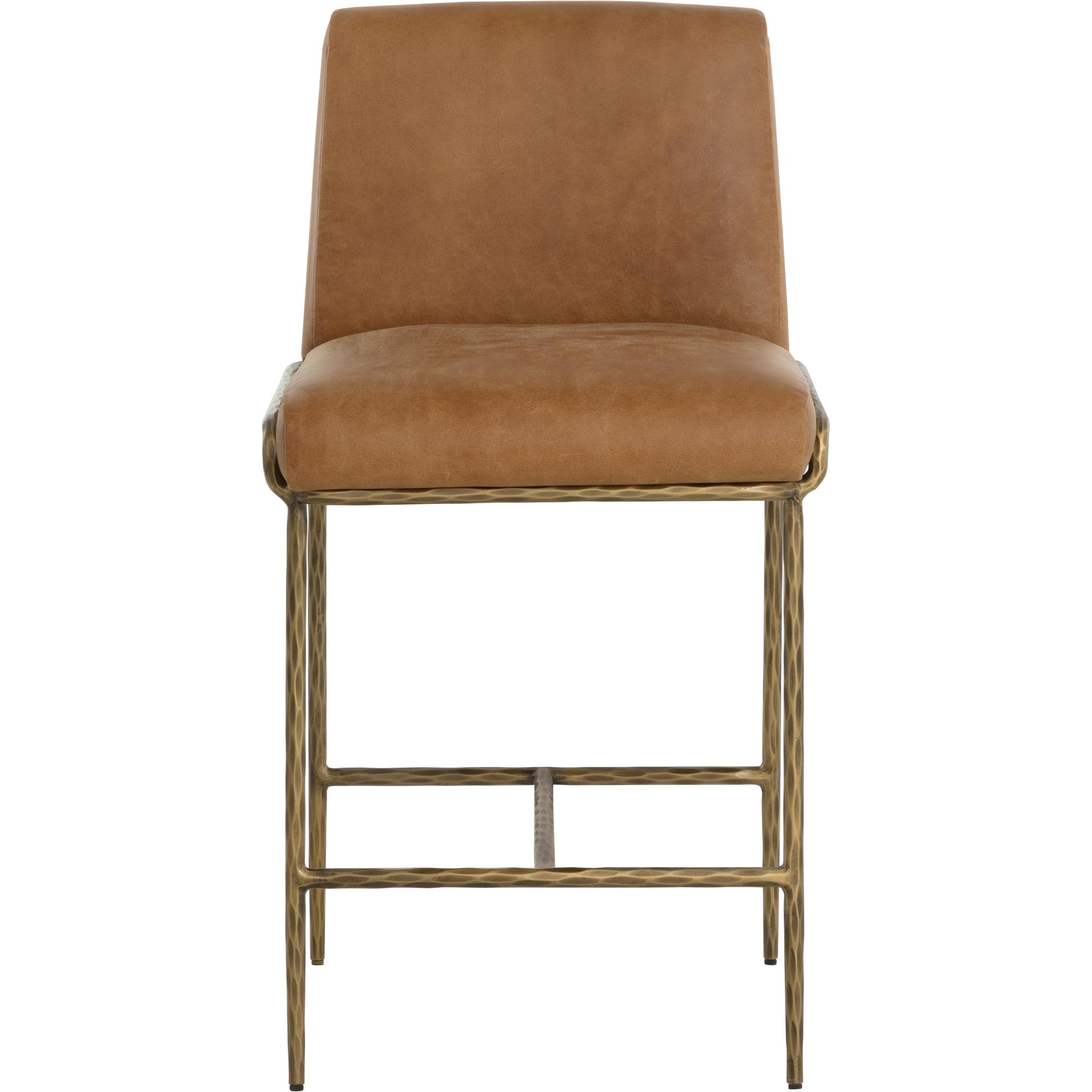 The Lathan Counter Stool is a celebration of minimalist design. Boasting a hand hammered antique brass iron frame and a comfortable seat upholstered in tan leather. A luxurious addition to any space.
