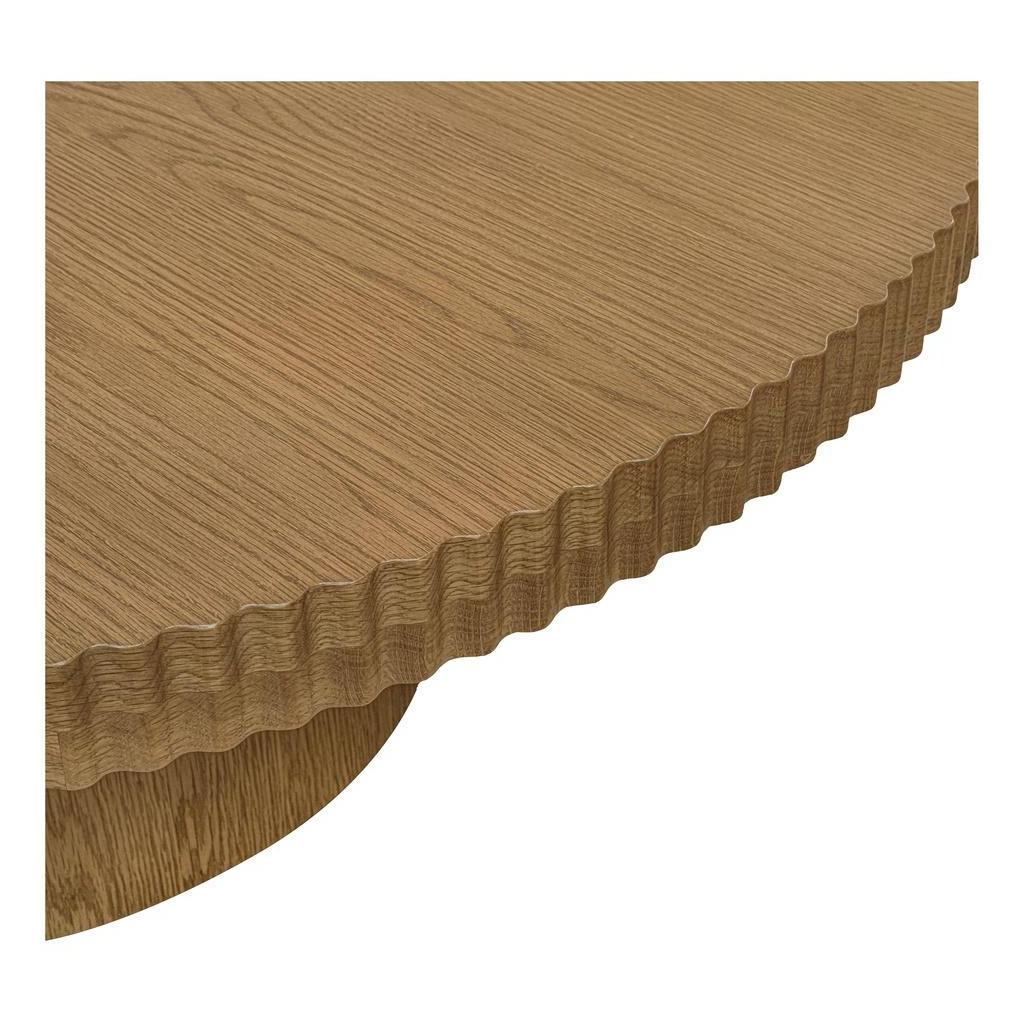 Not your average coffee table. Leigh makes a bold statement with a thick, round table top edged in a playful scalloped detail. Its stacked cylindrical base balances lightness with grounding presence, finished in oak veneer over MDF with a solid oak edge. Built for everyday living