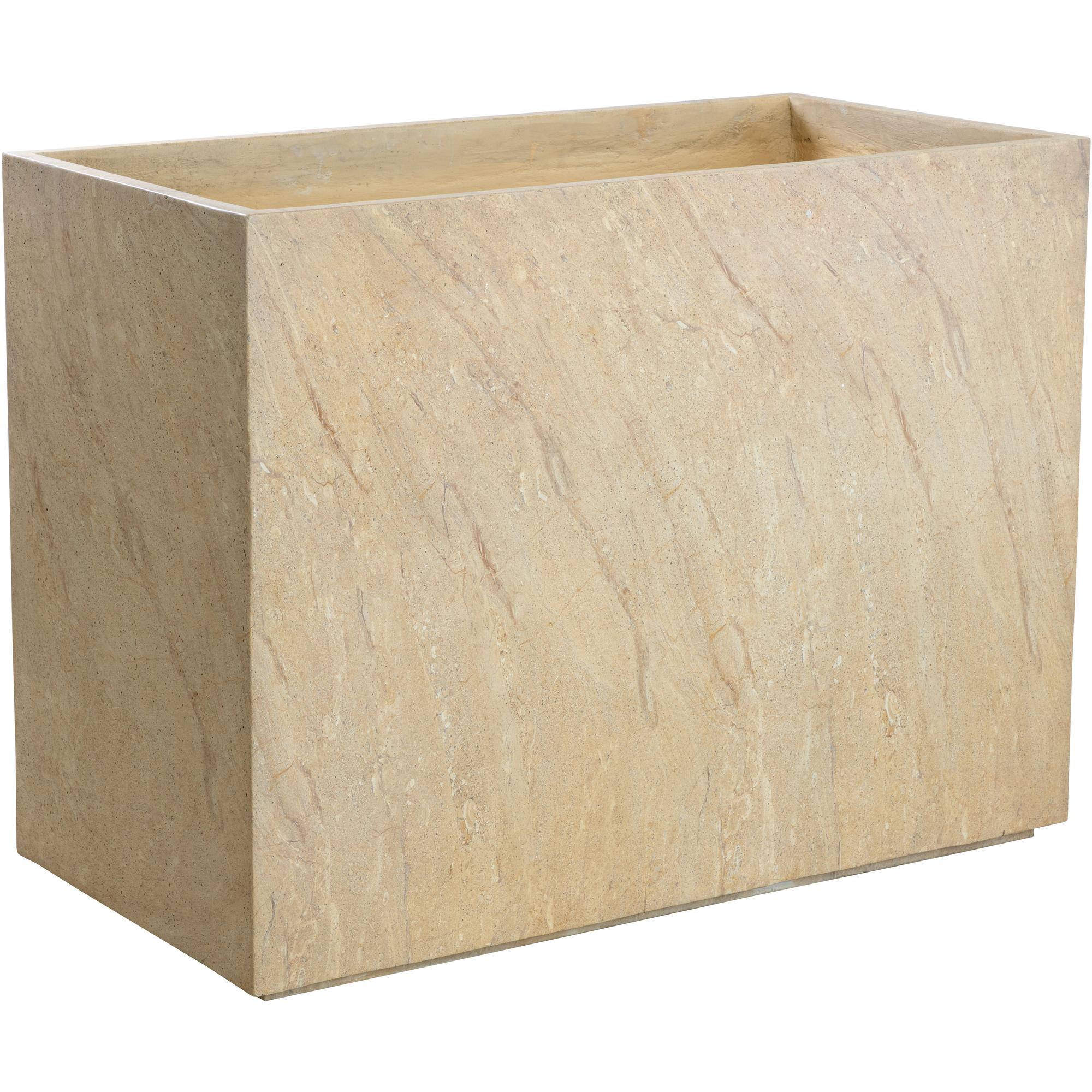 The contemporary form of the large rectangular Leilani Planter allows for a lush display of botanicals that will complement any decor. Constructed from glass fibre-reinforced concrete for increased durability with a protective sealant finish that allows it to withstand the elements. Designed to resemble the look of natural travertine, this beautiful planter will be a welcome addition to large spaces such as hotel lobbies or building entrances. Includes holes for drainage, two steps, and a removable shelf insert. Suitable for indoor and outdoor covered spaces.