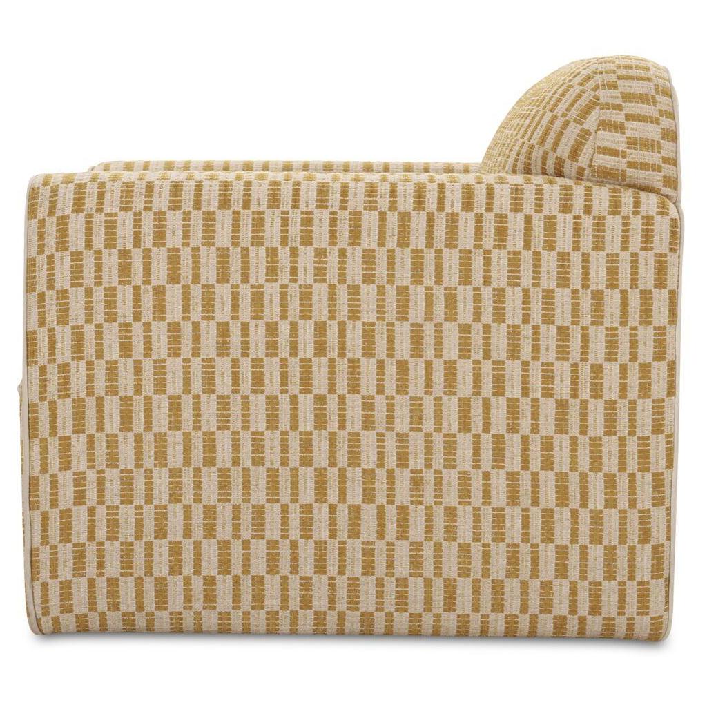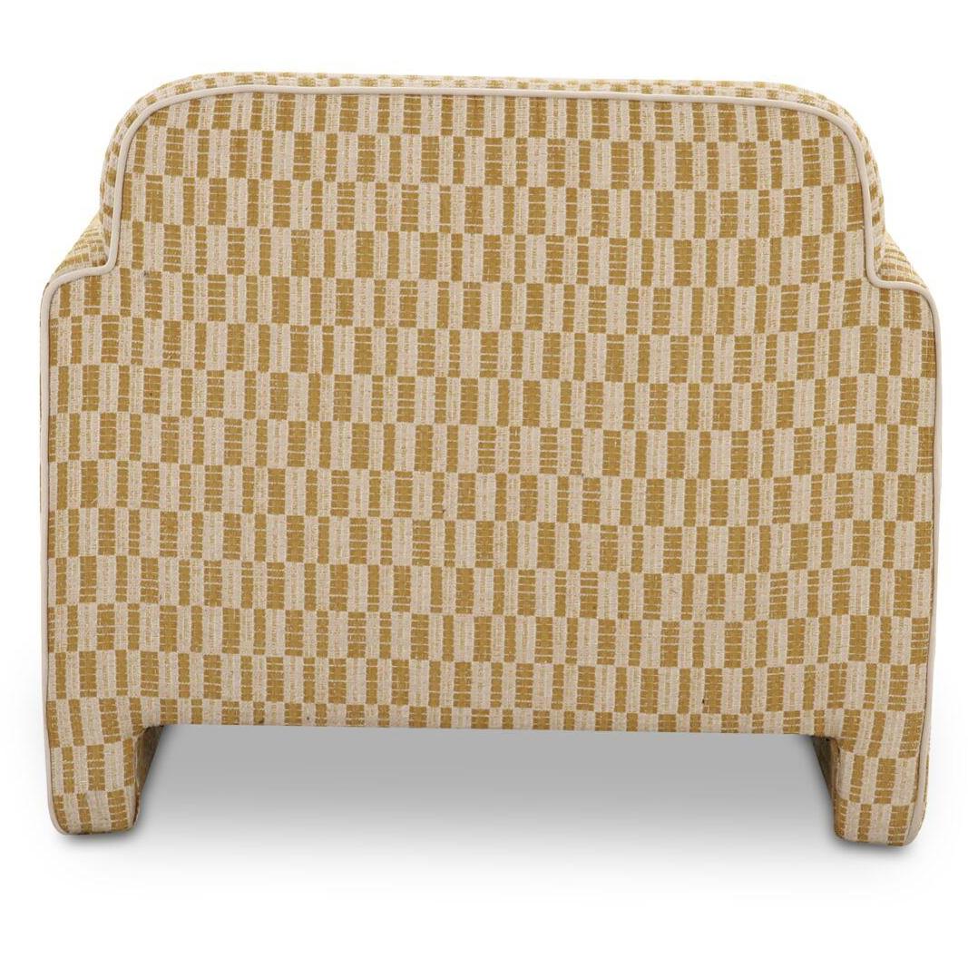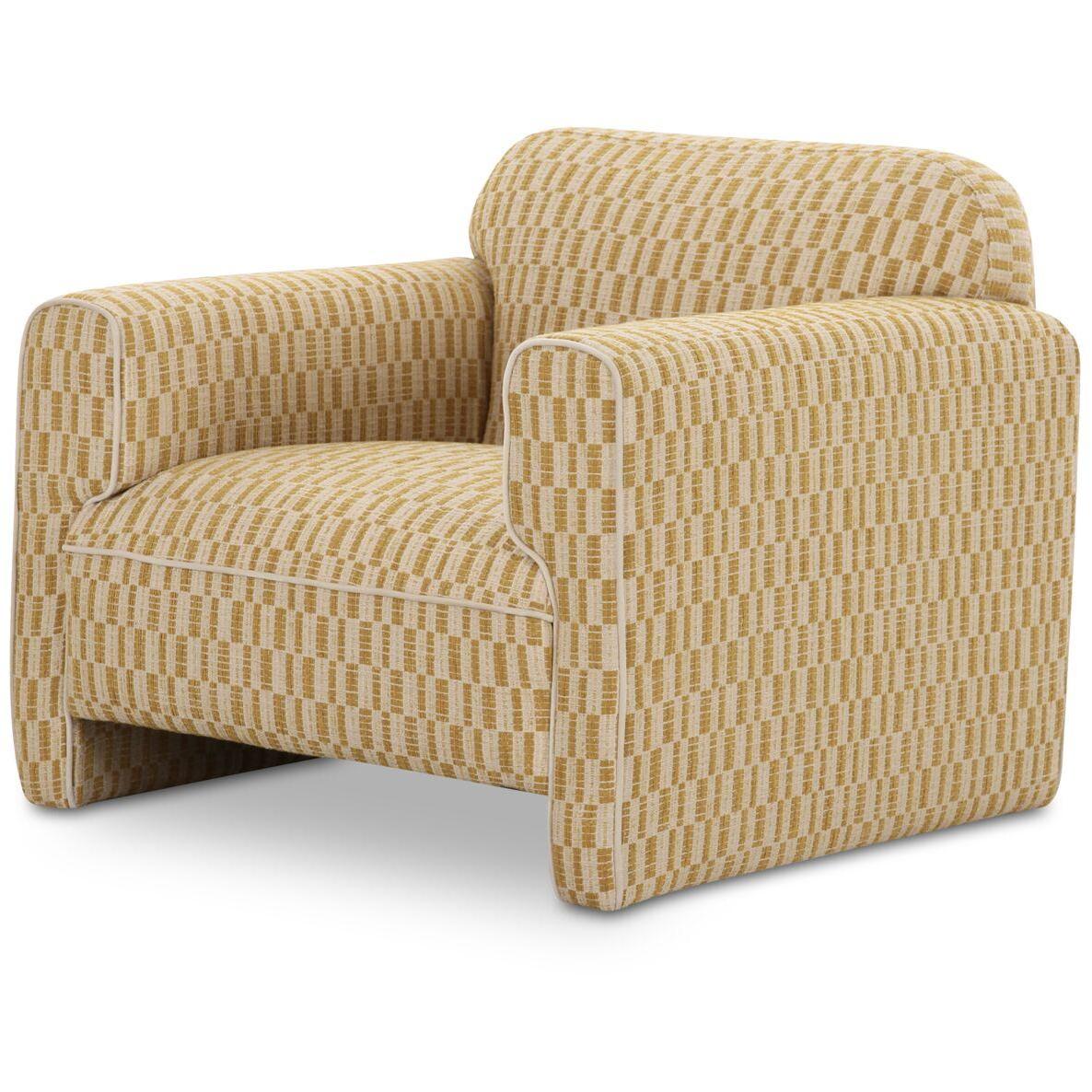 The Leo accent chair is a statement in modern design with its striking form and geometric pattern. This piece elegantly plays with curved and straight lines, as its squared side profile contrasts inward rolled arms and curved back. It offers a sophisticated silhouette accented with tonal contrast piping and fully upholstered legs.