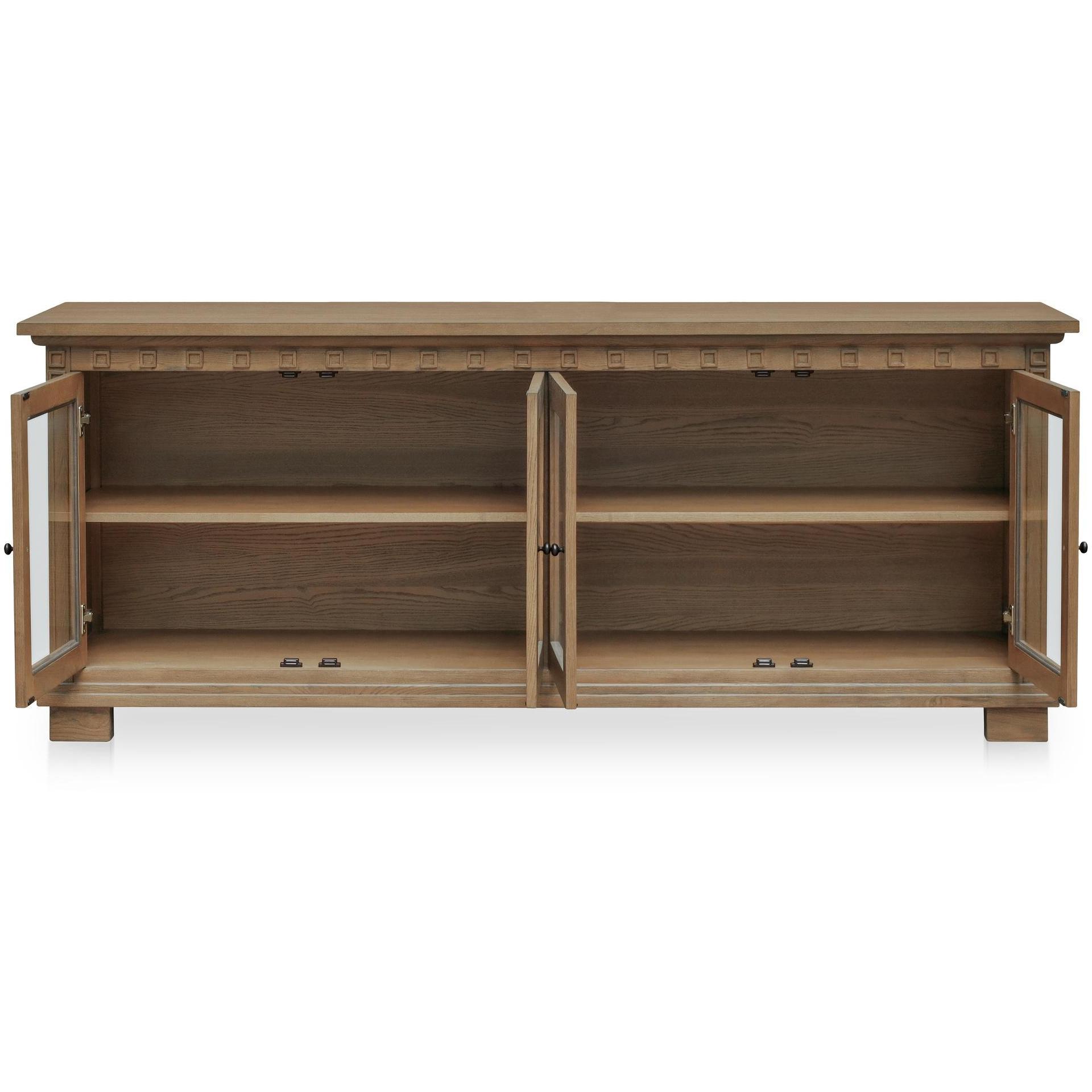 Your good taste, on display. Lillian puts a fresh face on tradition. Crafted from solid ash with a rich wood grain and warm mid-tone finish, it pairs crisp lines with molding details that feel classic. Four glass-front doors let your dinnerware, vintage finds, or everyday essentials shine, while blackened bronze handles bring in just the right contrast. It’s a timeless piece with a clear view.