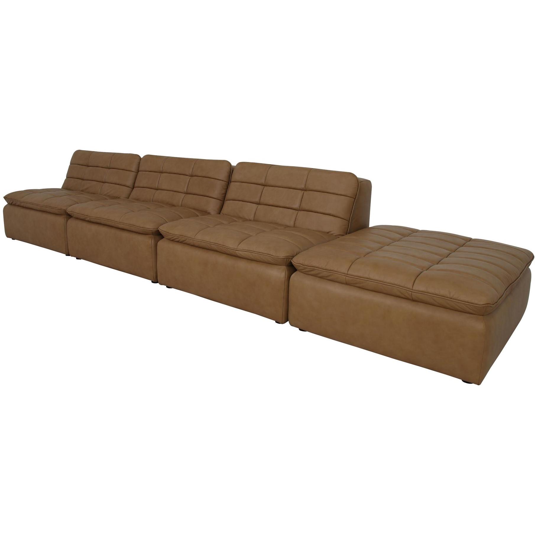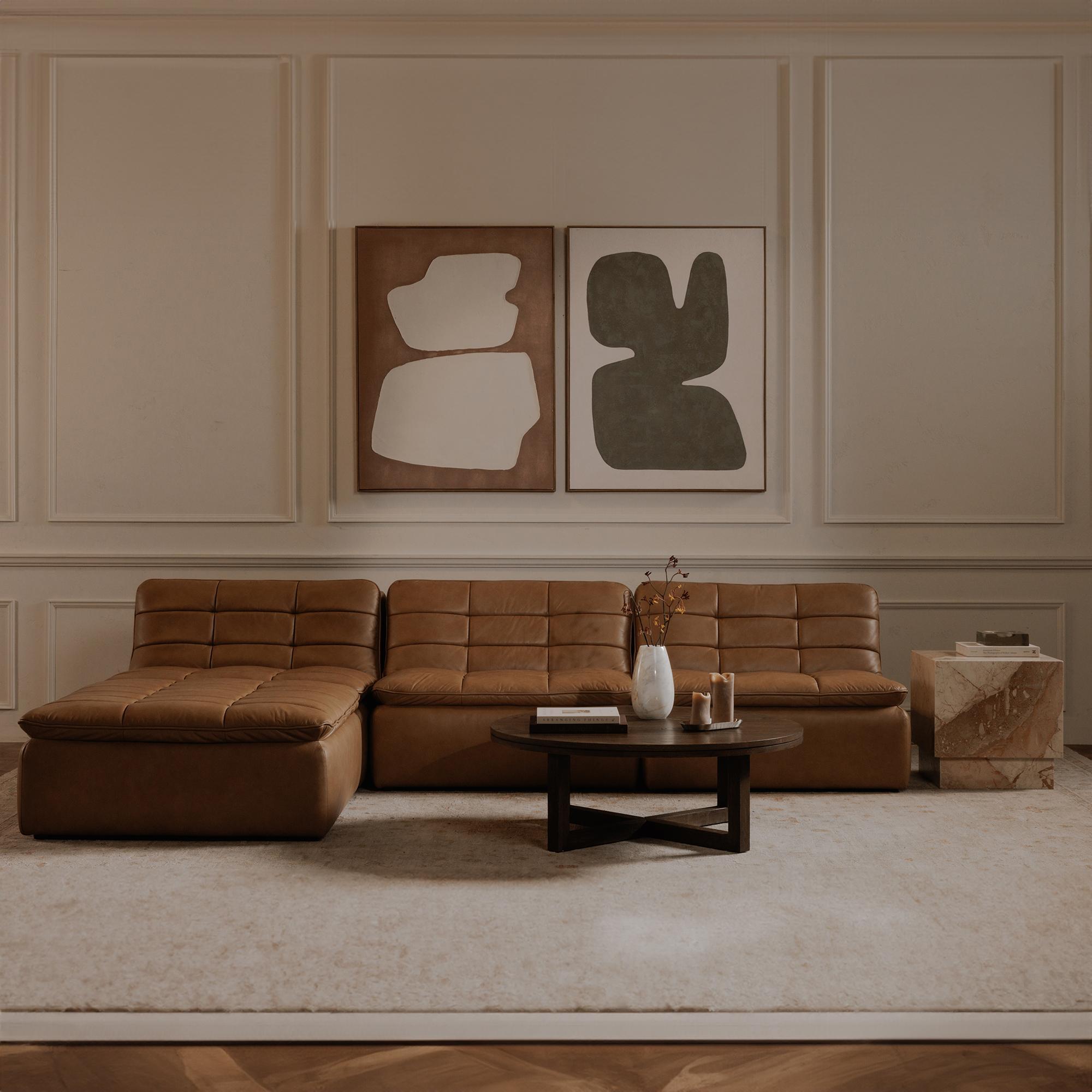 The Lino lounge modular adds vintage charm reimagined for modern sophistication. Inspired by 1970s modernist design, its distinctive grid-like channeling creates a captivating visual rhythm. Upholstered in a top-grain leather, this armless sectional offers indulgent comfort with its plush, generously stuffed seat.