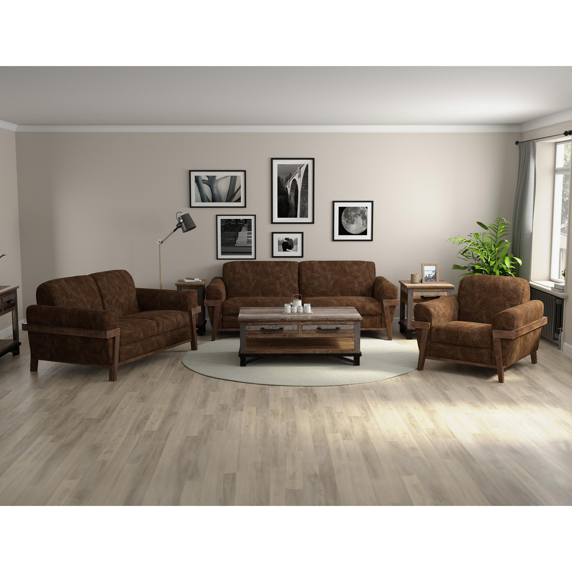 Introducing our captivating Loft Brown Collection, where traditional design seamlessly merges with mid-century modern details in this stunning transitional piece. With its distinctive exposed pine wooden legs and frame, retro-inspired rolled arms, and meticulous craftsmanship, this collection features solid wood and 15mm-thick, 5-layer plywood construction, ensuring both the strength and durability of the frames.