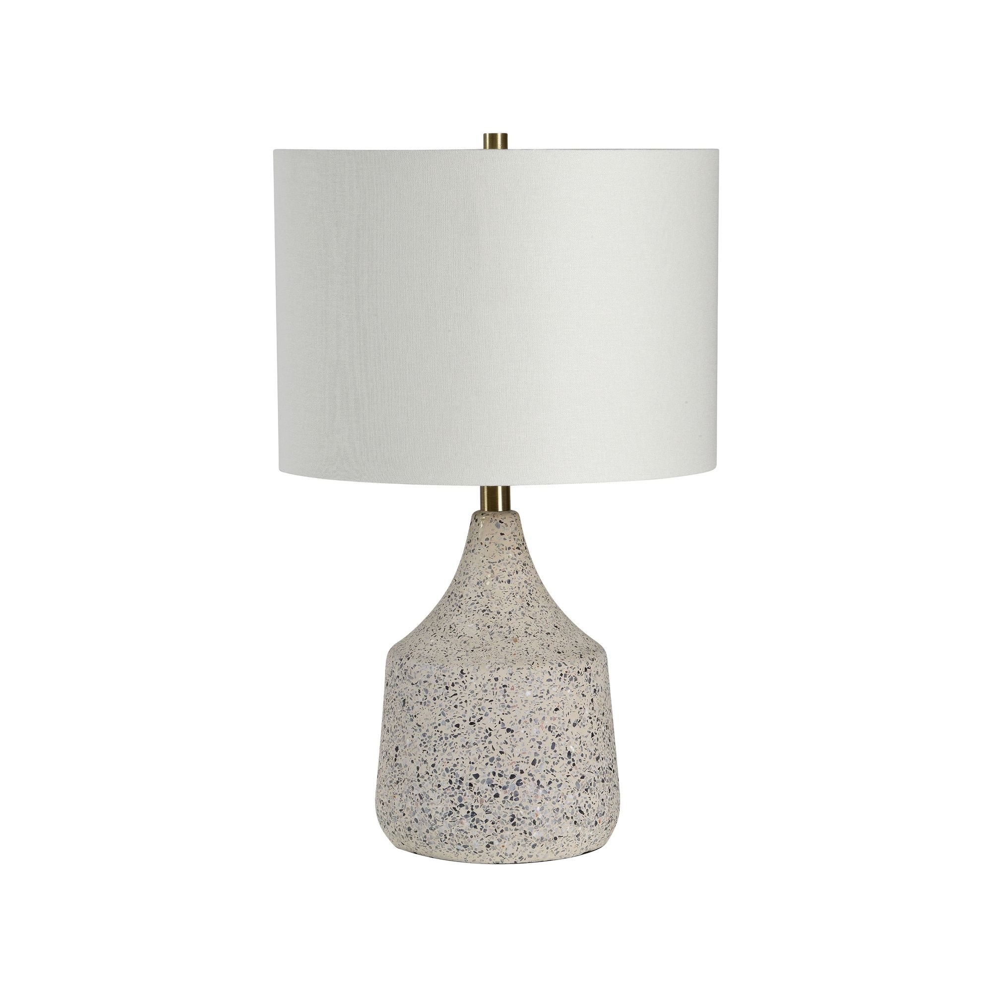 Exuding a California cool energy, this table lamp brings an element of sophistication to the coastal home. Despite a demure palette, care of a speckled cement base, antique brass finish, and an off-white linen shade, this design leaves a lasting impression on all passersby.