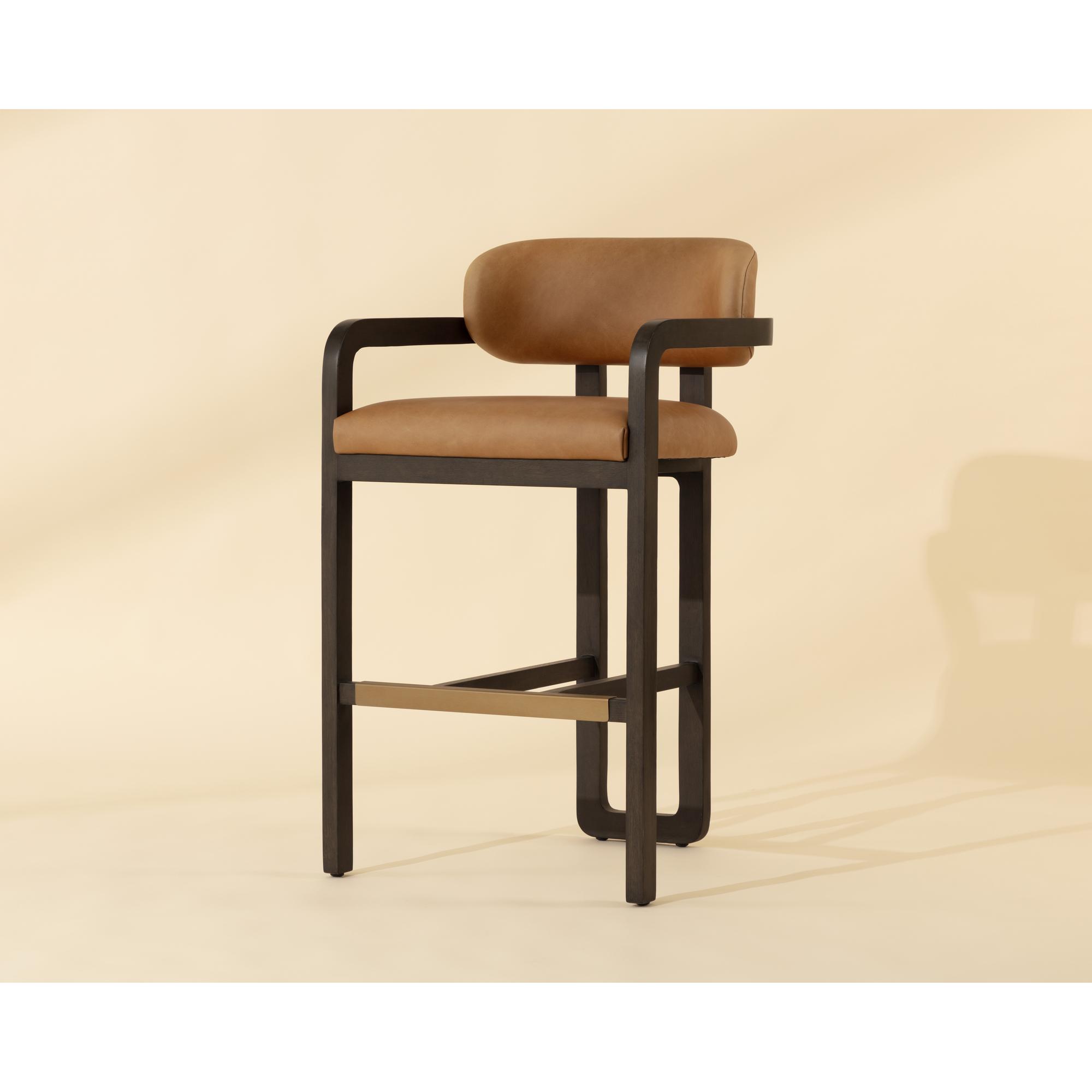 The eye-catching silhouette of the Madrone Barstool will stun from all angles. The curved lines of the three-legged brown oak wood frame lend a statuesque presence to any room. The low back seat is upholstered in ludlow sesame leather for luxurious comfort.