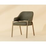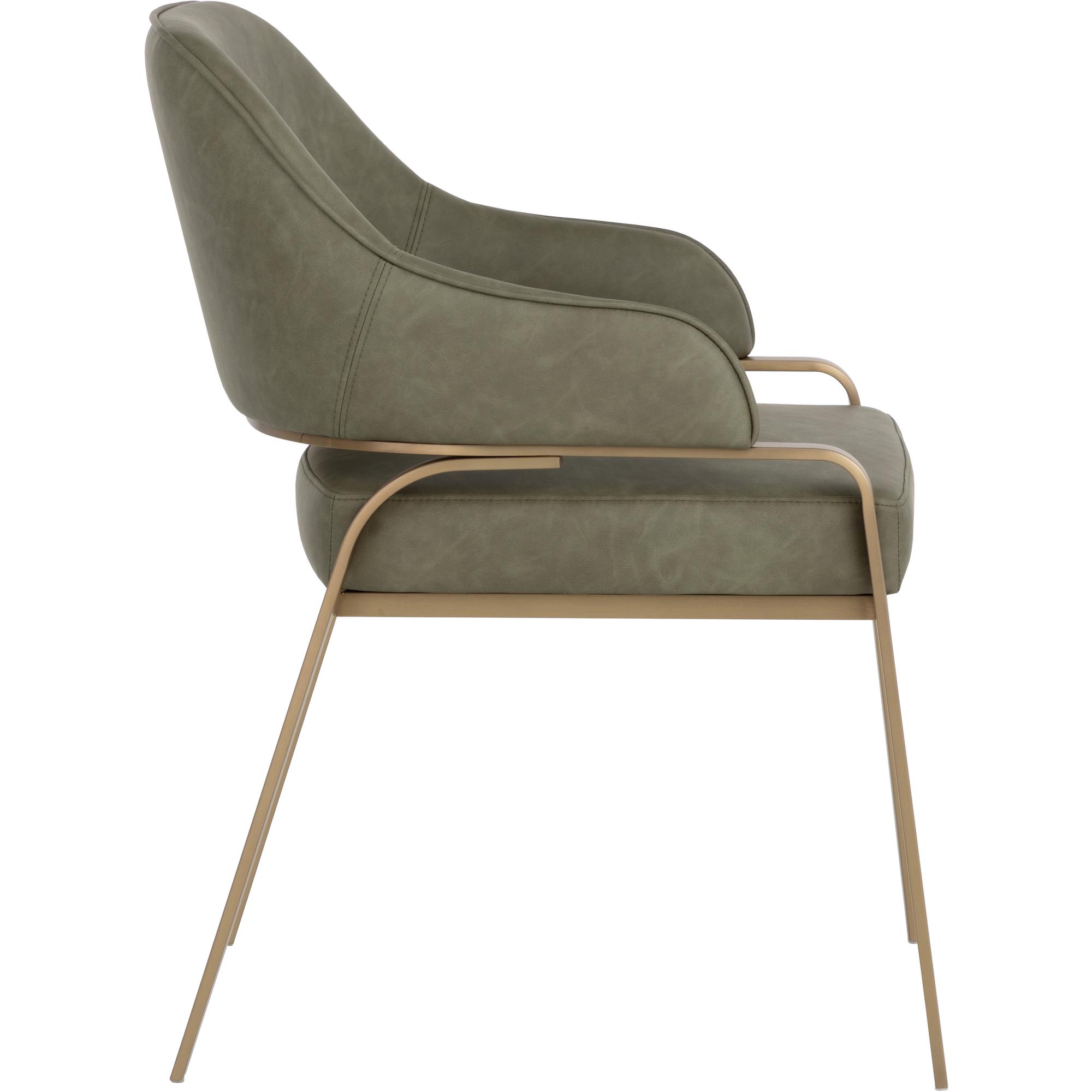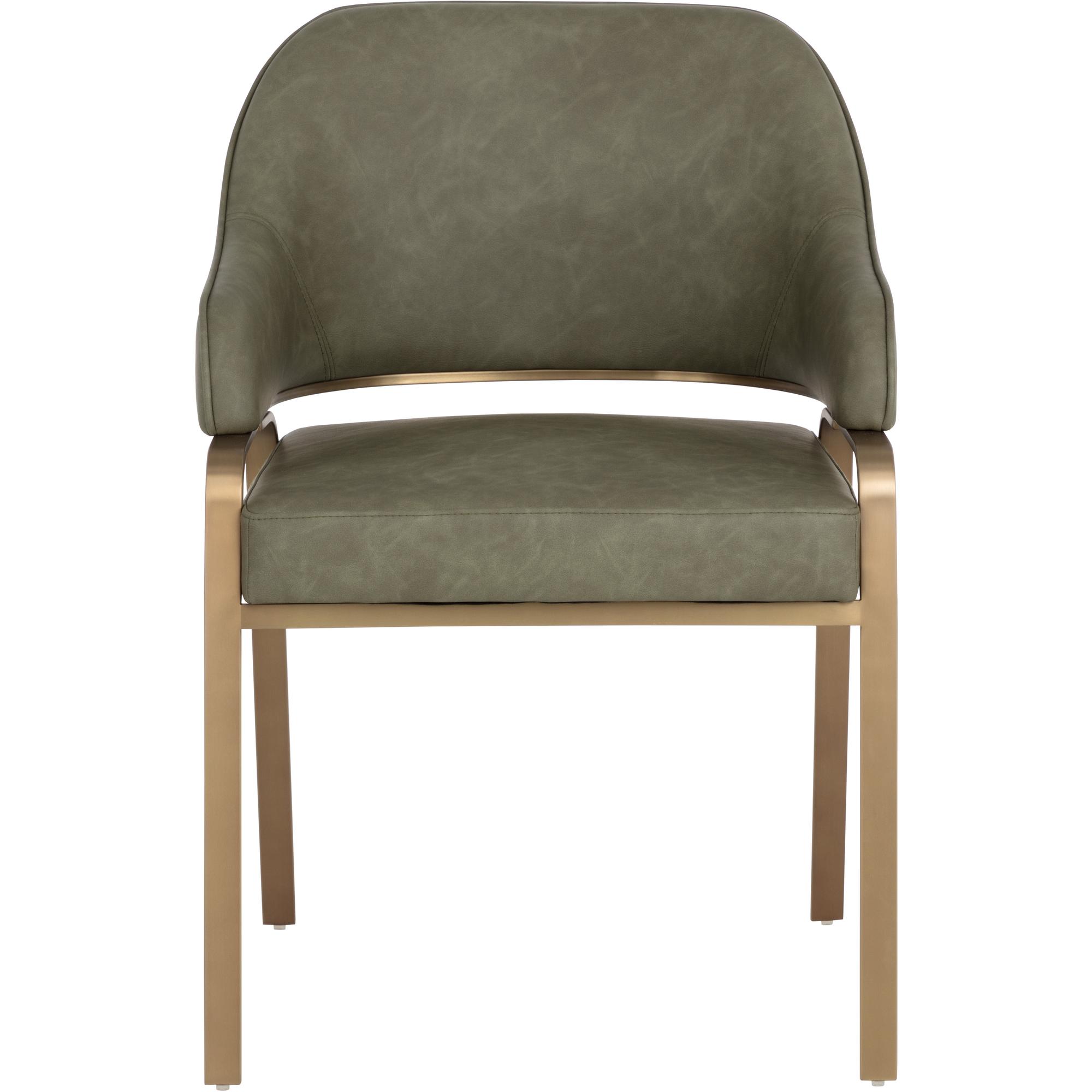With a curved back and sleek gold stainless steel base, the Malachi Dining Armchair brings an air of modern elegance to any dining room. Upholstered in ivanhoe pine faux leather for durability and comfort.