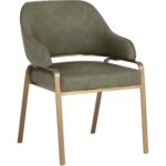 With a curved back and sleek gold stainless steel base, the Malachi Dining Armchair brings an air of modern elegance to any dining room. Upholstered in milliken cognac faux leather for durability and comfort.