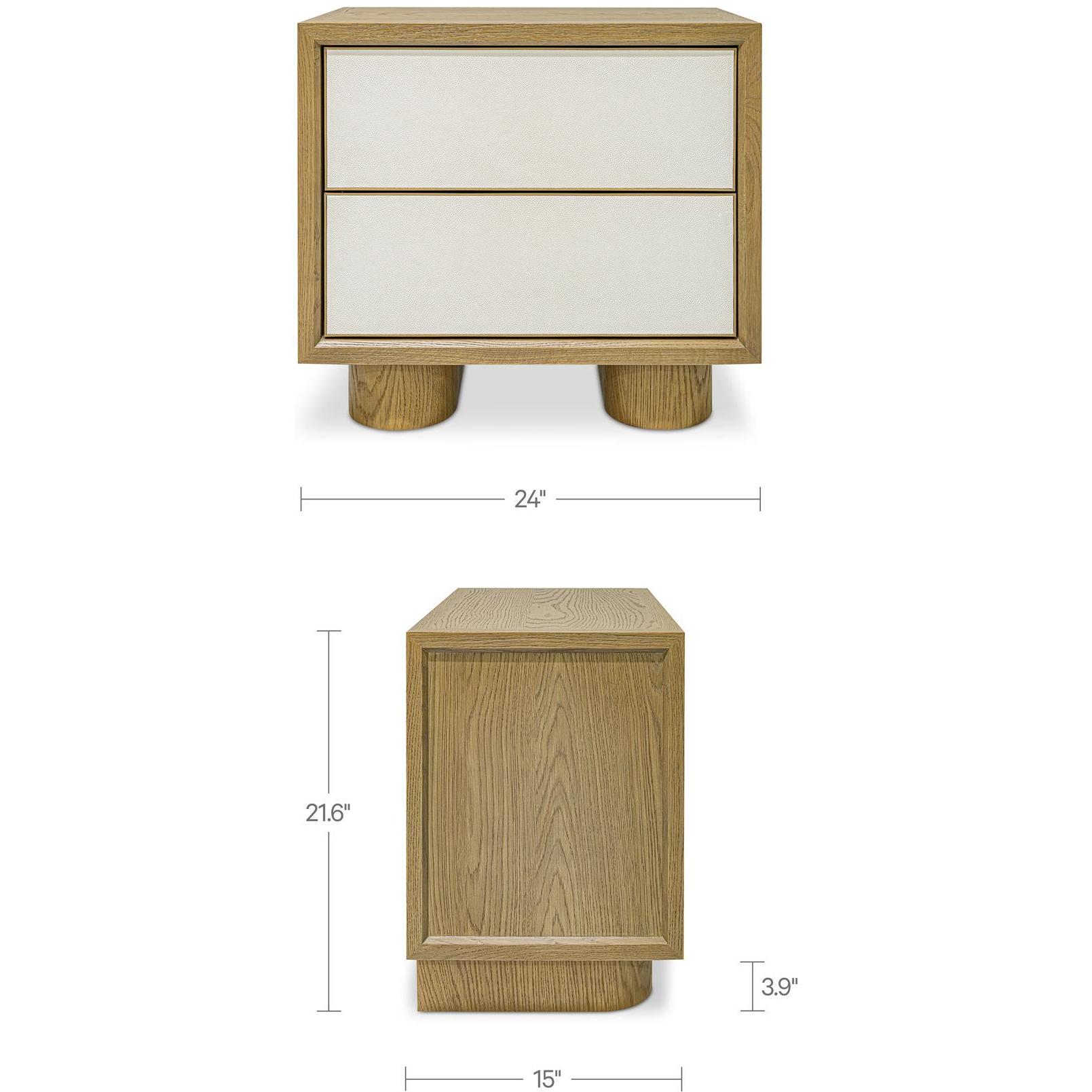 The Marcelle nightstand’s minimalist silhouette, enhanced by substantial legs, strikes a balance between sophistication and subtle playfulness. A showcase of craftsmanship, it features crafted wire-brushed oak and a shagreen door front framed by antique gold metal.