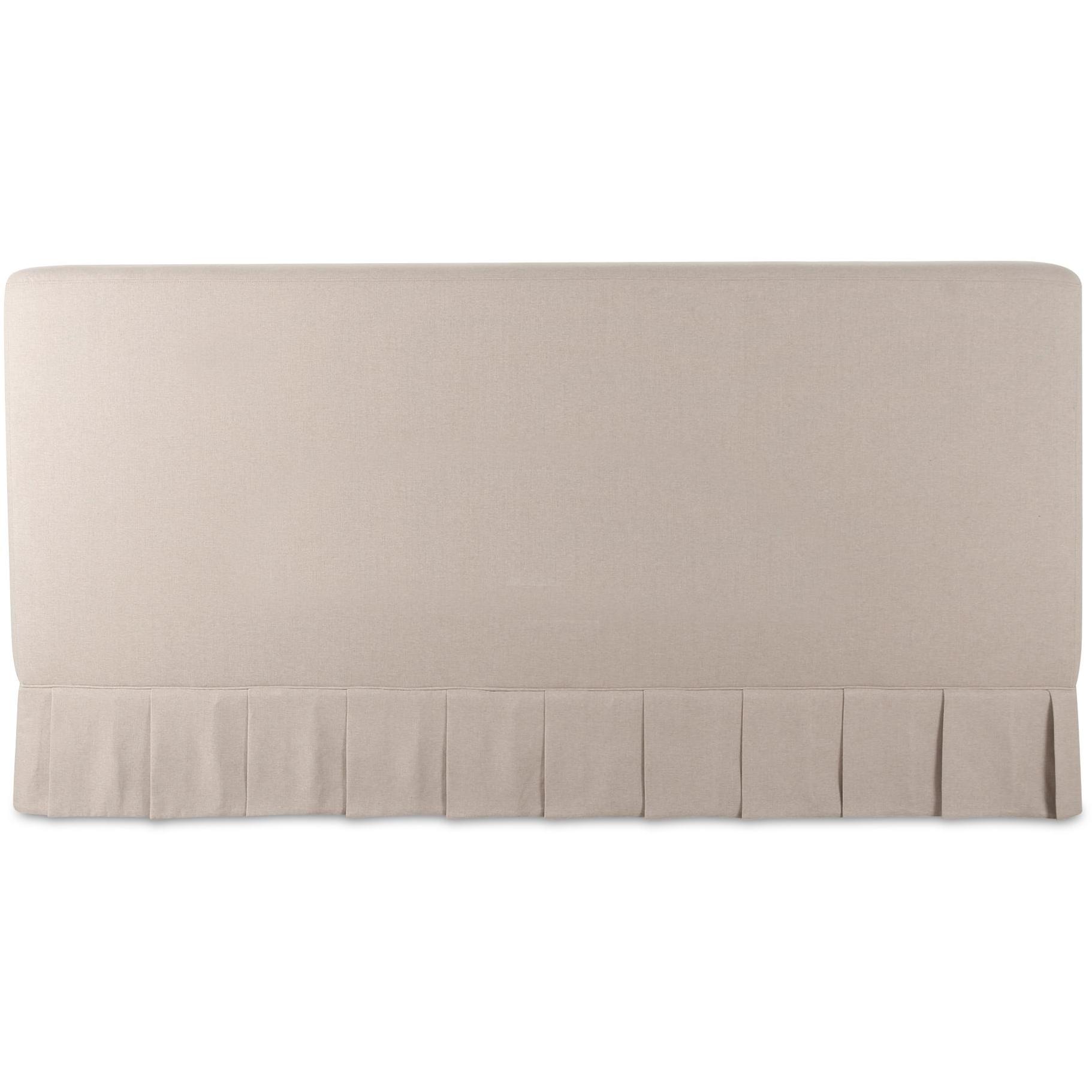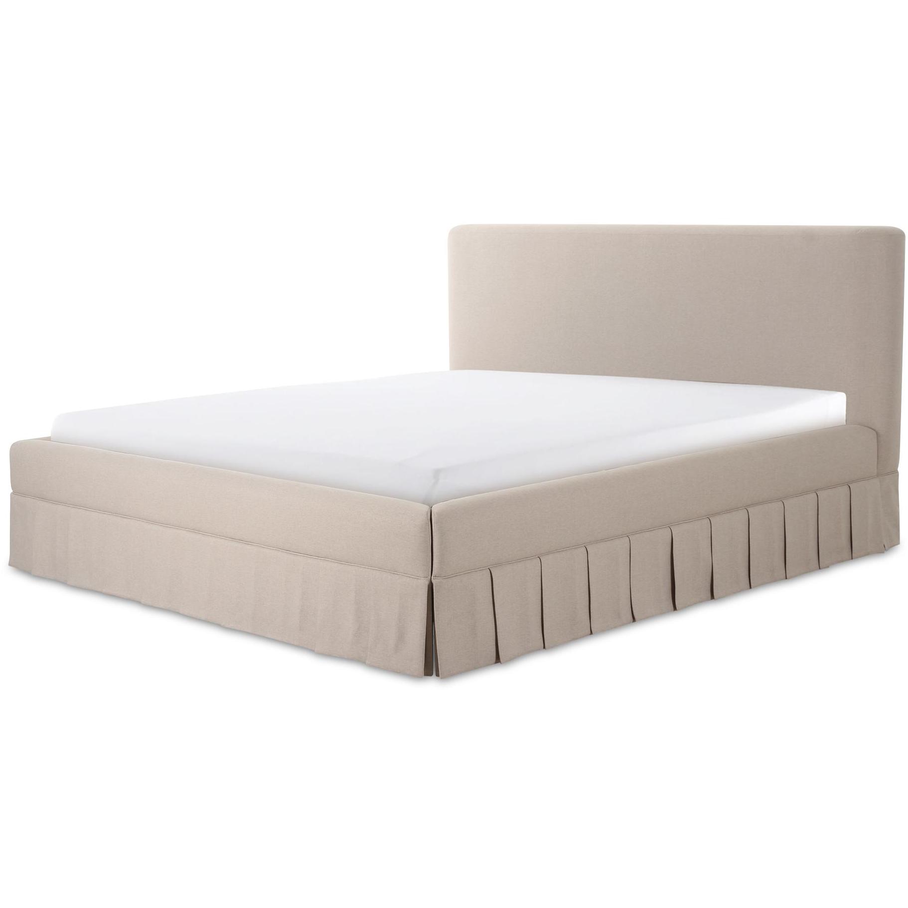The Maren king bed exudes a soft, feminine aesthetic, upholstered in a warm, neutral fabric and featuring a playful yet refined box pleat base reminiscent of vintage finesse, straddling the line between contemporary form and traditional finish. With smoothly rounded corners and graceful, curving forms adding softness to the design, this piece is a study in elegance and subtlety.