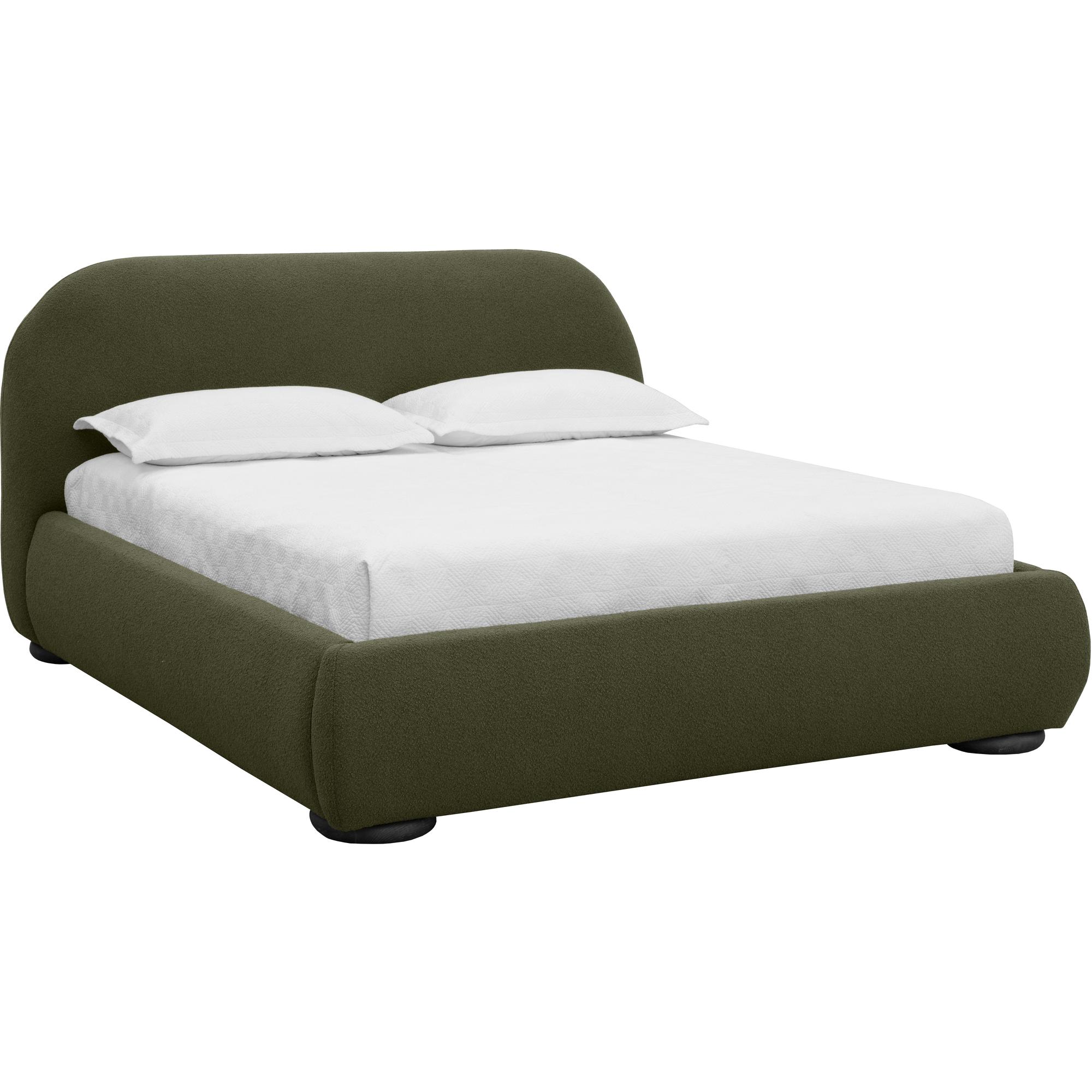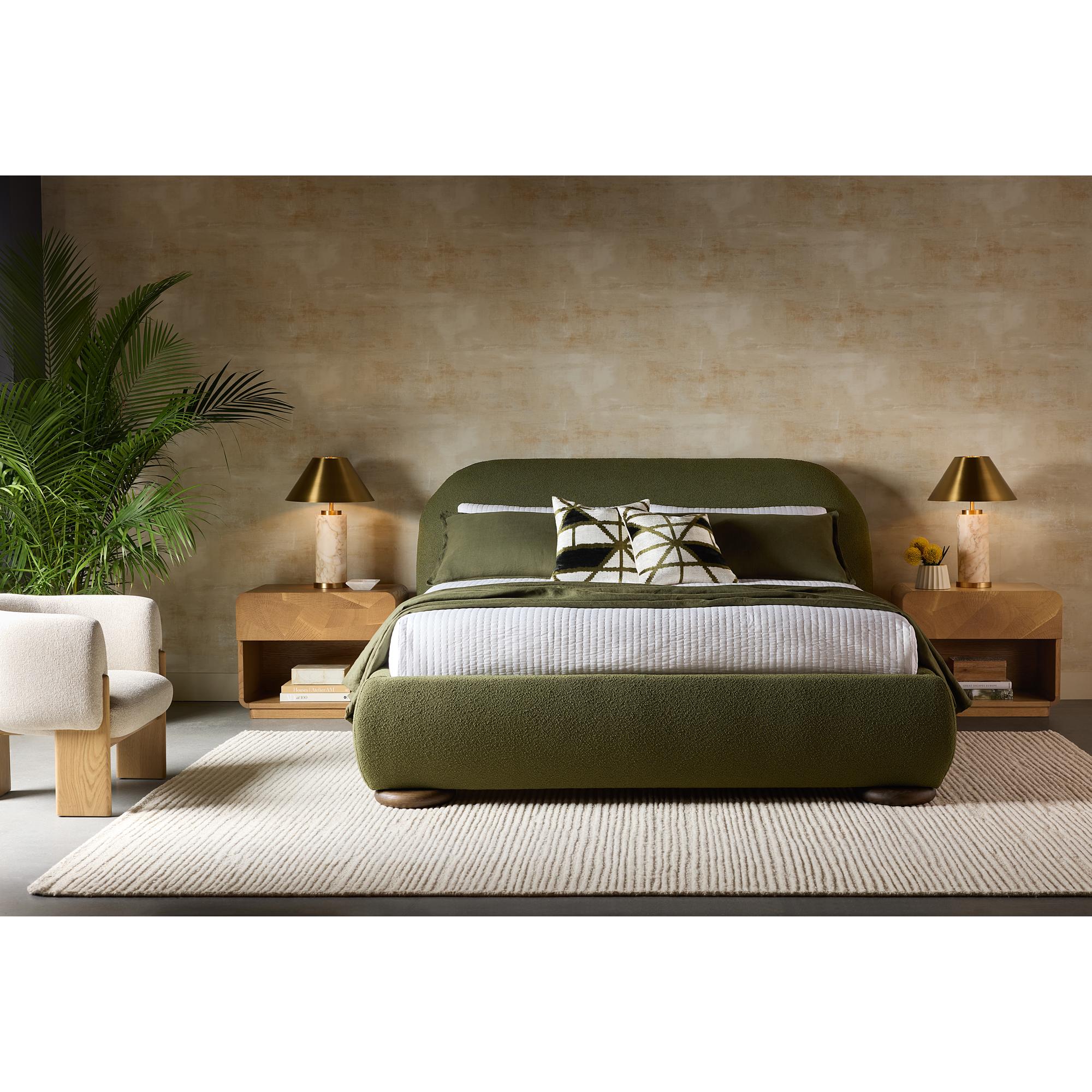 A visual embodiment of softness, the Marin Bed brings mesmerizing curves to the bedroom. Smooth to the touch with a well-padded headboard, this alluring bed is upholstered in textured copenhagen olive fabric with a low profile elevated on round solid oak wood legs.