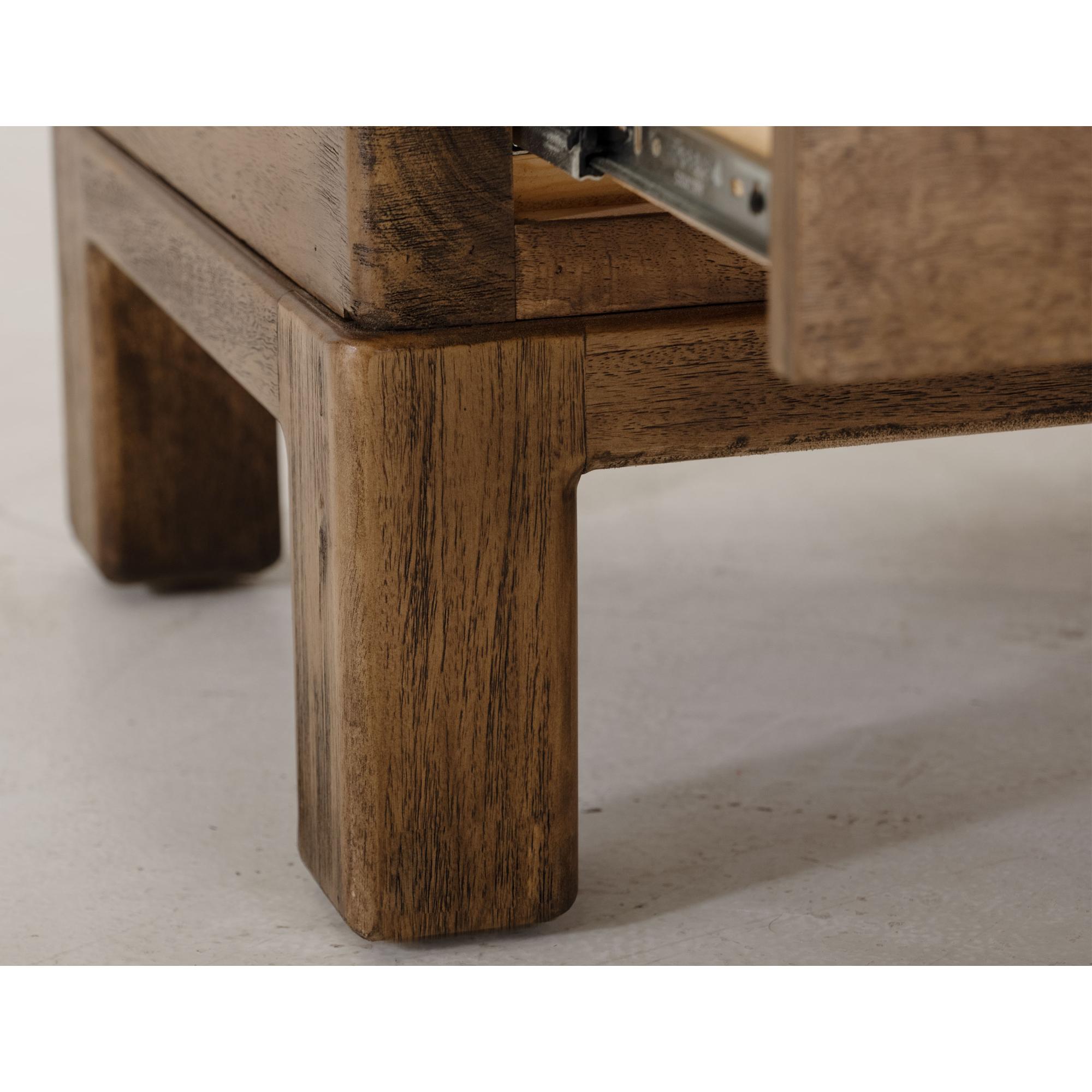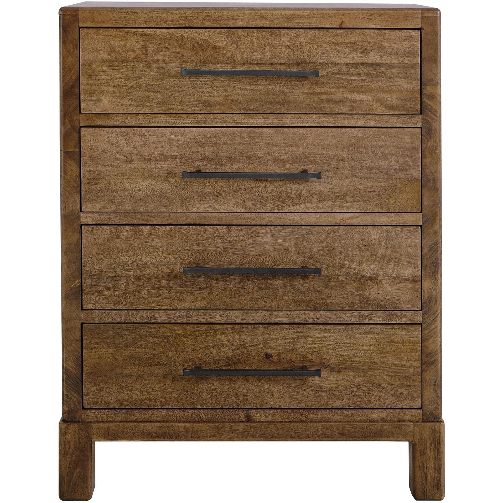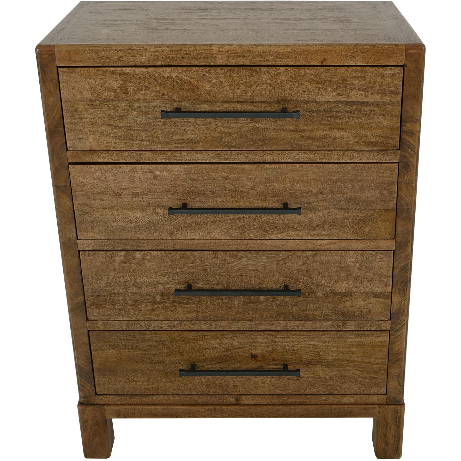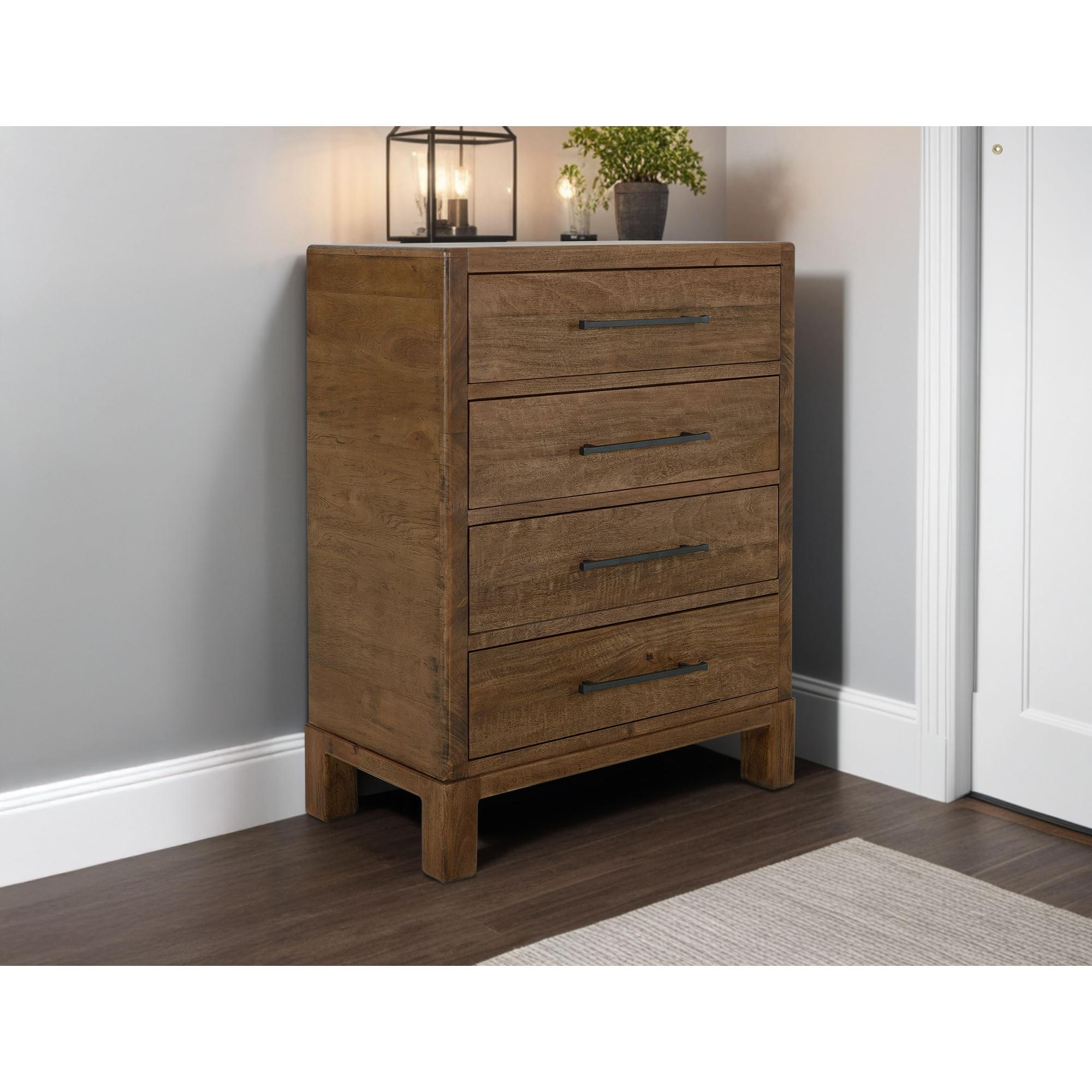 The Merida Collection features an exquisite bedroom set that perfectly fuses sustainability and design, embodying eclectic modern style. Made from environmentally friendly mango and melina wood, it combines beauty and functionality to enhance your space. The brown finish highlights the natural elegance of the wood, creating a serene and inviting atmosphere. The chest features a minimalist design characterized by clean lines and a rectangular shape; it not only offers practical storage solutions but also enhances the aesthetic appeal of your bedroom with its timeless charm. The chest stands on four sturdy legs, ensuring stability and durability. The Merida chest is a versatile addition that complements any bedroom décor.