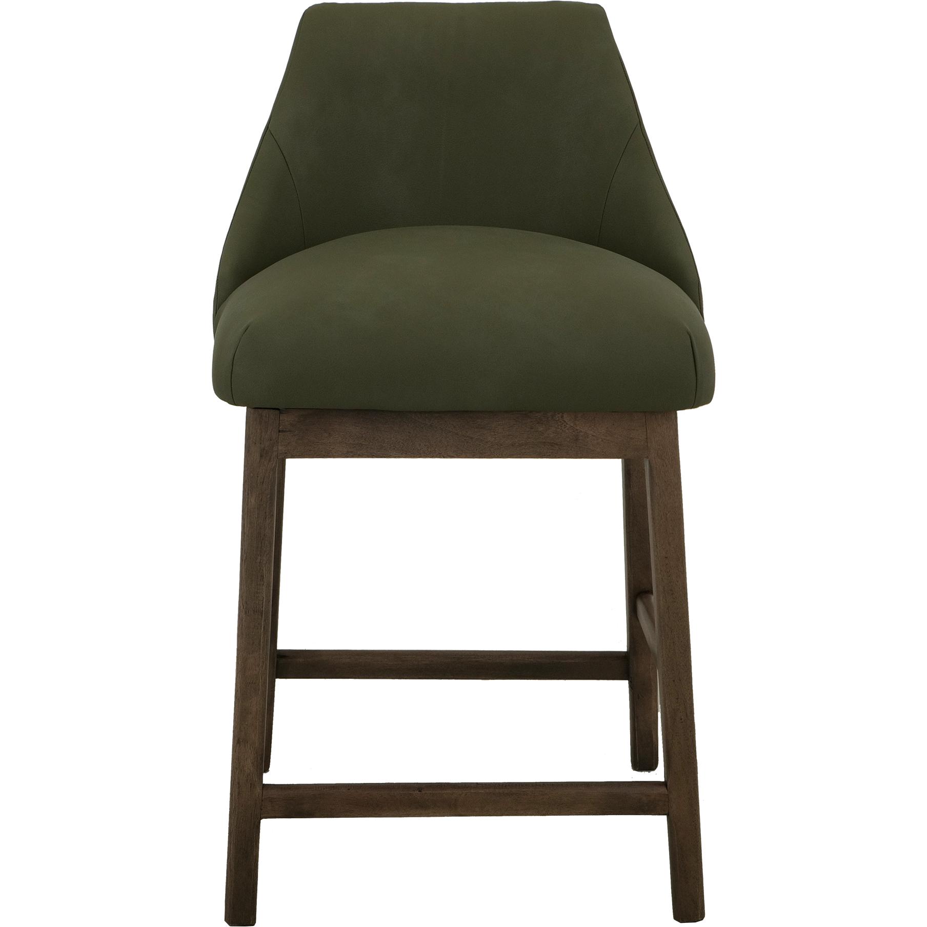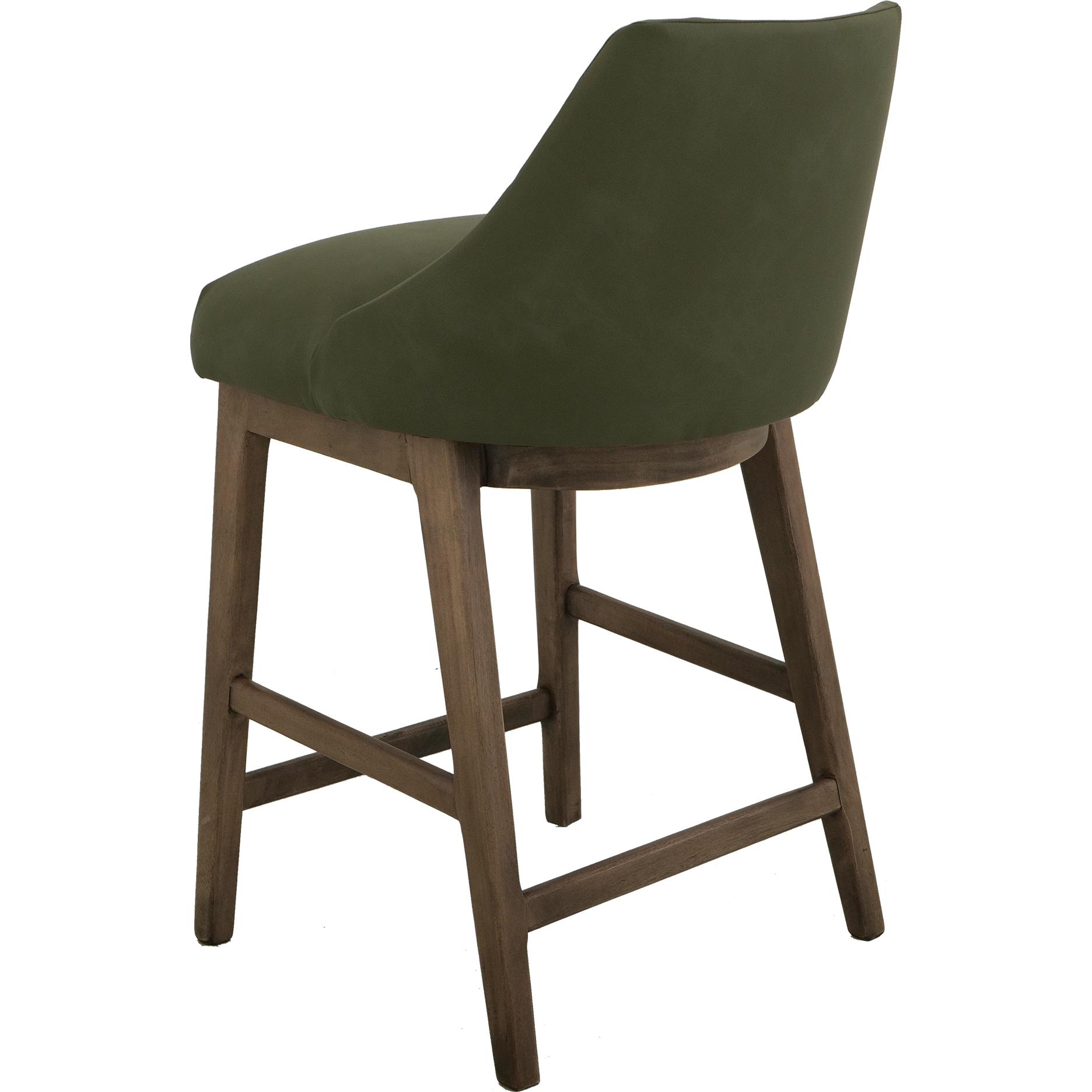 The Mezquite stool collection features a sleek, modern design that combines style and practicality. It has a sturdy wooden frame with a natural finish, giving it a warm and timeless appeal. The seat and backrest are upholstered in a green leather-like material, adding softness and comfort. The design includes clean lines, four tapered legs, and crossbars for enhanced stability, making it perfect for relaxed, modern-inspired interiors. This stool is ideal for use at bars, kitchen counters, or as casual seating.