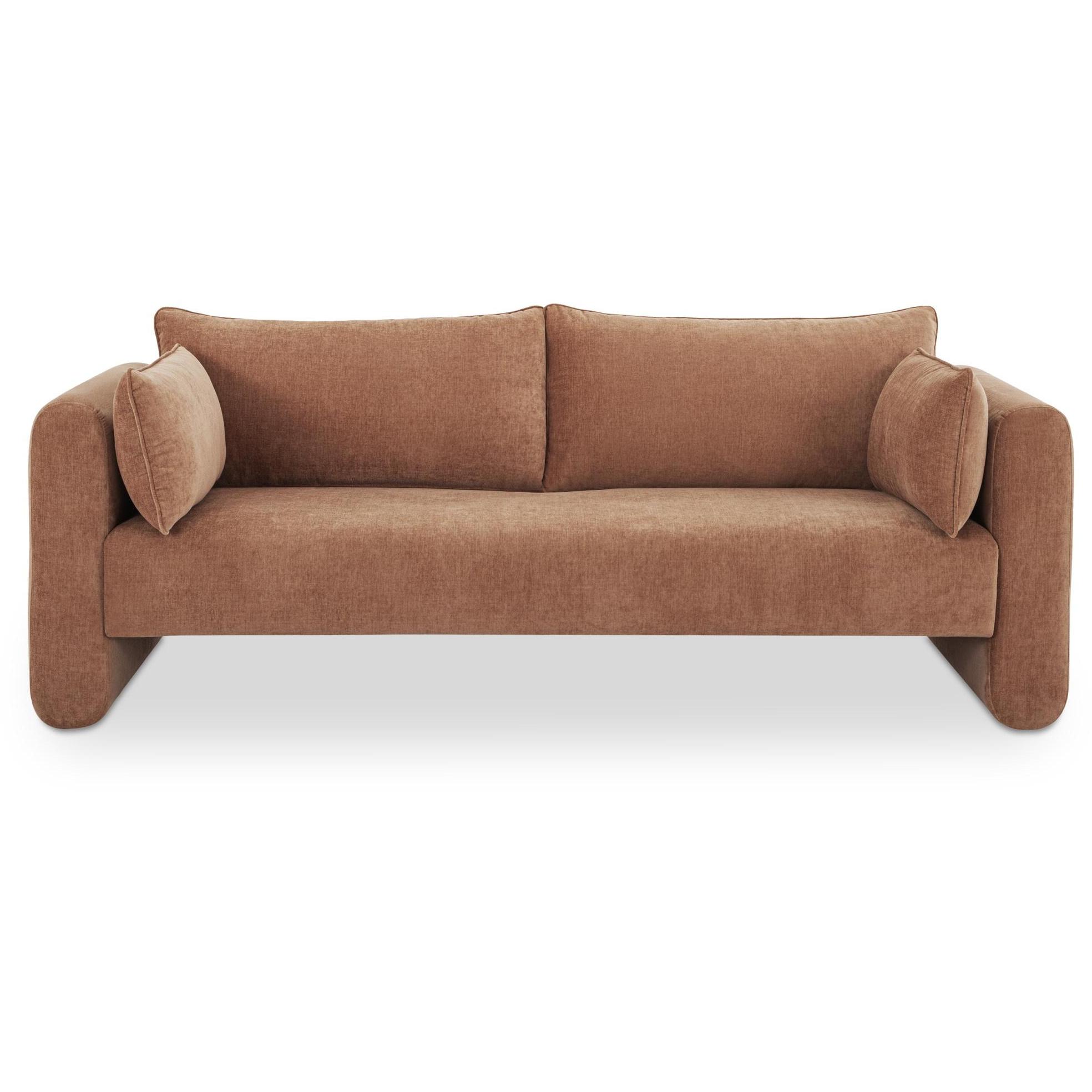 Smaller scale, bigger impact—the Moore Sofa is made for secondary spaces and apartments that deserve comfort. Curved arms and a raised seat keep the profile light, while wide arms and removable cushions make lounging easy. Upholstered in heritage pink polyester with a washed linen-like texture, it adds a sun-faded, nostalgic warmth. A fixed bench and supportive foam-and-fiber cushioning ensure Moore looks as good as it feels—day after day.