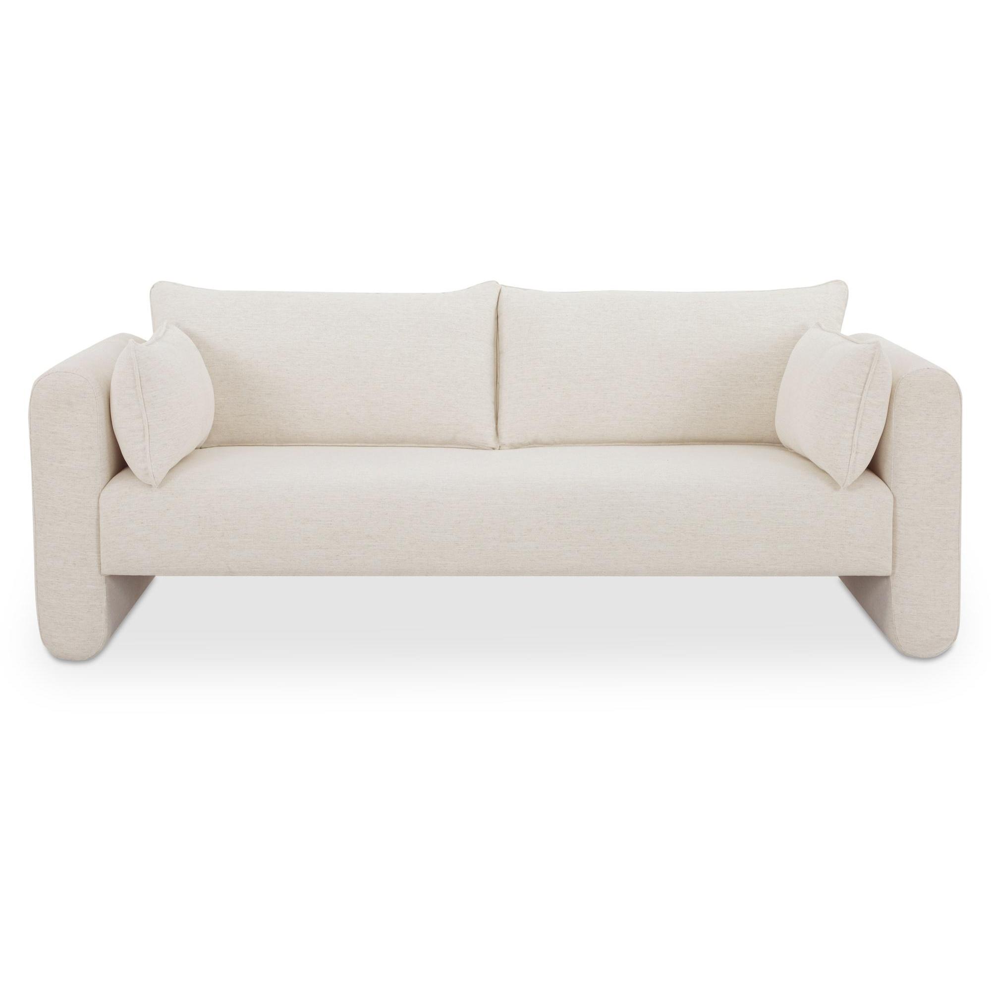 Smaller scale, bigger impact—the Moore Sofa is made for secondary spaces and apartments that deserve comfort. Curved arms and a raised seat keep the profile light, while wide arms and removable cushions make lounging easy. Upholstered in an oatmeal polyester-linen blend with subtle beige flecks, it mixes warmth with adaptability. A fixed bench and supportive foam-and-fiber cushioning ensure Moore looks as good as it feels—day after day.