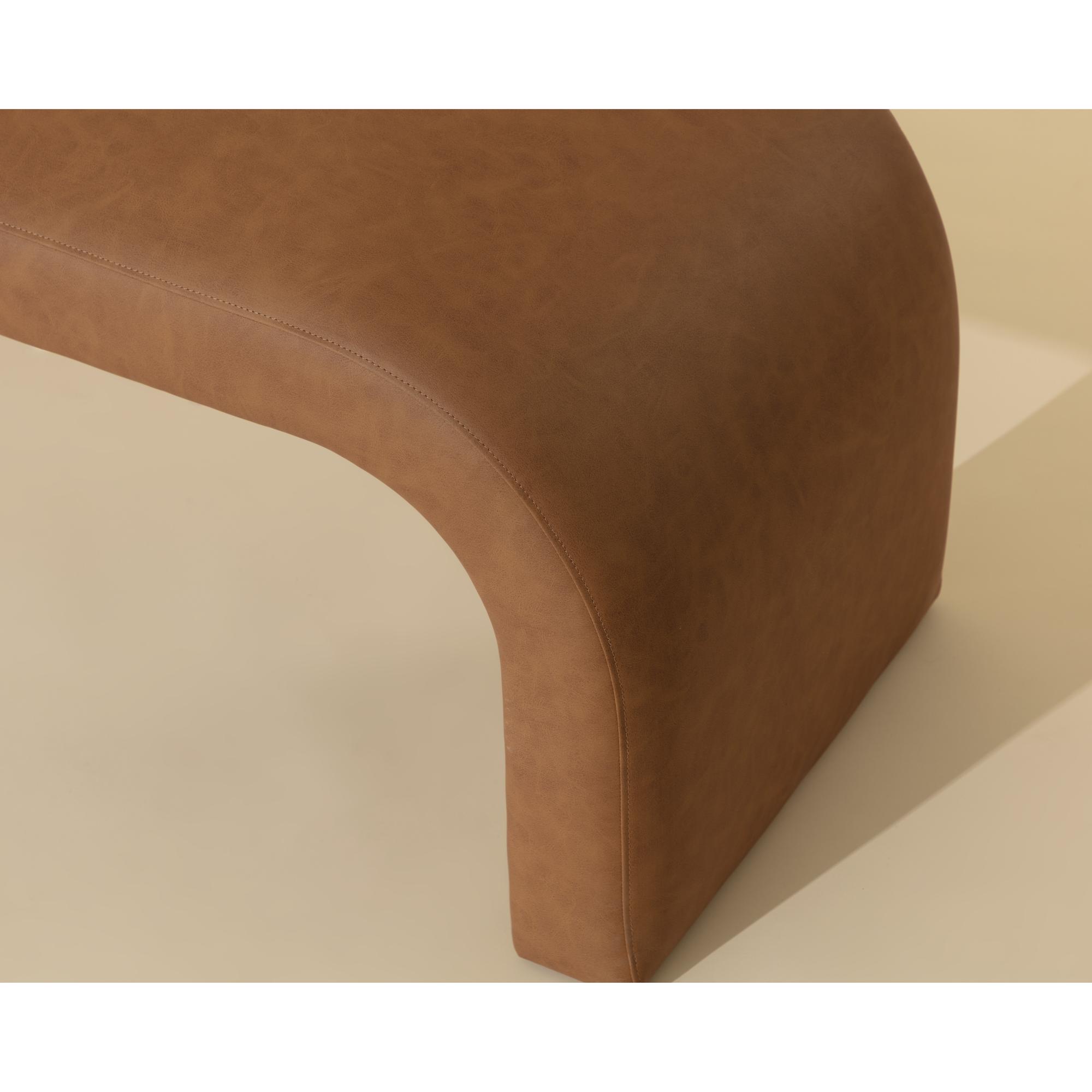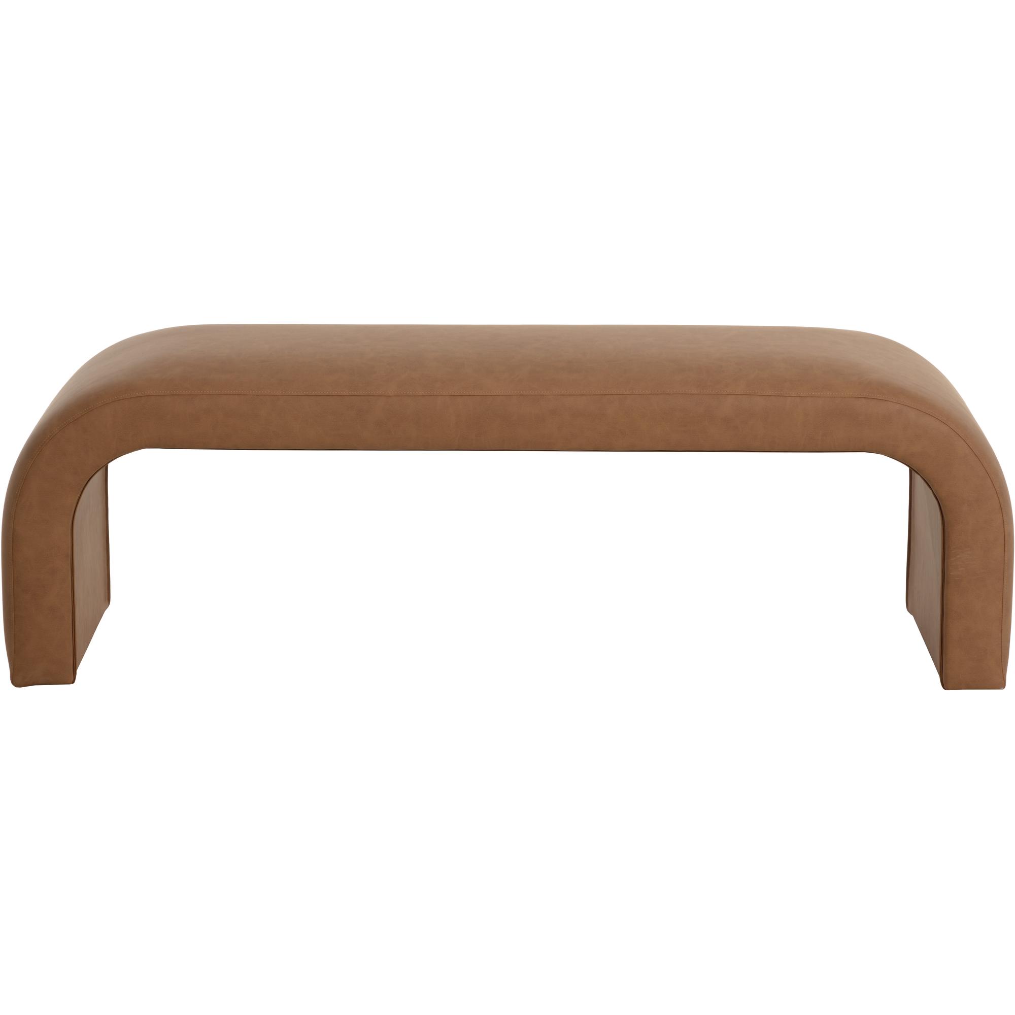 With an understated design, this arch shaped bench offers a contemporary style that will add dimension to any space. Stocked in smooth milliken cognac faux leather and completed with white plastic glides.