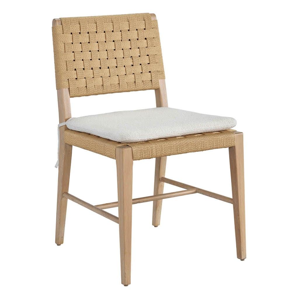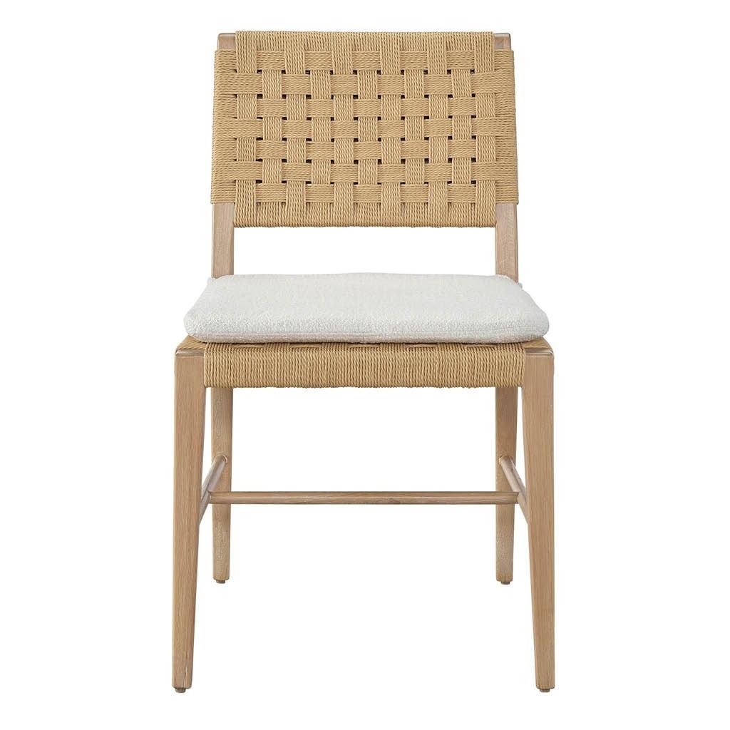 The lighthearted Woven Side Chair fuses a woven Danish cord back, oak-finished legs and a plush white seat cushion, making for a delightfully modern seat.