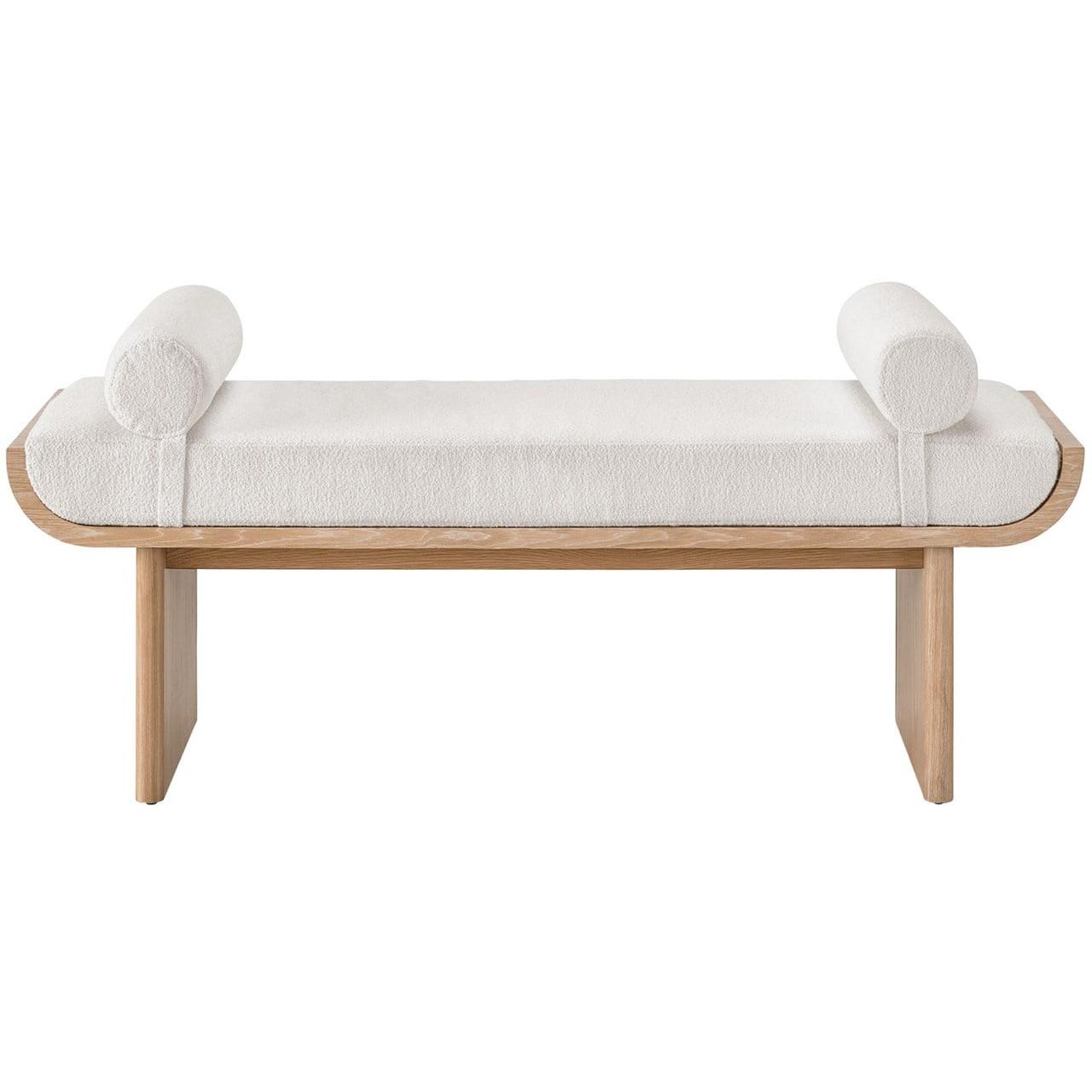 Artistic and appealing, the Bed Bench adds layers of texture and inspired aesthetic to any home space with an upholstered body, a fresh oak-finished frame and removable bolsters.